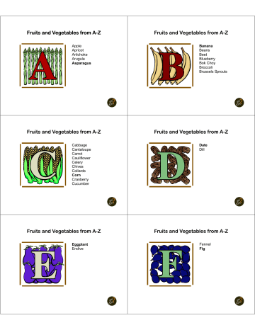 Fruits and Vegetables from A-Z Apple Apricot Artichoke Arugula Asparagus Fruits and Vegetables from A-Z Cabbage Cantaloupe Carrot Cauliflower Celery Chives Collards Corn Cranberry Cucumber Fruits and Vegetables from A-Z Eggplant Endive Fruits and Vegetables from A-Z Banana Beans Beet Blueberry Bok Choy Broccoli Brussels Sprouts Fruits and Vegetables from A-Z Date Dill Fruits and Vegetables from A-Z Fennel Fig Fruits and Vegetables from A-Z Garlic Ginger Gourds Grapes Fruits and Vegetables from A-Z Iceberg Lettuce Indian Corn Fruits and Vegetables from A-Z Kale Kiwi Kohlrabi Kumquat Fruits and Vegetables from A-Z Herbs Honeydew Horseradish Fruits and Vegetables from A-Z Jalapeno Jicama Fruits and Vegetables from A-Z Leek Lemon Lentils Lettuce Lime Fruits and Vegetables from A-Z Mango Melon Mulberry Mushroom Mustard Fruits and Vegetables from A-Z Okra Olive Onion Orange Fruits and Vegetables from A-Z Quince Fruits and Vegetables from A-Z Nectarines Fruits and Vegetables from A-Z Parsley Parsnip Peach Pear Peas Pepper Pineapple Plum Pomegranate Potato Pumpkin Fruits and Vegetables from A-Z Radish Raspberry Rhubarb Rutabaga Fruits and Vegetables from A-Z Shallot Soybeans Spinach Squash Star fruit Strawberry Swiss Chard Fruits and Vegetables from A-Z Ugli Fruit Fruits and Vegetables from A-Z Watermelon Fruits and Vegetables from A-Z Tomatillo Tomato Turnips Fruits and Vegetables from A-Z Vanilla Vegetables! Vidalia Onion Fruits and Vegetables from A-Z Xigua Fruits and Vegetables from A-Z Yams Fruits and Vegetables from A-Z Zucchini
