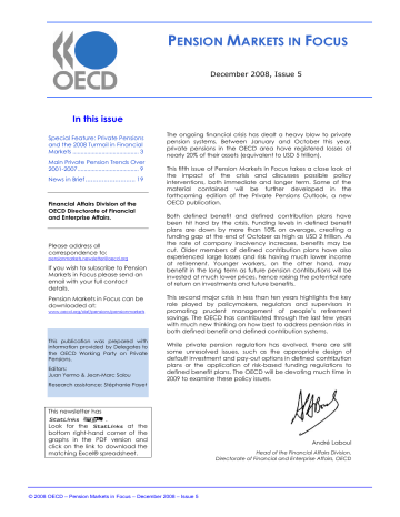 PENSION MARKETS IN FOCUS December 2008, Issue 5 In this issue Special Feature: Private Pensions and the 2008 Turmoil in Financial Markets ......................................... 3 Main Private Pension Trends Over 2001-2007 ...................................... 9 News in Brief ........................... 19 Financial Affairs Division of the OECD Directorate of Financial and Enterprise Affairs. Please address all correspondence to: [email protected] If you wish to subscribe to Pension Markets in Focus please send an email with your full contact details. Pension Markets in Focus can be downloaded at: www.oecd.org/daf/pensions/pensionmarkets This publication was prepared with information provided by Delegates to the OECD Working Party on Private Pensions. Editors: Juan Yermo & Jean-Marc Salou Research assistance: Stéphanie Payet The ongoing financial crisis has dealt a heavy blow to private pension systems. Between January and October this year, private pensions in the OECD area have registered losses of nearly 20% of their assets (equivalent to USD 5 trillion). This fifth issue of Pension Markets in Focus takes a close look at the impact of the crisis and discusses possible policy interventions, both immediate and longer term. Some of the material contained will be further developed in the forthcoming edition of the Private Pensions Outlook, a new OECD publication. Both defined benefit and defined contribution plans have been hit hard by the crisis. Funding levels in defined benefit plans are down by more than 10% on average, creating a funding gap at the end of October as high as USD 2 trillion. As the rate of company insolvency increases, benefits may be cut. Older members of defined contribution plans have also experienced large losses and risk having much lower income at retirement. Younger workers, on the other hand, may benefit in the long term as future pension contributions will be invested at much lower prices, hence raising the potential rate of return on investments and future benefits. This second major crisis in less than ten years highlights the key role played by policymakers, regulators and supervisors in promoting prudent management of people‟s retirement savings. The OECD has contributed through the last few years with much new thinking on how best to address pension risks in both defined benefit and defined contribution systems. While private pension regulation has evolved, there are still some unresolved issues, such as the appropriate design of default investment and pay-out options in defined contribution plans or the application of risk-based funding regulations to defined benefit plans. The OECD will be devoting much time in 2009 to examine these policy issues. This newsletter has 1s 2. Look for the 1s at the bottom right-hand corner of the graphs in the PDF version and click on the link to download the matching Excel® spreadsheet. © 2008 OECD – Pension Markets in Focus – December 2008 – Issue 5 André Laboul Head of the Financial Affairs Division, Directorate of Financial and Enterprise Affairs, OECD HIGHLIGHTS The financial turmoil which started with the subprime crisis in the United States in mid-2007 has dealt a heavy blow to private pension arrangements. By October 2008, the total assets of all pension funds in the OECD had declined by about USD 3.3 trillion, or 20% relative to December 2007. Including other private pension assets, such as those held in Individual Retirement Accounts (IRAs) in the United States and similar personal pension plans in other countries, the loss increases to about USD 5 trillion. Although the short-term impact is evidently negative, pension funds, by their very nature, have to work with a long time horizon and their performance should also be evaluated on this basis. If one looks at returns over the last fifteen years – up to October 2008 - a positive picture still emerges. For example, the average, annual real rate of return of pension funds was 8.5% in Sweden, and 6.1% in the United-States and the United Kingdom over this period. What are the main implications of the financial crisis for people’s retirement savings? For people paying into defined contribution pension funds, the impact of the crisis depends critically on the fund’s asset allocation and the member’s age. Older workers with high equity exposures are the most affected. Younger workers, on the other hand, may benefit from the higher potential investment returns on future contributions. In defined benefit pension funds, benefits are linked to individual wages, so the main policy concern is worsening funding levels. Members of these plans risk having their pension benefits cut, which is most likely if the sponsoring company goes bankrupt. What are the possible policy reactions to the financial turmoil? 2 To keep up with their pension funding requirements after disappointing investment returns, many companies may be forced to increase their contributions to defined benefit pension funds, which were already quite high as a result of recovery plans implemented after the 2000-02 stock market declines. Some regulators are considering giving pension funds and their sponsoring employers more time to allow funding levels to return to target levels in order to avoid further strain on employers when the general economic situation is deteriorating. For defined contribution plans, there is going to be greater policy focus on appropriate default mechanisms and the design of “autopilot” funds (such as targetdate or lifestyle funds) that shift towards lower risk investments as retirement date approaches without the member having to intervene. Finally, in the context of the financial crisis and the rapid growth of defined contribution plans, effective financial education programmes and information disclosure have become more important to the well-functioning of the private pension system. © 2008 OECD – Pension Markets in Focus – December 2008 – Issue 5 SP