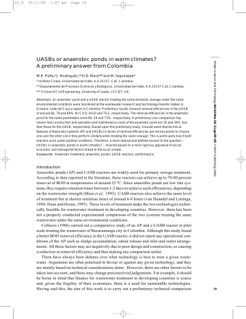 Z1.9 26/11/00 1:07 pm Page 59 M.R. Peña,* J. Rodriguéz,** D.D. Mara*** and M. Sepulveda* * Instituto Cinara, Universidad del Valle, A.A 25157, Cali, Colombia. ** Departamento de Procesos Químicos y Biológicos, Universidad del Valle, A.A 25157 Cali, Colombia. *** School of Civil Engineering, University of Leeds, LS2 9JT, UK. Abstract An anaerobic pond and a UASB reactor treating the same domestic sewage under the same environmental conditions were monitored at the wastewater research and technology transfer station in Ginebra, Valle del Cauca region in Colombia. Preliminary results showed removal efficiencies in the UASB of around 66, 78 and 69% for COD, BOD and TSS, respectively. The removal efficiencies in the anaerobic pond for the same parameters were 68, 59 and 73%, respectively. A preliminary cost comparison has shown that construction and operation and maintenance costs of the anaerobic pond are 16 and 38% less than those for the UASB, respectively. Based upon this preliminary study, it would seem that technical features of these two systems (AP and UASBs) in terms of removal efficiencies are not key points to choose one over the other since they perform similarly when treating the same sewage. This is particularly true if both reactors work under optimal conditions. Therefore, a more rational and definite answer to the question – UASBs or anaerobic ponds in warm climates? – must be based on a more rigorous appraisal of social, economic and managerial factors linked to the local context. Keywords Anaerobic treatment; anaerobic ponds; UASB reactors; performance Introduction Anaerobic ponds (AP) and UASB reactors are widely used for primary sewage treatment. According to data reported in the literature, these reactors can achieve up to 70-80 percent removal of BOD at temperatures of around 25 ºC. Since anaerobic ponds are low rate systems, they require retention times between 1-2 days to achieve such efficiencies, depending on the wastewater strength (Mara et al., 1992). UASB reactors also achieve the same level of treatment but at shorter retention times of around 6-8 hours (van Haandel and Lettinga, 1994; Dean and Horan, 1995). These levels of treatment make the two technologies technically feasible for wastewater treatment in developing countries. However, there has been not a properly conducted experimental comparison of the two systems treating the same wastewater under the same environmental conditions. Collazos (1986) carried out a comparative study of an AP and a UASB reactor at pilot scale treating the wastewater of Bucaramanga city in Colombia. Although this study found a better BOD removal efficiency in the UASB reactor, it did not report any operational conditions of the AP such as sludge accumulation, odour release and inlet and outlet arrangements. All these factors may act negatively due to poor design and construction, so causing a reduction in removal efficiency and thus making any comparison unfair. There have always been debates over what technology is best to treat a given wastewater. Arguments are often polarised in favour or against any given technology, and they are mainly based on technical considerations alone. However, there are other factors to be taken into account, and these may change preconceived judgements. For example, it should be borne in mind that finance for wastewater treatment in developing countries is scarce and, given the fragility of their economies, there is a need for sustainable technologies. Having said this, the aim of this work is to carry out a preliminary technical comparison Water Science and Technology Vol 42 Nos 10–11 pp 59–65 © IWA Publishing 2000 UASBs or anaerobic ponds in warm climates? A preliminary answer from Colombia 59 Z1.9 26/11/00 1:07 pm Page 60 M.R. Peña et al. Figure 1 Reactor layout and sampling point location between a UASB and an AP treating the same wastewater under the same environmental conditions. A preliminary cost comparison of the two systems is also presented. Materials and methods This study was carried out in the town of Ginebra (9000 p.e.) in Valle del Cauca region in southwest Colombia. The weather is tropical with an average temperature of 25ºC throughout the year. The main economic activities are agriculture followed by tourism. At the town’s wastewater treatment plant (a 2-day anaerobic pond followed by a 5-day facultative pond) there is a wastewater research and technology transfer station for wastewater treatment and reuse in small and medium-sized towns. This belongs to Aquavalle, the regional water company, and it is being developed in partnership with Instituto Cinara at the Universidad del Valle in Cali. The research station comprises six wastewater treatment technologies. The UASB and the pond complex are full-scale systems. The other alternatives are pilot-scale units such as RBC, duckweed ponds, a Japanese package plant and an integrated system with a septic tank, anaerobic filter and hydroponic gravel beds. The influent wastewater, after conventional preliminary treatment, is pumped to a flow splitting chamber from which all the systems are fed. The results presented here were obtained from the anaerobic pond (AP) and the UASB reactor treating purely domestic sewage. Figure 1 shows the reactor layout together with the location of the sampling points. With the UASB, flow readings were taken every hour during each 24-hour sampling period from a calibrated V-notch, and 24-hour composite samples (aliquots taken every hour) were taken from the influent and effluent twice per week. With the AP, flow readings were taken hourly every sampling day from 0600 to 2000 h also by a calibrated V-notch; Table 1 Operational parameters of the reactors. Reactor UASB Anaerobic pond 60 Operational parameters Qay HRT H Vt COV Solids load (l/s) (h) (m) (m3) (kg COD/m3d) (kg TSS/m3d) 10.0 10.0 7.0 48.0 4.3 4.0 277.8 3437 1.80 0.26 0.75 0.11 Z1.9 26/11/00 1:07 pm Page 61 Table 2 Raw sewage charac