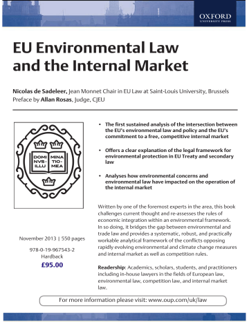1 EU Environmental Law and the Internal Market Nicolas de Sadeleer, Jean Monnet Chair in EU Law at Saint-Louis University, Brussels Preface by Allan Rosas, Judge, CJEU • The first sustained analysis of the intersection between the EU’s environmental law and policy and the EU’s commitment to a free, competitive internal market • Offers a clear explanation of the legal framework for environmental protection in EU Treaty and secondary law • Analyses how environmental concerns and environmental law have impacted on the operation of the internal market November 2013 | 550 pages 978-0-19-967543-2 Hardback £95.00 Written by one of the foremost experts in the area, this book challenges current thought and re-assesses the rules of economic integration within an environmental framework. In so doing, it bridges the gap between environmental and trade law and provides a systematic, robust, and practically workable analytical framework of the conflicts opposing rapidly evolving environmental and climate change measures and internal market as well as competition rules. Readership: Academics, scholars, students, and practitioners including in-house lawyers in the fields of European law, environmental law, competition law, and internal market law. For more information please visit: www.oup.com/uk/law Table of Contents General Introduction Part I: Introduction to EU Environmental Law Introduction 1: Environmental Objectives, Principles, and Criteria of the Environmental Policy in the TEU and TFEU 2: The Right to Environmental Protection in Treaty Law, in the ECHR, and in the EUCFR 3: Competences, Powers, and Legal Bases 4: General Overview of EU Secondary Environmental Law Conclusions Part II: The Respect of Treaty Provisions on Free Movement of Goods, Services, and Establishment Introduction 5: Free Movement of Goods and the Environment 6: Freedom of Establishment, Free Movement of Services, and the Environment 7: National Provisions Derogating from Secondary Law Conclusions Part III: Competition Law and Environment Introduction 8: The Concepts of Undertakings and the Relevant Market in Light of Environmental Considerations 9: Article 101 TFEU 10: Article 102 TFEU 11: Environmental Regulation and EU Competition Law 12: State Aids and Environmental Protection Conclusions General Conclusion How to Order Online: www.oup.com/uk/law • Save on postage & packing when you order online (UK-based orders only) : FREE P&P on orders of £20 (€24.55) Standard charges - UK: £3 (€3.68) per order; Europe: £6 (€7.36) per order; Rest of World: £9 (€11.05) per order Phone: +44 (0)1536 452640 VAT is payable by UK-based customers on online and journal products, and by customers based outside the UK on all products. VAT is applied at the relevant local rate. If you are exempt from VAT, or have a VAT registration number, please state this during the order process.