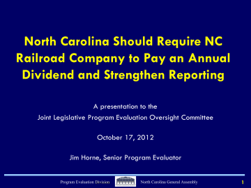 North Carolina Should Require NC Railroad Company to Pay an Annual Dividend and Strengthen Reporting A presentation to the Joint Legislative Program Evaluation Oversight Committee October 17, 2012 Jim Horne, Senior Program Evaluator Program Evaluation Division North Carolina General Assembly 1 Handouts The Full Report Today’s Slides Two Double-sided Handouts Program Evaluation Division North Carolina General Assembly 2 Evaluation Team Jim Horne, Evaluation Lead Michelle Beck, Senior Evaluator Jeff Grimes, Evaluator Carol Shaw, Principal Evaluator Pamela Taylor, Statistician Contributions by Ryan Blackledge, Bill Drafting Program Evaluation Division North Carolina General Assembly 3 Our Charge • Session Law 2011-145 as amended • Review corporation’s mission, economic development benefits, tangible and intangible value, governance • Whether NCRR should be sold, transferred under the Department of Transportation or another state agency, or maintain its corporate structure Report p. 2 Program Evaluation Division North Carolina General Assembly 4 Data Sources • Corporate financial data 1999-2011 • Railroad ownership in other states • Railroad inspection • Focus groups • Interviews Railroad Inspection Vehicle Report p. 2 Program Evaluation Division North Carolina General Assembly 5 Overview of Findings 1. NCRR’s unique relationship with the State contributes to NCRR’s financial health 2. NCRR owns railroad corridor and other assets, but determining its market value would require a professional business valuation 3. State has limited mechanisms for oversight of NCRR Program Evaluation Division North Carolina General Assembly 6 Overview of Findings 4. Changing NCRR’s corporate status has legal and financial implications 5. Selling NCRR may not be in best interest of North Carolina, but some non-corridor properties could be sold Program Evaluation Division North Carolina General Assembly 7 Overview of Recommendations 1. Amend General Statutes to strengthen NCRR’s reporting requirements 2. Direct NCRR to pay a one-time dividend of $15.5 million to the General Fund 3. Direct NCRR to pay an annual dividend of 25% of trackage rights agreement fee to the General Fund 4. Direct NCRR to convey 14 non-corridor properties to the State as a dividend Program Evaluation Division North Carolina General Assembly 8 Background North Carolina Railroad at Charlotte Program Evaluation Division North Carolina General Assembly 9 NCRR History • NCRR was incorporated in 1849 • State became sole shareholder in 1998 • NCRR owns railroad, but Norfolk Southern is exclusive freight operator • Railroad corridor also supports rail passenger operations Report pp. 3-9 Program Evaluation Division North Carolina General Assembly 10 NCRR Reported $20.7 Million in Total Income During 2011 Other 17% Interest 4% Other lease 11% Norfolk Southern trackage fee 68% Report p. 7 Program Evaluation Division North Carolina General Assembly 11 Findings NCRR Double-track in the Piedmont Program Evaluation Division North Carolina General Assembly 12 Finding 1. NCRR’s Unique Relationship with the State Contributes to NCRR’s Financial Health Source: Program Evaluation Division based on North Carolina General Statutes. North Carolina Railroad at Greensboro Program Evaluation Division North Carolina General Assembly 13 The State Is Sole Shareholder, but NCRR Remains a Private Company State is sole shareholder of North Carolina Railroad Company stock State of North Carolina Agencies of State Government Report p. 9 Program Evaluation Division North Carolina General Assembly 14 NCRR Benefits from Its Relationship with the State • NCRR received $196.3 million in capital contributions from the State since 1998 • Favorable tax status because NCRR is owned by the State • NCRR is both profitable and solvent Report pp. 10-11 Program Evaluation Division North Carolina General Assembly 15 NCRR Has Not Paid the State Any Dividends since 2006 • State law requires dividends must be used for capital improvements on the NC Railroad • Change in dividend use requires legislation • NCRR’s Board has chosen to invest most of company’s income in capital improvements • NCRR has accumulated over $65.2 million for future capital improvement projects Report p. 11 Program Evaluation Division North Carolina General Assembly 16 Finding 2. NCRR Owns Railroad Corridor and Other Assets, but Determining Market Value Would Require a Professional Business Valuation Trent River Bridge at New Bern Program Evaluation Division North Carolina General Assembly 17 NCRR Assets • Primary asset is the 317-mile corridor • Other assets of value includes 62 noncorridor properties • Another important asset is the trackage rights agreement with Norfolk Southern • Professional business valuation needed Report pp. 12-14 Program Evaluation Division North Carolina General Assembly 18 Finding 3. The State Currently Has Limited Mechanisms for Oversight of NCRR North Carolina Railroad east of Raleigh Program Evaluation Division North Carolina General Assembly 19 State’s Primary Method of Oversight Is Board Appointments Report p. 14 Program Evaluation Division North Carolina General Assembly 20 Additional Mechanisms of Oversight Are Limited • Minimal reporting requirements • NCRR not subject to same reporting requirements as public corporations • Since 2007, NCRR has not fully met all reporting requirements Report pp. 15-17 Program Evaluation Division North Carolina General Assembly 21 NCRR Is Not Required to Develop a Strategic Plan like State Agencies • NCRR has a mission statement and values statement but does not have strategic plan • NCRR lacks a formalized performance management system Report pp. 17-18 Program Evaluation Division North Carolina General Assembly 22 Finding 4. Changing the Corporate Status of NCRR Has Legal and Financial Implications Salisbury Station Program Evaluation Division North Carolina General Assemb