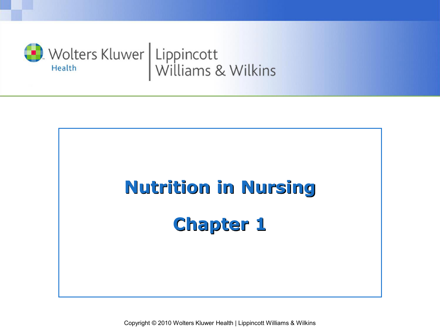 Nutrition in Nursing Chapter 1 Copyright © 2010 Wolters Kluwer Health | Lippincott Williams & Wilkins Nutritional Screening • Nutritional screen – Quick look at a few variables to judge a client’s relative risk for nutritional problems – No accepted universal tool – JCAHO mandates that screen must be done within 24 hours of admission to the hospital Copyright © 2010 Wolters Kluwer Health | Lippincott Williams & Wilkins Nutritional Screening (cont’d) • Comprehensive nutritional assessment – Moderate to high risk at screening referred to dietitian for assessment – Nutritional care process: 4 steps o Assessment o Nutritional diagnosis o Implementation o Monitoring and evaluation Copyright © 2010 Wolters Kluwer Health | Lippincott Williams & Wilkins Nutritional Screening (cont’d) • Comprehensive nutritional assessment (cont’d) – Different from nursing care plan o Dietitians can get most of information from nursing admission assessment o Dietitians interview patients and/or families to obtain a nutrition history – Helps to differentiate: o Nutrition problems caused by inadequate intake from those caused by illness or its treatments Copyright © 2010 Wolters Kluwer Health | Lippincott Williams & Wilkins Nutritional Screening (cont’d) • Comprehensive nutritional assessment (cont’d) – Dietitians o Calculate estimated calorie and protein requirements based on the assessment data o Determine nutritional diagnoses that define the nutritional problem, etiology, and signs and symptoms o May also determine the appropriate malnutrition diagnosis o Formulate nutrition interventions Copyright © 2010 Wolters Kluwer Health | Lippincott Williams & Wilkins Question • Nutritional screening helps to differentiate problems caused by inadequate intake from those that are caused by: a. Malnutrition b. Illness or its treatment c. Accident or injury d. Chronic diseases Copyright © 2010 Wolters Kluwer Health | Lippincott Williams & Wilkins Answer b. Illness or its treatment Rationale: A nutrition history can help differentiate nutrition problems caused by inadequate intake from those caused by illness or its treatments. Copyright © 2010 Wolters Kluwer Health | Lippincott Williams & Wilkins Integrating Nutrition • Assessment – Data classified as ABCD: o Anthropometric o Biochemical o Clinical o Dietary data – Client’s medical-psychosocial history is also evaluated for its impact on nutritional status Copyright © 2010 Wolters Kluwer Health | Lippincott Williams & Wilkins Integrating Nutrition (cont’d) • Anthropometric data – Physical measurements of the body – Body mass index o “Healthy” or “normal” BMI is defined as 18.5 to 24.9 o Above or below related to health risks – “Ideal” body weight – Edema or dehydration skews accurate weight measurements – Recent weight change Copyright © 2010 Wolters Kluwer Health | Lippincott Williams & Wilkins Integrating Nutrition (cont’d) • Biochemical data – No single test is both sensitive and specific for protein-calorie malnutrition – Biochemical data may help support the diagnosis of a nutritional problem Copyright © 2010 Wolters Kluwer Health | Lippincott Williams & Wilkins Integrating Nutrition (cont’d) • Albumin – Often used to assess protein status – Serum levels may be maintained until malnutrition is in a chronic stage – Low albumin may indirectly identify patients who may benefit from nutrition assessment and intervention • Prealbumin – Thyroxin-binding protein – More sensitive indicator of protein status – More expensive to measure Copyright © 2010 Wolters Kluwer Health | Lippincott Williams & Wilkins Integrating Nutrition (cont’d) • Clinical data – Physical signs and symptoms of malnutrition observed in the client – Most signs cannot be considered diagnostic – Physical signs and symptoms of malnutrition can vary in intensity among population groups because of genetic and environmental differences – Physical findings occur only with overt malnutrition Copyright © 2010 Wolters Kluwer Health | Lippincott Williams & Wilkins Integrating Nutrition (cont’d) • Dietary data – Nurse should ask, “Do you avoid any particular foods?” – Nurse should not ask, “Are you on a diet?” • Medical psychosocial history – May shed light on factors that influence intake, nutritional requirements, or nutrition counseling Copyright © 2010 Wolters Kluwer Health | Lippincott Williams & Wilkins Integrating Nutrition (cont’d) • Medication – Both prescription and over-the-counter drugs have the potential to affect and be affected by nutritional status – At greatest risk for development of drug-induced nutrient deficiencies include those who: o Habitually consume fewer calories and nutrients than they need o Have increased nutrient requirements including infants, adolescents, and pregnant and lactating women o Are elderly o Have chronic illnesses Copyright © 2010 Wolters Kluwer Health | Lippincott Williams & Wilkins Integrating Nutrition (cont’d) • At greatest risk for development of drug-induced nutrient deficiencies include those who (cont’d): – Take large numbers of drugs (five or more), whether prescription drugs, over-the-counter medications, or dietary supplements – Are receiving long-term drug therapy – Self-medicate – Are substance abusers Copyright © 2010 Wolters Kluwer Health | Lippincott Williams & Wilkins Integrating Nutrition (cont’d) • Nursing diagnosis – Provide written documentation of the client’s status – Serve as a framework for the plan of care that follows • Planning: client outcomes – Outcomes, or goals, should be measurable, attainable, specific, and client centered – Focus on the client, not the health care provider – Keep in mind that the goal for all clients is to consume adequate calories and protein using foods they like and tolerate as appropriate Copyright © 2010 Wolters Kluwer Health | Lippinc