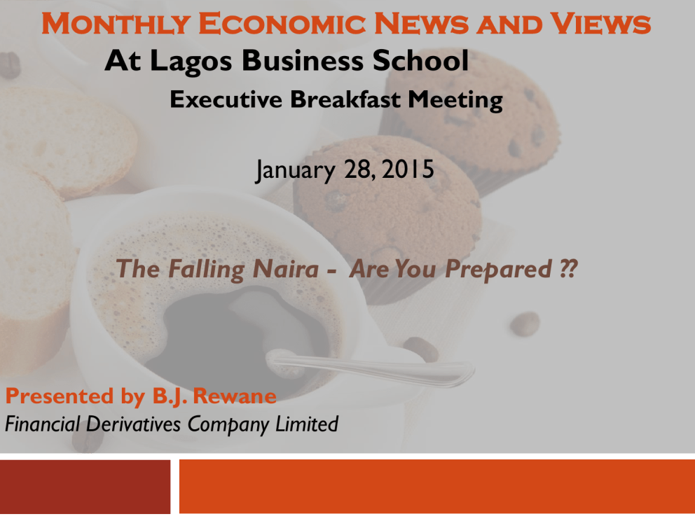 Monthly Economic News and Views At Lagos Business School Executive Breakfast Meeting January 28, 2015 The Falling Naira - Are You Prepared ?? Presented by B.J. Rewane Financial Derivatives Company Limited Outline - Catching a Falling Knife 2 December/January Highlights External Markets Domestic Economy Capital Markets Political Update Outlook for February Financial Derivatives Company Limited Global Economy - A Mixed Bag December/January Highlights 4 External- A Mixed Bag Oil price declined to $46.59pb A 5 ½ year low Cumulative 8 week drop of 35% December fall of 20.89% and January 14% The price plunge is accentuated by slowing demand and over supply OPEC reluctance to cut production is keeping prices close to the floor Financial Derivatives Company Limited December/January Highlights 5 Global GDP growth revised downwards to 3.5% from 3.8% Every $10 drop in oil price increases global GDP by 0.2% ($1.4trn) Shifting income from oil producers to consumers The consensus is that the floor price is $40pb Worldwide rig count is 3570 of which 100 are idle Idle rigs have increased from 70 to 100 since December Financial Derivatives Company Limited December/January Highlights 6 Active rigs in Nigeria down by 1 to 18 in December Global commodities index (BCOM) down by 19.7% Oil is responsible for 48% of the weight Apple reports record profit of $18bn in Q4 Equal to GDP of Yemen Equivalent of $200m per day Financial Derivatives Company Limited December/January Highlights 7 Domestic Broad money supply increased 7.29%, as against target of 15% Power output from the grid is 3700MW Retailers inventory levels down to 5 weeks Naira dropped past the psychological resistance of N200/$, testing the N210 level Dollars on offer at the auction down 42.47% to $1.49bn in January Financial Derivatives Company Limited December January Highlights 8 Spread between the parallel & official markets increased to N42 or 25% Stock market when adjusted for devaluation is down 15.48% in 2015 MPC maintained status quo at January meeting Assures the markets that no need to panic J.P. Morgan puts Nigeria on negative watch on bond index Nigeria is 1.12% weight of the index Financial Derivatives Company Limited December January Highlights 9 Russia debt instruments downgraded to junk status by S&P Petrol price cut by 10.3% to N87 per litre Market reaction was that- too little too late Electricity MYTO increase in tariff on Christmas day Common external tariff in West Africa adopted January 1 Member countries are allowed flexibility To impose additional import adjustment tax on 177 tariff lines Financial Derivatives Company Limited IMF Cuts Global Growth World Output United States Euro area Japan UK Canada Russia China India Saudi Arabia Nigeria Financial Derivatives Company Limited Old Projections (%) 3.8 3.1 1.3 0.8 2.7 2.4 0.5 7.1 6.4 4.5 7.3 Latest IMF Projections (%) 3.5 3.6 1.2 0.6 2.7 2.3 -3 6.8 6.3 2.8 4.8 IMF Cuts Global Growth US only major economy with an upward review in its growth forecast Lower oil prices have prompted cuts in the outlook for big oil exporters Lower oil price presents opportunity to reform energy subsidies in both importers and exporters Financial Derivatives Company Limited OECD Mixed Performance 13 Deflation now a reality in the Eurozone ECB begins large-scale QE Down 16.16% since May 2014 Russia is in a recession, expected to contract by 3% in 2015 In response to sluggish growth and deflationary pressures Euro trading at an 11-year low of 1.10/$ Inflation fell to -0.2% in December from 0.3% in November Oil prices and sanctions taking their toll China will face the dilemma of tighter monetary policies and slower growth Financial Derivatives Company Limited SSA - Good Policies, Commodity Price Vulnerable Sub-Saharan Africa - Good Policies, Commodity Price Vulnerable 15 The IMF revised downwards 2015 GDP forecast to 4.9% from an earlier projection of 5.8% Major challenges facing SSA in 2015 include Slower global growth The impact of Ebola Lower commodity prices Commodity Exports as % of GDP Angola 53.8 Libya 46.1 Chad 34.7 Nigeria 34.5 Zambia 25 Congo 21.6 Increased risk of a further decline in commodity prices amid weaker global economic conditions Benefits of lower oil-import costs offset by falling commodity prices Financial Derivatives Company Limited Impact on Nigeria 16 CFA Franc is used by 9 African countries $1.12= 1 euro, down from a high of 1.42 656.53 CFA = 1 euro Cheaper euro means cheaper exports from CFA Franc African countries competing with Nigerian exports This will have a negative impact on Nigeria’s terms of trade Hot money reverse flows To put further pressure on Nigeria’s external reserve and the naira Financial Derivatives Company Limited Outlook 17 Global growth outlook for 2016 cut to 3.7% from 4% Monetary policy divergence to continue between the US Fed and other major central banks Interest rates increase expected in the US later this year Bank of Japan (BoJ) and ECB to employ stimulus measures Capital reverse flows in search of safety Risks more elevated among oil exporters Slowing demand from China and Europe to stifle increase in exports of emerging markets Financial Derivatives Company Limited Commodities Prices Trend Downwards Economics of Oil - OPEC Losing Control Market Structure: Oligopoly OPEC: Cartel controls 32% of daily supply (30.25mpbd) Many buyers: 196 countries Few suppliers: 35 countries Control price and output Advantage: excessive profit Disadvantage: exploitative Global demand: 91.15mbpd Global supply: 92.08mbpd Financial Derivatives Company Limited Oil Market Dynamics Top 5 oil producers (mbpd) USA (12.67) Russia (10.67) Saudi Arabia (9.59) China (4.22) Canada (4.17) Only one member of OPEC Production costs Saudi Arabia - $5pb Nigeria - $28pb Financial Derivatives Company Limited Volatile Oil Market 22 Financial Derivatives Company Limited Weakest Link in the Chain 23 Russia Venezuela Nigeria Iran Low reserves Huge population Leakages and corruption 