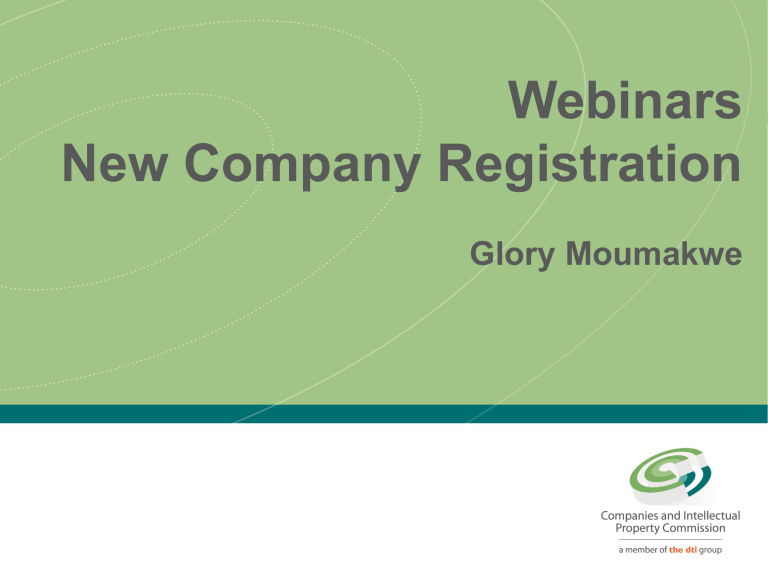 Webinars New Company Registration Glory Moumakwe Types of Companies Registration of New Companies can be subdivided into the following types of Companies: Private Company Public Company Personal Liability Company State Owned Company Non Profit Companies External Company Conversion from Close Corporation to a company The amalgamation or Merger of Companies Application to transfer registration of foreign company Channels of Filing New Company Registrations Fully Automated New Company Registration • Registration done via Banks (CoR15.1A) • Registrations done via Self Service Terminals (SST) (CoR15.1A ) Hybrid New Company Registrations • E-Services Registrations of short standard Private Company (CoR15.1A ) which requires Capturing data via website, submitting of signed documents and supporting documents for back office processing Manual New Company Registrations • Profit company registration (CoR15.1B – Public, State Owned and Personal Liability Company) • Non Profit Company CoR15.1 C, D and E) • CC to Co conversions (CoR18.1) • External Company (CoR20.1) • The amalgamation or Merger of Companies (CoR89) • Application to transfer registration of foreign company (CoR17.1) E-Service Registration Process Flow Documents Must be submitted within 31 calendar days from submitting data – Failure Transaction will be DELETED Customer: Submit data Customer: Print forms Processing Period is 3 working days Customer Sign forms Customer: E-mail to CIPC CIPC process forms [email protected] CIPC dispatch registration certificate Customer: Print MOI E-services: Step by step guide Follow the step by step guide on how to register Eservices New Company Registration successfully: Link: http://www.cipc.co.za/index.php/download_file/view/32638/1053/ E-Service: How To Submit In order to ensure correct conversion of application to an electronic image: - Documents Must be submitted in a single e-mail - All attachments must be in PDF or TIFF Format - Preferred that documents attached as a single DO NOT attach zipped files, another eattachment and be legible mail, word, excel or JPEG - Tracking number MUST be indicated in the subject heading of the e-mail - Preferred that sufficient funds must be available in customer code at time of submitting the application – otherwise a delay in processing the application E-Service: What to submit • Submit Signed documents generated by the system CoR15.1A ; • Name reservation (if applicable) • Certified ID copy of all directors and incorporators • If foreign national, certified passport copy E-Services: Troubleshooting Guide • Allocation of deposits • Customer profile difficulties • Website errors • Incorrect information submitted www.cipc.co.za / enquiries category – Finance / Allocation of Deposit [email protected] – include certified id copy Refer to Website Error Slides If still problems, log a ticket via www.cipc.co.za / enquiries www.cipc.co.za / enquiries category – for that specific service E-Services: Tips • Use E-service for short standard new company registration – shorter turnaround time than manual • Do not submit a Manual and E-service, for the same registration, together • Do not submit the same application more than once – log a ticket to follow up on the registration • Ensure that scanned copy is legible • If application rejected, the document must be submitted again via E-Service portal, rejected tracking number cannot be re-used • Submit a couple of days PRIOR to name reservation lapsing – causes additional delay in processing Manual Registration Process Flow Processing period is s 25 working days Customer: Complete Forms Customer: E-mail to CIPC CIPC process forms [email protected] CIPC dispatch registration certificate Manual: How To Submit In order to ensure correct conversion of application to an electronic image: - Must submit in a single e-mail DO NOT attach zipped files, another email, word, excel or JPEG - All attachments must be in PDF or TIFF - Customer code must be clearly visible and legible on the CoR14.1 - Preferred that documents attached as a single attachment and be clear and legible - Sufficient funds must be available in customer code at time of submitting the application – otherwise a delay in processing Manual: What to submit • It depends on the type of company and what options was selected • Refer to www.cipc.co.za / useful tools / how to – step by step guides / information guides / Contact details, forms and supporting documents required when transacting with CIPC Link: http://www.cipc.co.za/index.php/download_file/view/30020/1053/ Manual: Tips • Do not submit a Manual and E-service, for the same registration, together • Do not submit the same application more than once – log a ticket to follow up on the registration • Ensure that scanned copy is legible • If application rejected, the entire application must be resubmitted (cannot just e-mail outstanding information) • Submit a couple of days PRIOR to name reservation lapsing – causes additional delay in processing THANK YOU - QUESTIONS?