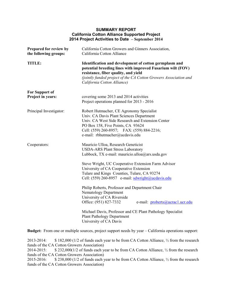 SUMMARY REPORT California Cotton Alliance Supported Project 2014 Project Activities to Date – September 2014 Prepared for review by the following groups: California Cotton Growers and Ginners Association, California Cotton Alliance TITLE: Identification and development of cotton germplasm and potential breeding lines with improved Fusarium wilt (FOV) resistance, fiber quality, and yield (jointly funded project of the CA Cotton Growers Association and California Cotton Alliance) For Support of Project in years: covering some 2013 and 2014 activities Project operations planned for 2013 - 2016 Principal Investigator: Robert Hutmacher, CE Agronomy Specialist Univ. CA Davis Plant Sciences Department Univ. CA West Side Research and Extension Center PO Box 158, Five Points, CA 93624 Cell: (559) 260-8957; FAX: (559) 884-2216; e-mail: [email protected] Cooperators: Mauricio Ulloa, Research Geneticist USDA-ARS Plant Stress Laboratory Lubbock, TX e-mail: [email protected] Steve Wright, UC Cooperative Extension Farm Advisor University of CA Cooperative Extension Tulare and Kings Counties, Tulare, CA 93274 Cell: (559) 260-8957 e-mail: [email protected] Philip Roberts, Professor and Department Chair Nematology Department University of CA Riverside Office: (951) 827-7332 e-mail: [email protected] Michael Davis, Professor and CE Plant Pathology Specialist Plant Pathology Department University of CA Davis Budget: From one or multiple sources, project support needs by year – California operations support: 2013-2014: $ 182,000 (1/2 of funds each year to be from CA Cotton Alliance, ½ from the research funds of the CA Cotton Growers Association) 2014-2015: $ 232,000(1/2 of funds each year to be from CA Cotton Alliance, ½ from the research funds of the CA Cotton Growers Association) 2015-2016: $ 238,000 (1/2 of funds each year to be from CA Cotton Alliance, ½ from the research funds of the CA Cotton Growers Association) Work status or initiated projects through September, 2014 are described in two components below: (1) Work in 2013 and early 2014 conducted in cooperation with a post-Doctoral fellow, Dr. Grant Poole (who was on staff from October, 2013 through mid-March, 2014; and (2) Work continued in 2014 that includes additional areas of work and that also builds on the work identified in #1. OBJECTIVES (related to #(1) and #(2) above: 1. Develop cotton progeny and breeding populations segregating for FOV race 4 resistance. (approximately 2/3 of efforts will focus on Upland / Acala types of cotton, with remainder of effort on Pima germplasm). For 2013 evaluations: Over 500 entries were sent from Mauricio Ulloa in Lubbock, TX representing populations derived from cooperative work with Bob Hutmacher and Steve Wright of UCCE in recent years. These entries were planted at one major field screening site for race 4 FOV in Tulare County, and evaluations of all entries were done in the summer and fall of 2013. For 2014 evaluations: Over 410 entries were sent from Mauricio Ulloa of USDA-ARS in Lubbock, TX representing populations of interest. All of the entries were planted at the Tulare County FOV screening site in May, 2014 and about half of the entries were also planted at the Kern County FOV screening site that we have developed. In addition, multiple entries (over 150 total) of Pima and Upland varieties were submitted for in field and greenhouse FOV-race 4 screenings at Kearney REC greenhouse location. All entries were evaluated for vascular staining, stunting and vigor index ratings, and survival of populations as influenced by race 4 fusarium at the sites. 2. Evaluate resulting progeny, breeding lines, and germplasm for FOV resistance, fiber quality traits. Field screenings were conducted at each site (field in Kern Co., field in Tulare Co., greenhouse at Kearney REC) in summer and early fall, 2013. Progeny were grown in greenhouse for seed increase at Kearney REC, with plantings in mid-November. In addition, a small number of seed were collected from seed increase plantings made at the Kearney REC, with further seed increases done in the greenhouse and clean field site at Kearney REC. In 2013, for selected entries, plant tissue samples were collected, sent to Lubbock, TX and frozen for later DNA molecular work related to molecular markers and screening approaches. Samples were collected by UCCE staff and submitted for cooperative evaluations to be done in the USDA ARS laboratories in Lubbock, TX. Improved laboratory equipment and setup were developed to some extent at Shafter to allow more detailed evaluations in cooperation with USDA-ARS in Lubbock, TX and UC Riverside cooperators. 3. Utilizing selected materials, maintain seed supplies through progeny propagation and breeding population increases either at field location(s) in California or in Tecoman, Mexico nursery. Seed needed for selections to advance have been collected and will continue to be collected in the fall of 2013 from the Tulare Co fusarium screening site from: (1) selections made based on FOV resistance; (2) varieties for advancement based on desirable agronomic characteristics plus FOV resistance; and (3) materials of interest for molecular markers use in resistance screening efforts in CA or Texas. 4. As selected germplasm are advanced, also conduct trials to evaluate growth characteristics and yield performance (growth habit, growing season length requirements and yield performance) at West Side Research Center location. Limited evaluations were initiated at Kearney for 9 lines we are hoping to advance in Pimas out of the existing race 4 resistant materials being developed. In addition, some select entries were also planted at the UC West Side REC for yield and fiber quality evaluations. Only evaluations to date will be for fiber quality, as the plot size and seed available not adequate for yield potential evaluations. Progress with selections and increases (as of September, 2014): September 2013 to early 2014 efforts (2013 FOV sc