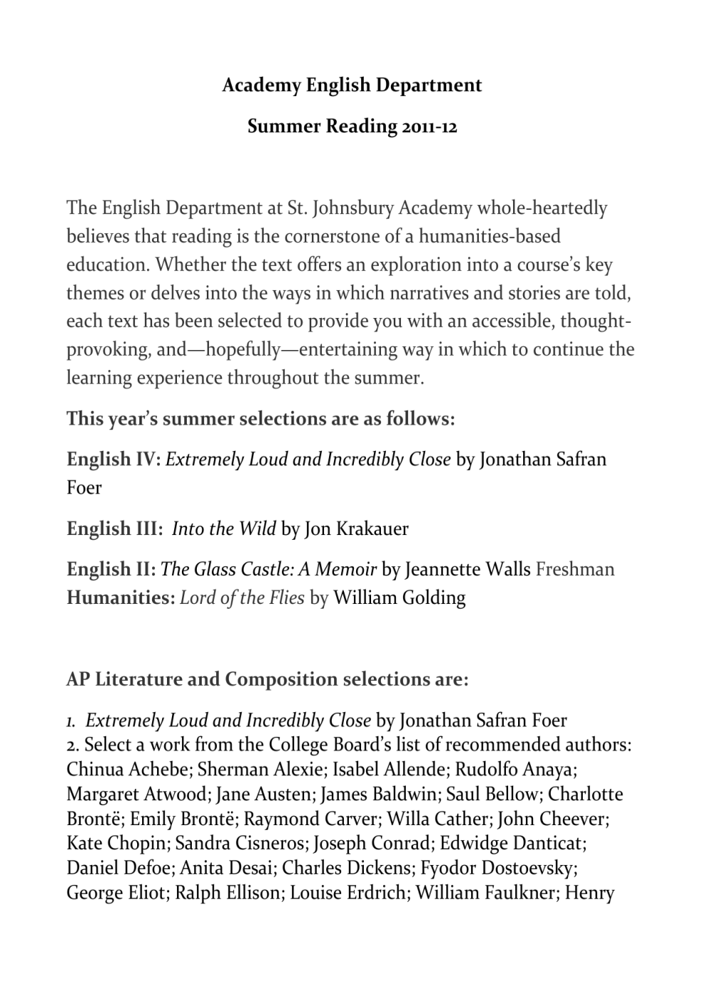 Academy English Department Summer Reading 2011-12 The English Department at St. Johnsbury Academy whole-heartedly believes that reading is the cornerstone of a humanities-based education. Whether the text offers an exploration into a course’s key themes or delves into the ways in which narratives and stories are told, each text has been selected to provide you with an accessible, thoughtprovoking, and—hopefully—entertaining way in which to continue the learning experience throughout the summer. This year’s summer selections are as follows: English IV: Extremely Loud and Incredibly Close by Jonathan Safran Foer English III: Into the Wild by Jon Krakauer English II: The Glass Castle: A Memoir by Jeannette Walls Freshman Humanities: Lord of the Flies by William Golding AP Literature and Composition selections are: 1. Extremely Loud and Incredibly Close by Jonathan Safran Foer 2. Select a work from the College Board’s list of recommended authors: Chinua Achebe; Sherman Alexie; Isabel Allende; Rudolfo Anaya; Margaret Atwood; Jane Austen; James Baldwin; Saul Bellow; Charlotte Brontë; Emily Brontë; Raymond Carver; Willa Cather; John Cheever; Kate Chopin; Sandra Cisneros; Joseph Conrad; Edwidge Danticat; Daniel Defoe; Anita Desai; Charles Dickens; Fyodor Dostoevsky; George Eliot; Ralph Ellison; Louise Erdrich; William Faulkner; Henry Fielding; F. Scott Fitzgerald; E. M. Forster; Thomas Hardy; Nathaniel Hawthorne; Ernest Hemingway; Zora Neale Hurston; Kazuo Ishiguro; Henry James; Ha Jin; Edward P. Jones; James Joyce; Maxine Hong Kingston; Joy Kogawa; Jhumpa Lahiri; Margaret Laurence; D. H. Lawrence; Chang-rae Lee; Bernard Malamud; Gabriel García Márquez; Cormac McCarthy; Ian McEwan; Herman Melville; Toni Morrison; Bharati Mukherjee; Vladimir Nabokov; Flannery O’Connor; Orhan Pamuk; Katherine Anne Porter; Marilynne Robinson; Jonathan Swift; Mark Twain; John Updike; Alice Walker; Evelyn Waugh; Eudora Welty; Edith Wharton; John Edgar Wideman; Virginia Woolf; Richard Wright. AP English Language and Composition selections are: 1. Into the Wild by Jon Krakauer 2. Eaarth by Bill McKibben