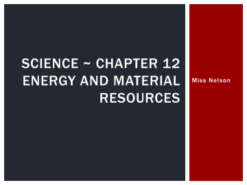 SCIENCE ~ CHAPTER 12 ENERGY AND MATERIAL RESOURCES Miss Nelson SECTION 5 Recycling Material Resources ANTICIPATORY SET What kind of things does your family throw away? How does your family get rid of its trash? STANDARDS S 6.3.c – Students know the natural origin of the materials used to make common objects THE BIG IDEA What are three methods of handling solid waste? What can people do to help control the solid waste problem? KEY TERMS Municipal solid waste – waste produced in homes, businesses, and schools Incineration – the burning of solid waste Leachate – polluted liquid produced by water passing through buried wastes in a landfill Sanitary landfill – a landfill that holds nonhazardous waste such as municipal solid waste and construction debris KEY TERMS Recycling – the process of reclaiming and reusing raw materials Biodegradable – capable of being broken down by bacteria and other decomposers Composting – the process of helping biodegradable wastes to decompose naturally RECYCLING MATERIAL RESOURCES Read Recycling Material Resources on page 506 of your textbook THE PROBLEM OF WASTE DISPOSAL In our daily activities, we generate many types of waste Used paper Empty packages Food scraps These materials are produced in homes, businesses, schools, and other places in the community Called municipal solid waste Other sources of solid waste include Construction debris Certain agricultural/industrial wastes THE PROBLEM OF WASTE DISPOSAL Three methods of handling solid waste: Burning Burying Recycling Each has its advantages and disadvantages INCINERATION The burning of solid waste Advantages Burning facilities do not take up much space Do not pose a risk of polluting ground water The heat produced can be used to generate electricity Disadvantages Even the best incinerators release some pollution into the air Reduce the volume of waste by 90% - some still remains This remaining waste needs to go somewhere Expensive to build LANDFILLS Until fairly recently, people usually disposed of waste in open holes in the ground Rainwater falling on a dump dissolved chemicals from the wastes, forming a polluted liquid called leachate Could run off into streams and lakes, or trickle into groundwater In 1976 open dumps were banned Now much solid waste is buried in landfills that are constructed to hold waste more safely However, even well-designed landfills still pose a risk of polluting groundwater THE PROBLEM OF WASTE DISPOSAL Read The Problem of Waste Disposal on pages 507 508 of your textbook RECYCLING The process of reclaiming raw materials and reusing them to create new products Any material that can be broken down and recycled by bacteria and other decomposers is biodegradable Unfortunately, many of the products people use today are NOT biodegradable A wide range of materials can be recycled RECYCLING Most recycling focuses on four major categories of products: Metal Plastic Glass Paper METALS Metals such as iron and aluminum can be recycled With recycling, no ore needs to be mined, transported, or processed Recycling metals helps conserve these nonrenewable resources PLASTIC When oil is refined to make gasoline and other petroleum products, solid materials called resins are left over Resins can be heated, stretched, and molded into plastic products When these products are recycled, they take on very different forms! Fleece jackets Carpeting Floor tiles Trash cans GLASS Glass is made from sand, soda ash, and limestone mixed together and heated Glass is one of the easiest products to recycle because glass pieces can be melted down over and over to make new glass containers Recycling glass is less expensive than making glass from raw materials PAPER It takes about 17 trees to make one metric ton of paper Most paper products can only be recycled a few times Each time paper is recycled, the new paper is rougher, weaker, and darker IS RECYCLING WORTHWHILE? Besides conserving resources, recycling also saves energy Making aluminum products from recycled aluminum rather than from raw materials uses about 90 percent less energy overall For certain materials, recycling is usually worthwhile IS RECYCLING WORTHWHILE? Recycling is not a complete answer to the solid waste problem For some cities, recycling is not cost-effective Scientists have not found good ways to recycle some materials The value of recycling must be judged on a case by case basis RECYCLING Read Recycling on pages 509-510 of your textbook WHAT PEOPLE CAN DO Reduce Reuse Recycle WHAT PEOPLE CAN DO Create less waste by reducing your use of non-recyclable materials You can also make an effort to buy products made from recycled materials Start a compost pile CHECK FOR UNDERSTANDING Name three ways of dealing with solid waste. CHECK FOR UNDERSTANDING Name three ways of dealing with solid waste. Three ways of dealing with solid waste are burning, burying, and recycling. GUIDED PRACTICE Describe an advantage and disadvantage of each method. GUIDED PRACTICE Describe an advantage and disadvantage of each method. Incineration can be used to generate electricity, but can pollute air. Burying waste in a sanitary landfill can possibly pollute groundwater, but the land later can be used for other things. Recycling conserves nonrenewable resources, but it is not always cost effective. INDEPENDENT PRACTICE Complete Energy 12-5 Independent Practice