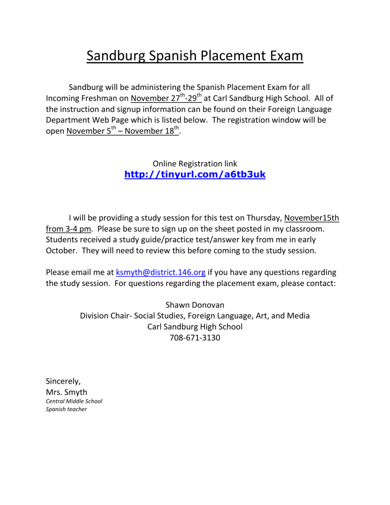 Sandburg Spanish Placement Exam Sandburg will be administering the Spanish Placement Exam for all Incoming Freshman on November 27th-29th at Carl Sandburg High School. All of the instruction and signup information can be found on their Foreign Language Department Web Page which is listed below. The registration window will be open November 5th – November 18th. Online Registration link http://tinyurl.com/a6tb3uk I will be providing a study session for this test on Thursday, November15th from 3-4 pm. Please be sure to sign up on the sheet posted in my classroom. Students received a study guide/practice test/answer key from me in early October. They will need to review this before coming to the study session. Please email me at [email protected] if you have any questions regarding the study session. For questions regarding the placement exam, please contact: Shawn Donovan Division Chair- Social Studies, Foreign Language, Art, and Media Carl Sandburg High School 708-671-3130 Sincerely, Mrs. Smyth Central Middle School Spanish teacher