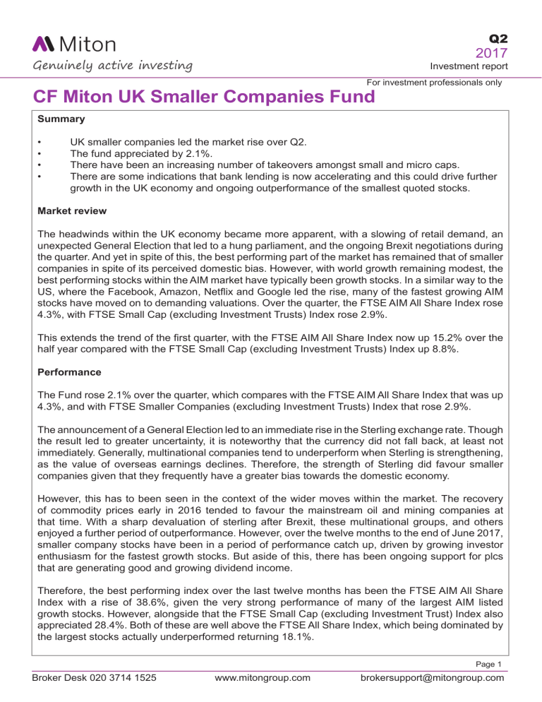 Q2 2017 Investment report For investment professionals only CF Miton UK Smaller Companies Fund Summary • • • • UK smaller companies led the market rise over Q2. The fund appreciated by 2.1%. There have been an increasing number of takeovers amongst small and micro caps. There are some indications that bank lending is now accelerating and this could drive further growth in the UK economy and ongoing outperformance of the smallest quoted stocks. Market review The headwinds within the UK economy became more apparent, with a slowing of retail demand, an unexpected General Election that led to a hung parliament, and the ongoing Brexit negotiations during the quarter. And yet in spite of this, the best performing part of the market has remained that of smaller companies in spite of its perceived domestic bias. However, with world growth remaining modest, the best performing stocks within the AIM market have typically been growth stocks. In a similar way to the US, where the Facebook, Amazon, Netflix and Google led the rise, many of the fastest growing AIM stocks have moved on to demanding valuations. Over the quarter, the FTSE AIM All Share Index rose 4.3%, with FTSE Small Cap (excluding Investment Trusts) Index rose 2.9%. This extends the trend of the first quarter, with the FTSE AIM All Share Index now up 15.2% over the half year compared with the FTSE Small Cap (excluding Investment Trusts) Index up 8.8%. Performance The Fund rose 2.1% over the quarter, which compares with the FTSE AIM All Share Index that was up 4.3%, and with FTSE Smaller Companies (excluding Investment Trusts) Index that rose 2.9%. The announcement of a General Election led to an immediate rise in the Sterling exchange rate. Though the result led to greater uncertainty, it is noteworthy that the currency did not fall back, at least not immediately. Generally, multinational companies tend to underperform when Sterling is strengthening, as the value of overseas earnings declines. Therefore, the strength of Sterling did favour smaller companies given that they frequently have a greater bias towards the domestic economy. However, this has to been seen in the context of the wider moves within the market. The recovery of commodity prices early in 2016 tended to favour the mainstream oil and mining companies at that time. With a sharp devaluation of sterling after Brexit, these multinational groups, and others enjoyed a further period of outperformance. However, over the twelve months to the end of June 2017, smaller company stocks have been in a period of performance catch up, driven by growing investor enthusiasm for the fastest growth stocks. But aside of this, there has been ongoing support for plcs that are generating good and growing dividend income. Therefore, the best performing index over the last twelve months has been the FTSE AIM All Share Index with a rise of 38.6%, given the very strong performance of many of the largest AIM listed growth stocks. However, alongside that the FTSE Small Cap (excluding Investment Trust) Index also appreciated 28.4%. Both of these are well above the FTSE All Share Index, which being dominated by the largest stocks actually underperformed returning 18.1%. Page 1 Broker Desk 020 3714 1525 www.mitongroup.com [email protected] Q2 2017 Investment report For investment professionals only CF Miton UK Smaller Companies Fund The CF Miton UK Smaller Companies Fund has appreciated by 27.0% in that twelve-month period, as the ongoing focus on stocks generating good and growing income delivered returns. Performance attribution The fund held a position in Utilitywise for its recovery potential. However, the share price fell by 55.8% during the quarter as it announced that they would need to repay £7.6m to one of its’ supplier utilities given under-consumption versus contracts it has broked to industry users. Mercantile Ports and Logistics also detracted from performance, since its share price fell back 46.2%. Again this stock has plenty of recovery potential as it is due to bring its new port onstream over the next twelve months in an area where there is a chronic shortage of capacity. The fund has held Hurricane Energy, for a little over a year during which time the stock had doubled as it proved up a very larger field in the North Sea. However, the stock fell back on rumours of a fund raising to bring it into full production, which has now been completed. Clearly all of these stocks have reduced the fund return, but in these three cases we believe the businesses remain well financed with good reasons to expect the share prices to recover back to their previous levels and beyond. Some the strongest performers in previous quarters have continued to deliver good returns once again. For example, IG Index is now the largest holding in the fund, and though it only appreciated a further 14.2% in the quarter, the value it added was still similar to the amount that Hurricane detracted. IQE was up another 37.7% , and Burford Capital rose a further 17.7%. Lastly Kromek, also rose 19.6% during the quarter and was another notable performer. Portfolio activity Following the takeover of NetDimensions at the end of the last quarter and Shawbrook Group both of these companies have been sold. In addition, substantial profits have been taken on the holdings in Burford Capital and Fulcrum Utilities though they still remain holdings in the portfolio. There have been some attractively valued IPO’s coming to market, with Ethernity Networks being the most exciting in our view. This company helps address the bottleneck in data handling at household routers caused by additional links from security detectors, internal cameras and heating control systems. The business is already profitable, and is being contracted by several major US companies who want to use their systems to help address the issue. In addition, a new holding was taken in Eddie Stobart Logistics at issue, since the company has further increased