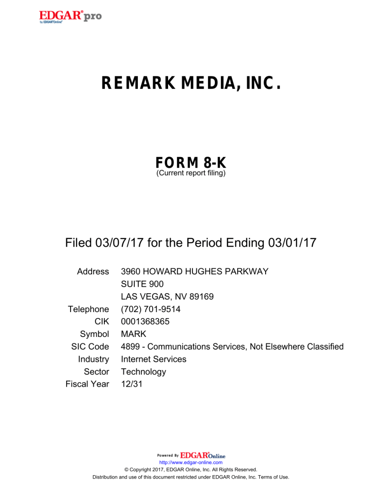 REMARK MEDIA, INC. FORM 8-K (Current report filing) Filed 03/07/17 for the Period Ending 03/01/17 Address Telephone CIK Symbol SIC Code Industry Sector Fiscal Year 3960 HOWARD HUGHES PARKWAY SUITE 900 LAS VEGAS, NV 89169 (702) 701-9514 0001368365 MARK 4899 - Communications Services, Not Elsewhere Classified Internet Services Technology 12/31 http://www.edgar-online.com © Copyright 2017, EDGAR Online, Inc. All Rights Reserved. Distribution and use of this document restricted under EDGAR Online, Inc. Terms of Use. UNITED STATES SECURITIES AND EXCHANGE COMMISSION WASHINGTON, D.C. 20549 FORM 8-K CURRENT REPORT Pursuant to Section 13 or 15(d) of the Securities Exchange Act of 1934 Date of report (Date of earliest event reported): March 1, 2017 Remark Media, Inc. Delaware 001-33720 33-1135689 (State or other jurisdiction of incorporation) (Commission File Number) (IRS Employer Identification No.) 3960 Howard Hughes Parkway, Suite 900 Las Vegas, NV 89169 702-701-9514 (Address of principal executive offices) (Zip Code) (Registrant’s telephone number, including area code) (Former name or former address, if changed since last report.) Check the appropriate box below if the Form 8-K filing is intended to simultaneously satisfy the filing obligation of the registrant under any of the following provisions: ☐ Written communications pursuant to Rule 425 under the Securities Act (17 CFR 230.425) ☐ Soliciting material pursuant to Rule 14a-12 under the Exchange Act (17 CFR 240.14a-12) ☐ Pre-commencement communications pursuant to Rule 14d-2(b) under the Exchange Act (17 CFR 240.14d-2(b)) ☐ Pre-commencement communications pursuant to Rule 13e-4(c) under the Exchange Act (17 CFR 240.13e-4(c)) Item 5.02 Departure of Directors or Certain Officers; Election of Directors; Appointment of Certain Officers; Compensatory Arrangements of Certain Officers. On March 1, 2017, the Board of Directors (the “Board”) of Remark Media, Inc. (“we”) accepted the resignations of Robert Goldstein and Jason Strauss from the Board, and elected Daniel Stein and Brett Ratner as directors to fill the vacancies created by Mr. Goldstein’s and Mr. Strauss’s resignations. The Board also appointed Mr. Stein to the Audit Committee and the Nominating and Governance Committee, and Mr. Ratner to the Compensation Committee and the Nominating and Governance Committee. Item 8.01 Other Events. On March 1, 2017, we issued a press release announcing Mr. Ratner’s appointment to the Board, and on March 2, 2017 we issued a press release announcing Mr. Stein’s appointment to the Board. Copies of the press releases are attached hereto as Exhibit 99.1 and Exhibit 99.2 and are incorporated herein by reference. Item 9.01 (d) Financial Statements and Exhibits. Exhibits Exhibit Number Description 99.1 Press release dated March 1, 2017. 99.2 Press release dated March 2, 2017. Signature Pursuant to the requirements of the Securities Exchange Act of 1934, the registrant has duly caused this report to be signed on its behalf by the undersigned hereunto duly authorized. Remark Media, Inc. Date: March 7, 2017 By: /s/ Douglas Osrow Name: Douglas Osrow Title: Chief Financial Officer EXHIBIT 99.1 Remark Media Appoints Brett Ratner to its Board of Directors LAS VEGAS, NV - March 1, 2017 - Remark Media, Inc. (Nasdaq: MARK), a global digital media technology company, announced it has appointed Brett Ratner to its board of directors. Directors Robert Goldstein and Jason Strauss are resigning from the board effective today. “We are excited to welcome Brett to our board,” said Kai-Shing Tao, Remark Media’s Chairman and CEO. “Brett is one of Hollywood’s most noteworthy filmmakers, and his extensive knowledge of the entertainment industry and diverse network of contacts brings a multitude of opportunities to Remark Media as we seek to broaden our audience across multiple verticals. He will be a valuable resource to our company as we grow our leadership position in the digital media technology market.” “I am thrilled to join Remark Media’s board of directors,” Ratner stated. “I look forward to working with the company to develop and expand its brands, audiences and partnerships worldwide.” Mr. Ratner will be joining the Compensation Committee and the Nominating and Governance Committee. He will stand for re-election at the 2017 annual meeting of stockholders. Brett Ratner Brett Ratner is one of Hollywood’s most successful filmmakers. His films have grossed more than $2 billion at the global box office. He has served as an executive producer on films such as the Golden Globe and Oscar winning The Revenant, starring Leonardo DiCaprio, he served as executive producer and director of the Golden Globe-nominated FOX series Prison Break, and he served as executive producer of the television series Rush Hour, based on his hit films. Mr. Ratner, along with his business partner James Packer, formed RatPac Entertainment, a film finance and media company, in 2013. Since inception, RatPac Entertainment has co-financed 63 theatrically-released motion pictures exceeding $11.6 billion in worldwide box office receipts. Mr. Ratner is a Board of Trustees member of the Simon Wiesenthal Center and Museum of Tolerance. He sits on the boards of Chrysalis, Best Buddies and Do Something, while serving on the Dean’s Council of the NYU Tisch School of the Arts and on the Board of Directors at Tel Aviv University’s School of Film and Television. In 2017, he received a coveted star on the Hollywood Walk of Fame. About Remark Media, Inc. Remark Media, Inc. (NASDAQ: MARK) owns, operates and acquires innovative digital media properties across multiple verticals that deliver culturally relevant, dynamic content that attracts and engages users on a global scale. The company leverages its unique digital media assets to target the Millennial demographic, which provides it with access to fast-growing, lucrative markets. The company is headquartered in Las Veg
