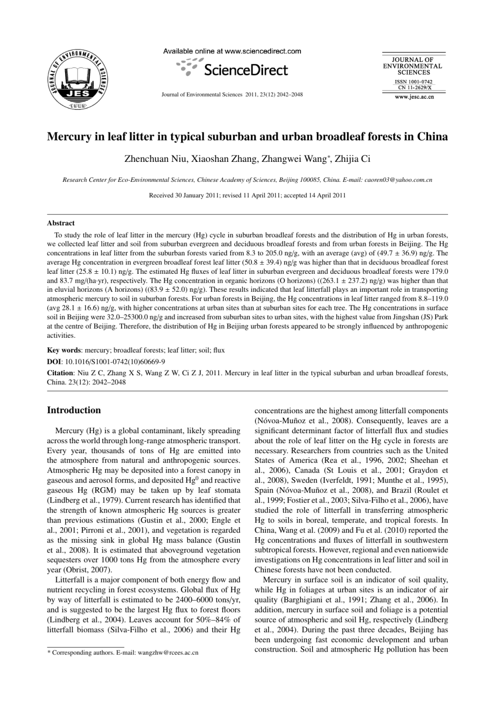 Journal of Environmental Sciences 2011, 23(12) 2042–2048 Mercury in leaf litter in typical suburban and urban broadleaf forests in China Zhenchuan Niu, Xiaoshan Zhang, Zhangwei Wang ∗, Zhijia Ci Research Center for Eco-Environmental Sciences, Chinese Academy of Sciences, Beijing 100085, China. E-mail: [email protected] Received 30 January 2011; revised 11 April 2011; accepted 14 April 2011 Abstract To study the role of leaf litter in the mercury (Hg) cycle in suburban broadleaf forests and the distribution of Hg in urban forests, we collected leaf litter and soil from suburban evergreen and deciduous broadleaf forests and from urban forests in Beijing. The Hg concentrations in leaf litter from the suburban forests varied from 8.3 to 205.0 ng/g, with an average (avg) of (49.7 ± 36.9) ng/g. The average Hg concentration in evergreen broadleaf forest leaf litter (50.8 ± 39.4) ng/g was higher than that in deciduous broadleaf forest leaf litter (25.8 ± 10.1) ng/g. The estimated Hg fluxes of leaf litter in suburban evergreen and deciduous broadleaf forests were 179.0 and 83.7 mg/(ha·yr), respectively. The Hg concentration in organic horizons (O horizons) ((263.1 ± 237.2) ng/g) was higher than that in eluvial horizons (A horizons) ((83.9 ± 52.0) ng/g). These results indicated that leaf litterfall plays an important role in transporting atmospheric mercury to soil in suburban forests. For urban forests in Beijing, the Hg concentrations in leaf litter ranged from 8.8–119.0 (avg 28.1 ± 16.6) ng/g, with higher concentrations at urban sites than at suburban sites for each tree. The Hg concentrations in surface soil in Beijing were 32.0–25300.0 ng/g and increased from suburban sites to urban sites, with the highest value from Jingshan (JS) Park at the centre of Beijing. Therefore, the distribution of Hg in Beijing urban forests appeared to be strongly influenced by anthropogenic activities. Key words: mercury; broadleaf forests; leaf litter; soil; flux DOI: 10.1016/S1001-0742(10)60669-9 Citation: Niu Z C, Zhang X S, Wang Z W, Ci Z J, 2011. Mercury in leaf litter in the typical suburban and urban broadleaf forests, China. 23(12): 2042–2048 Introduction Mercury (Hg) is a global contaminant, likely spreading across the world through long-range atmospheric transport. Every year, thousands of tons of Hg are emitted into the atmosphere from natural and anthropogenic sources. Atmospheric Hg may be deposited into a forest canopy in gaseous and aerosol forms, and deposited Hg0 and reactive gaseous Hg (RGM) may be taken up by leaf stomata (Lindberg et al., 1979). Current research has identified that the strength of known atmospheric Hg sources is greater than previous estimations (Gustin et al., 2000; Engle et al., 2001; Pirroni et al., 2001), and vegetation is regarded as the missing sink in global Hg mass balance (Gustin et al., 2008). It is estimated that aboveground vegetation sequesters over 1000 tons Hg from the atmosphere every year (Obrist, 2007). Litterfall is a major component of both energy flow and nutrient recycling in forest ecosystems. Global flux of Hg by way of litterfall is estimated to be 2400–6000 tons/yr, and is suggested to be the largest Hg flux to forest floors (Lindberg et al., 2004). Leaves account for 50%–84% of litterfall biomass (Silva-Filho et al., 2006) and their Hg * Corresponding authors. E-mail: [email protected] concentrations are the highest among litterfall components (Nóvoa-Muñoz et al., 2008). Consequently, leaves are a significant determinant factor of litterfall flux and studies about the role of leaf litter on the Hg cycle in forests are necessary. Researchers from countries such as the United States of America (Rea et al., 1996, 2002; Sheehan et al., 2006), Canada (St Louis et al., 2001; Graydon et al., 2008), Sweden (Iverfeldt, 1991; Munthe et al., 1995), Spain (Nóvoa-Muñoz et al., 2008), and Brazil (Roulet et al., 1999; Fostier et al., 2003; Silva-Filho et al., 2006), have studied the role of litterfall in transferring atmospheric Hg to soils in boreal, temperate, and tropical forests. In China, Wang et al. (2009) and Fu et al. (2010) reported the Hg concentrations and fluxes of litterfall in southwestern subtropical forests. However, regional and even nationwide investigations on Hg concentrations in leaf litter and soil in Chinese forests have not been conducted. Mercury in surface soil is an indicator of soil quality, while Hg in foliages at urban sites is an indicator of air quality (Barghigiani et al., 1991; Zhang et al., 2006). In addition, mercury in surface soil and foliage is a potential source of atmospheric and soil Hg, respectively (Lindberg et al., 2004). During the past three decades, Beijing has been undergoing fast economic development and urban construction. Soil and atmospheric Hg pollution has been No. 12 Mercury in leaf litter in typical suburban and urban broadleaf forests in China studied in some urban areas (Liu et al., 2002; Wang et al., 2006; Zhang et al., 2006; Chen et al., 2010). It is also necessary, however, to study the distribution of Hg in leaf litter and soil in urban forests. Therefore, the goals of this study were to: (1) investigate the Hg concentrations in leaf litter and soil of evergreen and deciduous broadleaf forests in the suburban mountains of Chinese cities; and (2) investigate Hg distribution in leaf litter and surface soil within different forms of land use in Beijing urban forests. 2043 Populus davidiana Dode, Betula platyphylla Suk., Ulmus pumila L., Quercus liaotungensis Koidz. and Acer truncatum Bunge. In Beijing urban forests, broadleaf trees Sophora japonica L., Populus tomentosa Carr., Ginkgo biloba L. were selected. For comparison, coniferous trees Sabina chinensis L. and Pinus tabulaeformis Carr. were also selected. 1 Materials and methods 1.1 Site location The study sites were divided into suburban and urban forests according to the influential extent of human activities. Suburban forest