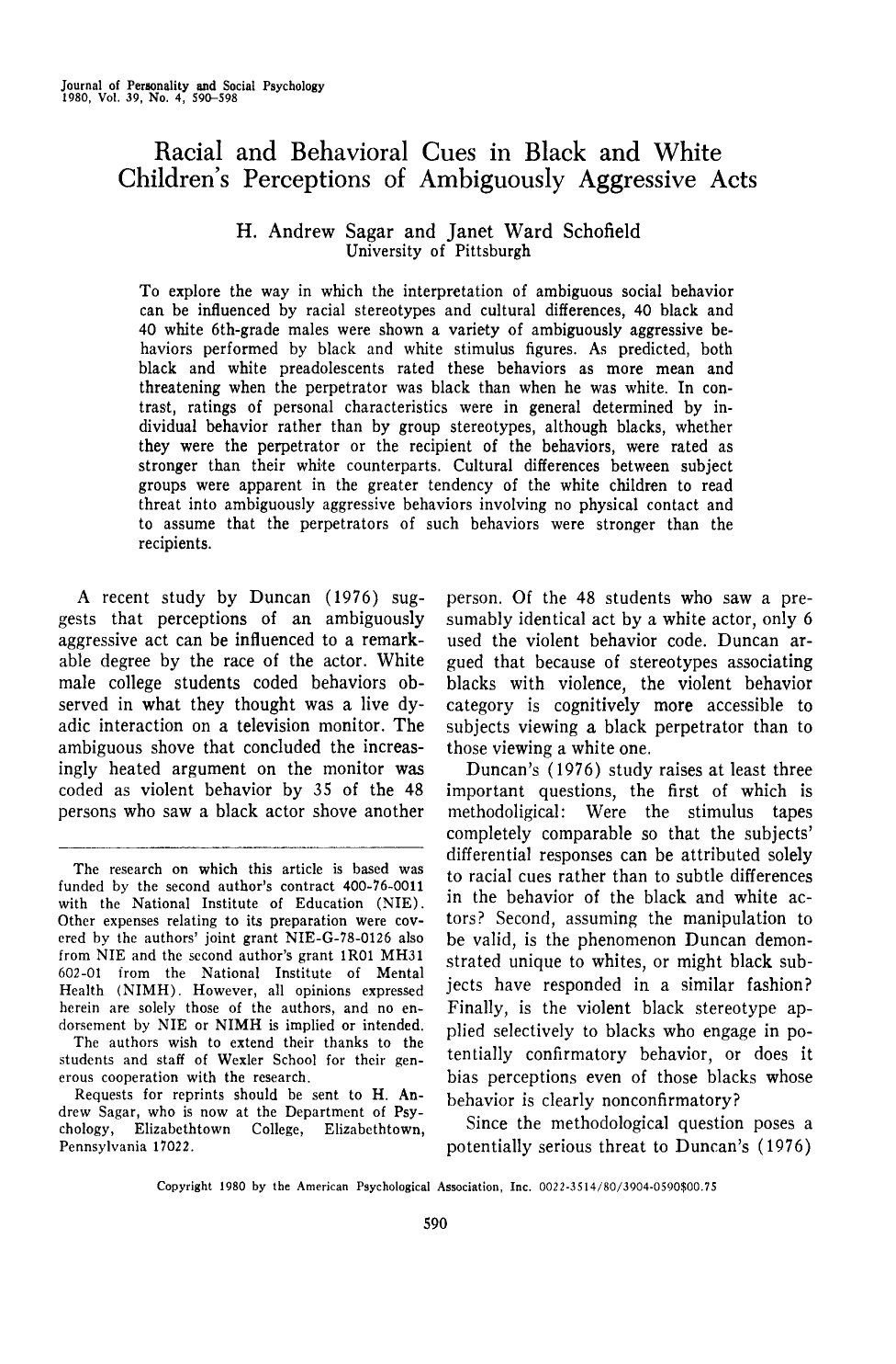 Journal of Personality and Social Psychology 1980, Vol. 39, No. 4, 590-598 Racial and Behavioral Cues in Black and White Children's Perceptions of Ambiguously Aggressive Acts H. Andrew Sagar and Janet Ward Schofield University of Pittsburgh To explore the way in which the interpretation of ambiguous social behavior can be influenced by racial stereotypes and cultural differences, 40 black and 40 white 6th-grade males were shown a variety of ambiguously aggressive behaviors performed by black and white stimulus figures. As predicted, both black and white preadolescents rated these behaviors as more mean and threatening when the perpetrator was black than when he was white. In contrast, ratings of personal characteristics were in general determined by individual behavior rather than by group stereotypes, although blacks, whether they were the perpetrator or the recipient of the behaviors, were rated as stronger than their white counterparts. Cultural differences between subject groups were apparent in the greater tendency of the white children to read threat into ambiguously aggressive behaviors involving no physical contact and to assume that the perpetrators of such behaviors were stronger than the recipients. A recent study by Duncan (1976) suggests that perceptions of an ambiguously aggressive act can be influenced to a remarkable degree by the race of the actor. White male college students coded behaviors observed in what they thought was a live dyadic interaction on a television monitor. The ambiguous shove that concluded the increasingly heated argument on the monitor was coded as violent behavior by 35 of the 48 persons who saw a black actor shove another The research on which this article is based was funded by the second author's contract 400-76-0011 with the National Institute of Education (NIE). Other expenses relating to its preparation were covered by the authors' joint grant NIE-G-78-0126 also from NIE and the second author's grant 1R01 MH31 602-01 from the National Institute of Mental Health (NIMH). However, all opinions expressed herein are solely those of the authors, and no endorsement by NIE or NIMH is implied or intended. The authors wish to extend their thanks to the students and staff of Wexler School for their generous cooperation with the research. Requests for reprints should be sent to H. Andrew Sagar, who is now at the Department of Psychology, Elizabethtown College, Elizabethtown, Pennsylvania 17022. person. Of the 48 students who saw a presumably identical act by a white actor, only 6 used the violent behavior code. Duncan argued that because of stereotypes associating blacks with violence, the violent behavior category is cognitively more accessible to subjects viewing a black perpetrator than to those viewing a white one. Duncan's (1976) study raises at least three important questions, the first of which is methodoligical: Were the stimulus tapes completely comparable so that the subjects' differential responses can be attributed solely to racial cues rather than to subtle differences in the behavior of the black and white actors? Second, assuming the manipulation to be valid, is the phenomenon Duncan demonstrated unique to whites, or might black subjects have responded in a similar fashion? Finally, is the violent black stereotype applied selectively to blacks who engage in potentially confirmatory behavior, or does it bias perceptions even of those blacks whose behavior is clearly nonconfirmatory? Since the methodological question poses a potentially serious threat to Duncan's (1976) Copyright 1980 by the American Psychological Association, Inc. 0022-3514/80/3904-0590$00.75 590 RACIAL AND BEHAVIORAL CUES findings, we will discuss it first. Duncan sought to make the taped interactions used in his research conceptually, rather than literally, identical to each other. The loosely constructed script permitted black and white confederates to "adopt their respective patois" (p. 592). Although this strategy probably made the tapes realistic, it leaves open the question of whether the subjects' differential responses to blacks and whites were based on visual race cues, as Duncan contended, or on variations in the verbal and behavioral styles of the actors. To assess the comparability of the 12 tapes that were employed in his research (two black and two white confederates in all possible role pairings), Duncan had 40 high school students rate the personal characteristics of the confederates in each tape. No between-condition differences were found. Unfortunately, however, there appears to be no firm basis for assuming that these raters were any more objective and accurate than Duncan's college student subjects. For example, seeing blacks and whites playing the same roles could have motivated the high school raters to try to preserve their unprejudiced self-concepts by overlooking subtle differences and responding similarly to the different tapes (cf. Dutton, 1976). The point of the foregoing discussion is not that the tapes necessarily lacked practical comparability, but rather that such crossracial comparability is both crucial to the experiment and difficult to demonstrate with any certainty. The experimental realism achieved in Duncan's scenario may have been high; nevertheless, confidence in the experiment's conclusions would be greatly increased if similar results could be obtained with stimuli whose precise comparability could be more clearly documented. A second question, raised by the fact that all of Duncan's subjects were white, is whether the biased perception of blacks' behavior revealed by that study is unique to whites. It is easy to assume that the tendency to code the black actor's behavior as violent represents a motivated response to a negatively valued outgroup. Cooper and Fazio (1979), for example, have discussed biased evaluations of outgroup members' behavior in 591 terms of a vicarious personalism resulting from a perceived conflict of intere