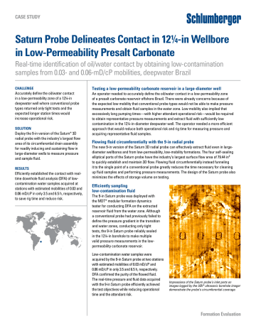 CASE STUDY Saturn Probe Delineates Contact in 12¼-in Wellbore in Low-Permeability Presalt Carbonate Real-time identification of oil/water contact by obtaining low-contamination samples from 0.03- and 0.06-mD/cP mobilities, deepwater Brazil CHALLENGE Accurately define the oil/water contact in a low-permeability zone of a 12¼-in deepwater well where conventional probe types returned only tight tests and the expected longer station times would increase operational risk. SOLUTION Deploy the 9-in version of the Saturn* 3D radial probe with the industry’s largest flow area of its circumferential drain assembly for readily inducing and sustaining flow in large-diameter wells to measure pressure and sample fluid. RESULTS Efficiently established the contact with realtime downhole fluid analysis (DFA) of lowcontamination water samples acquired at stations with estimated mobilities of 0.03 and 0.06 mD/cP in only 3.5 and 6.5 h, respectively, to save rig time and reduce risk. Testing a low-permeability carbonate reservoir in a large-diameter well An operator needed to accurately define the oil/water contact in a low-permeability zone of a presalt carbonate reservoir offshore Brazil. There were already concerns because of the expected low mobility that conventional probe types would not be able to make pressure measurements and obtain fluid samples in the water zone. Low mobility also implied that excessively long pumping times—with higher attendant operational risk—would be required to obtain representative pressure measurements and extract fluid with sufficiently low contamination in the 12¼-in-diameter deepwater well. The operator needed a more efficient approach that would reduce both operational risk and rig time for measuring pressure and acquiring representative fluid samples. Flowing fluid circumferentially with the 9-in radial probe The new 9-in version of the Saturn 3D radial probe can effectively extract fluid even in largediameter wellbores and from low-permeability, low-mobility formations. The four self-sealing elliptical ports of the Saturn probe have the industry’s largest surface flow area of 79.44 in2 to quickly establish and maintain 3D flow. Flowing fluid circumferentially instead funneling it to the single point of a conventional probe greatly reduces the time necessary for cleaning up fluid samples and performing pressure measurements. The design of the Saturn probe also minimizes the effects of storage volume on testing. Efficiently sampling low-contamination fluid The 9-in Saturn probe was deployed with the MDT* modular formation dynamics tester for conducting DFA on the extracted reservoir fluid from the water zone. Although a conventional probe had previously failed to define the pressure gradient in the transition and water zones, conducting only tight tests, the 9-in Saturn probe reliably sealed in the 12¼-in borehole to make multiple valid pressure measurements in the lowpermeability carbonate reservoir. Low-contamination water samples were acquired by the 9-in Saturn probe at two stations with estimated mobilities of 0.03 mD/cP and 0.06 mD/cP in only 3.5 and 6.5 h, respectively. DFA confirmed the purity of the flowed fluid. The real-time pressure and fluid data acquired with the 9-in Saturn probe efficiently achieved the test objectives while reducing operational time and the attendant risk. Impressions of the Saturn probe’s inlet ports on images logged by the UBI* ultrasonic borehole imager demonstrate the probe’s circumferential coverage. Formation Evaluation Flowline resistivity, ohm.m CASE STUDY: 9-in Saturn 3D radial probe flows fluid in 12¼-in wellbore, deepwater Brazil Downhole resistivity and optical monitoring of the fluid extracted by the Saturn 3D radial probe at a station with 0.06-mD/cP mobility confirmed quick cleanup to low levels of contamination in 3.5 h. 24 22 20 18 16 14 12 10 8 6 4 2 Oil-base-mud filtrate 1.0 0.9 0.8 0.7 0.6 0.5 0.4 0.3 0.2 0.1 0 0 0.5 Water 1.0 1.5 Highly absorbing flag 2.0 2.5 3.0 Elapsed time, h 3.5 4.0 4.5 5.0 Free-Fluid Volume Capillary-Bound Water Tight Test Dry Test Dry Test Tight Test 8,100 Washout psi NMR Porosity 9,100 0.3 Gamma Ray 0 gAPI 150 Bit Size 10 in Water 20 0 in V/V 0.2 Mud After 8,800 psi 10,000 Mud Before Oil 1 8,800 psi 0.3 Depth, m Cable Tension 10,000 15,000 lbf Dry test V/V Permeability 0 Drawdown Mobility Free-Fluid 0.01 mD/cP 1,000 Volume Using NMR Permeability 3-ms Cutoff 0 0.3 V/V 0 0.01 mD ohm.m 2,000 Density Standoff Correction g/cm3 0.2 ohm.m 2,000 Array Induction 2 2-ft Resistivity A10 1,000 0.2 0.25 Standard-Resolution Formation Photoelectric Factor Array Induction 20 2-ft Resistivity A90 0 Free-Fluid Volume InSitu Fluid Analyzer Fluid Fractions 20 Caliper 10 Array Induction 2-ft -1 Resistivity A30 Clay-Bound Water Formation pressure ohm.m 2,000 0.45 0 Standard-Resolution Formation Density g/cm3 3 Near/Array-Corrected Limestone Porosity V/V –0.15 A conventional probe had returned only tight, low-quality pressure points (red) that were so scattered that pressure gradients and contacts across the lowpermeability water zone could not be determined. The Saturn 3D radial probe obtained lowcontamination samples from the zone that confirmed the presence of water and delineated the contact to the overlying oil zone. X,550 Dry test X,560 Dry test Tight test X,570 Lost seal X,580 Dry test Tight test Lost seal No seal No seal Lost seal X,590 www.slb.com/saturn * Mark of Schlumberger Copyright © 2014 Schlumberger. All rights reserved. 14-FE-0040
