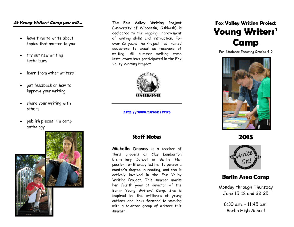 At Young Writers’ Camp you will... have time to write about topics that matter to you try out new writing techniques learn from other writers get feedback on how to improve your writing share your writing with others The Fox Valley Writing Project (University of Wisconsin, Oshkosh) is dedicated to the ongoing improvement of writing skills and instruction. For over 25 years the Project has trained educators to excel as teachers of writing. All summer writing camp instructors have participated in the Fox Valley Writing Project. Fox Valley Writing Project Young Writers’ Camp For Students Entering Grades 4-9 http://www.uwosh/fvwp publish pieces in a camp anthology Staff Notes 2015 Michelle Draves is a teacher of third graders at Clay Lamberton Elementary School in Berlin. Her passion for literacy led her to pursue a master’s degree in reading, and she is actively involved in the Fox Valley Writing Project. This summer marks her fourth year as director of the Berlin Young Writers’ Camp. She is inspired by the brilliance of young authors and looks forward to working with a talented group of writers this summer. Berlin Area Camp Monday through Thursday June 15-18 and 22-25 8:30 a.m. – 11:45 a.m. Berlin High School Young Writers’ Camp Registration 2015 For Students Entering Grades 4-9 Camp Dates: June 15-18 and June 22-25 Location: Berlin High School LMC Name _______________________________________ Address __________________________________________ City ______________________________ Zip __________ E-mail ________________________________________ Home Phone __________________________________ Cell Phone ________________________________________ Emergency Contact Information Name #1 ____________________________________ Name #2 ______________________________________ Phone #1 ____________________________________ Phone #2 _____________________________________ Entering Grade ____ School _____________________ Circle T-shirt size. (Adult sizes) XS Registration Fee $150 on or before May 1 ($160 after May 1) S Registration Deadline M L XL May 15 Please enclose check payable to Fox Valley Writing Project. All checks will be held until June 15, 2015. SCHOLARSHIPS ARE AVAILABLE: PLEASE INQUIRE IF INTERESTED Send registration form and payment to: For more information, including scholarship needs: Michelle Draves, YWC Michelle Draves 259 East Marquette Street Clay Lamberton Elementary Berlin, WI 54923 Phone: 361-2442 Email: [email protected]