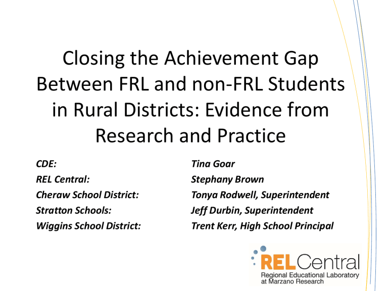 Closing the Achievement Gap Between FRL and non-FRL Students in Rural Districts: Evidence from Research and Practice CDE: REL Central: Cheraw School District: Stratton Schools: Wiggins School District: Tina Goar Stephany Brown Tonya Rodwell, Superintendent Jeff Durbin, Superintendent Trent Kerr, High School Principal Agenda • Fast Facts – A Quiz • What Works for Rural Districts • • – Background: Partnership between REL Central and the Rural Education Council – Identifying Successful Districts – The Success Story of Cheraw – The Success Story of Stratton – The Success Story of Wiggins ACTIVITY Closing 2 Fast Facts True or False? Rural districts comprise more than half of all of the districts in the United States. Look at the distribution of rural districts! –– School Year 2010-11 (NCES, 2013) Fast Facts True or false? Rural schools have higher percentages of students who score proficient and advanced than urban schools. 2011 NAEP reading achievement 4th grade (NCES, 2013) 2011 NAEP reading achievement 8th grade (NCES, 2013) 2011 NAEP Math Achievement 4th grade (NCES, 2013) 2011 NAEP Math Achievement 8th grade (NCES, 2013) Fast Facts • True or false? Rural students are less likely to graduate than their urban peers. Freshman Graduation Rate, Entering 2008-09 (NCES, 2013) The good news…. • Rural districts are doing rather well. Students are generally doing better than their urban counterparts and slightly less well than their suburban counterparts. The not-so-good news • Most rural districts still have a relatively large achievement gap between FRL and non FRL students. • Achievement gaps for rural districts are nearly the same as for urban districts and in some regions, surpass urban districts (Rural Trust, 2013). So what works? • Not much research specifically addressing rural achievement; even less that focuses on the rural achievement gap • Need: summarize the research • Identify practices of successful districts Identifying Districts That Have Closed the Gap: Worked with The Colorado Rural Education Council to identify measures. Colorado Rural District Achievement Gap Closure Indicators for This Year (determined by Alliance members) • • • • • Gap: FRL Indicator: ACT composite (college readiness) Time: 2010-11 through 2014-15 (5 years) Analysis: Trend over time Criteria: • Achievement could not decrease (gaps not closed because the majority group performed poorly) • Districts had to have at least 10 juniors (in 2014/15) • At least 25% FRL (all grades) • Graduation rate greater than the state average of 77%. • At least 2.5 ACT points of gap closure over the 5-year period (2.5 ACT points is about half of a standard deviation in the national distribution of ACT scores.) Using these indicators, 8 rural Colorado districts were found to have closed the ACT gap: Bayfield School District Cheraw School District Limon Public Schools Ouray School District Prairie Public Schools Sargent School District Stratton Schools Wiggins School District Cheraw School District ACT Results 25 0 10 ACT Score CHERAW 31 Composite 2011 2013 Year Black line = non FRL Red line = FRL 17 juniors 2014/15 2015 Presentation: Cheraw School District Practices Superintendent Tonya Rodwell Cheraw School District Characteristics Geography: Located in Southern Colorado, 60 miles east of Pueblo Enrollment is 205 students including full day preschool for 4-year olds and full day kindergarten. 63% of students are free/reduced lunch Cheraw School District Demographics Student population is 74% Caucasian, 25% Hispanic and 1% Native American Total staff of 37 with 20 full-time teachers Budget of $3 million After graduation, students attend college, career and technical education or military service Cheraw School District Challenges Enrollment: has been relatively the same over past 4 years (205-212 students) Budget- lack of resources Recruitment-few applicants for positions (many not certified/highly qualified), funding for salaries and benefits Retaining Staff- low salary base for certified and classified staff, competition with larger districts in the immediate area, multiple preps in a day Technology- first year of 1:1 devices, but no onsite tech director Cheraw Professional Development Professional Development Partner with Battelle for Kids “Teacher Quality Grant Project” Kim Bevel “Gender and the Brain” Colorado Education Initiative “Literacy Design Collaborative” Educator Effectiveness “Principal PLC and Mentoring” Step Up to Writing 6Trait+1 Every Child a Writer Google Training (Chromebooks) Orton Gillingham Training Cheraw Teaching and Learning Practices RTI Process - Assess 3 times a year - Weekly grade level meetings for progress monitoring District wide writing assessment Adopted common vocabulary and rubrics Push in model for academic support especially for middle and high school Added Technology - Elementary computer lab - 1:1 Chromebooks (next year) Use data to drive instructional needs - ACT Prep Course Cheraw Curriculum Practices Common Core Aligned with Colorado Standards Technology based programs Lexia Core 5 Accelerated Reading and Math Edmentum Khan Academy Prodigy New math adoption Envision 2.0 Concurrent Enrollment OJC Classes Colorado On-line classes CTE programs incorporated into core curriculum FCCLA-national qualifiers FBLA- state qualifiers Strong partnership with area businesses for internships and job shadowing Cheraw School District Governance: Instructional Leadership Pk-12 Superintendent has 3 years in administration and instructional leadership Superintendent has a dual role as Elementary Principal 6-12 Principal has 11 years in administration and instructional leadership The 6-12 principal has a dual role as the District Assessment Coordinator We both share the role of Athletic Director As a district we have worked on peer coaching to help with instructional strategies Decisions are collaboratively by staff and administration