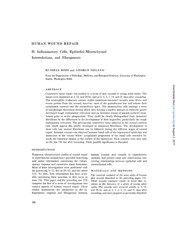 HUMAN WOUND REPAIR II. Inflammatory Cells, Epithelial-Mesenchymal Interrelations, and Fibrogenesis RUSSELL ROSS and GEORGE ODLAND From the Departments of Pathology, Medicine, and Biological Structure, University of Washington Seattle, Washington 98105 Connective tissue repair was studied in a series of skin wounds in young adult males. The tissues were examined at 3, 12, and 24 hr, and at 2, 3, 5, 7, 14, and 21 days after wounding. The neutrophilic leukocytes contain within membrane-bounded vacuoles some fibrin and serum protein from the wound; however, most of the granulocytes lyse and release their cytoplasmic contents into the extracellular space. The mononuclear cells undergo a series of morphologic alterations during which they develop a modest amount of relatively poorly developed rough endoplasmic reticulum and an extensive system of smooth-surfaced membranes prior to active phagocytosis. They could be clearly distinguished from immature fibroblasts by the differences in the development of their organelles, particularly the rough endoplasmic reticulum. The perivascular connective tissue adjacent to the wound contains cells which appear like poorly developed or immature fibroblasts. The development of these cells into mature fibroblasts can be followed during the different stages of wound repair. Intimate contact was observed between basal cells of the regenerated epidermis and monocytes in the wound below: cytoplasmic projections of the basal cells extended beneath the basement lamina to the surface of the monocytes. Such contacts were seen only on the 4th-7th day after wounding. Their possible significance is discussed. INTRODUCTION Numerous ultrastructural studies of wound repair in experimental animals have provided interesting and useful information concerning the inflammatory response and connective tissue formation. Most of these investigations were performed with the guinea pig (1-7), the rat (8-12), and the rabbit (13). To date, little information has been available concerning these processes as they occur in man (14). This paper and the preceding one (15) comprise the first of a series of investigations into various aspects of human wound repair. These studies demonstrate the similarities in the inflammatory response and fibrogenesis between 152 human wounds and wounds in experimenta animals, and present some new observations concerning relationships between epithelial cells and mesenchymal cells. MATERIALS AND METHODS The material consisted of the same series of human skin wounds described in the preceding paper (15). These wounds represent repair of linear skin incisions in the forearms of a series of young adult males. The wounds were removed serially at 3, 12, and 24 hr, and at 2, 3, 5, 7, 14, and 21 days after wounding, and were prepared as previously described Downloaded from jcb.rupress.org on August 2, 2017 ABSTRACT (15). The tissue blocks were oriented so that each thin section contained a cross-section of each wound. Observations were made in an AEI EM6B, an RCA EMU3G, or a Siemens Elmiskop II electron microscope. OBSERVATIONS The Inflammatory Response RUSSELL ROSS AND GEORGE ODLANDI Human Wound Repair. II. 153 Downloaded from jcb.rupress.org on August 2, 2017 THE GRANULOCYTES: At 3 and 12 hr after wounding, the predominant cells in the wound are granulocytes, primarily neutrophilic leukocytes. These cells together with a few mononuclear cells can be seen by 3 hr. They are surrounded by serum protein and strands of fibrin that form a mesh-work throughout the wound. Similar observations were made at 24 hr (Fig. 1). Distal to the wound margin, numerous neutrophilic leukocytes were observed in the process of emigrating from small vessels after 24 hr. After emigrating through the vessel walls, they could sometimes be seen adjacent to perivascular connective tissue cells that resemble poorly differ entiated fibroblasts (Fig. 2), to be described below. As the neutrophilic leukocytes move into the wound, many of them appear to undergo lysis and to release their cytoplasmic granules into the extracellular environment. These extracellular neutrophilic granules often are surrounded by a clear halo (Fig. 1). Some neutrophils can be seen to contain small amounts of fibrin and serum protein in membrane-bounded vacuoles. By 72 hr, the neutrophils have decreased in number within the wound and many of them appear to have been ingested since they are present within large phagocytic vacuoles in macrophages that reached the wound during that time. THE MONONUCLEAR CELL: A few mononuclear cells are present as early as 24 hr after wounding, and they increase in number on the 2nd and 3rd days, becoming the dominant cellular constituent of the wound by the 5th day. Examination of the wounds at various time periods after wounding indicated that the mononuclear cells undergo a series of morphologic changes that accompany the development of phagocytic activity. These changes are described below. After 24 hr relatively poorly developed monocytes are located in the perivascular connective tissue adjacent to the wound (Fig. 3). In contrast to the fibroblasts, which will be described subsequently, the monocytes characteristically have poorly developed rough endoplasmic reticulum and well-developed smooth endoplasmic reticulum and Golgi complex. The mitochondria have a relatively dense matrix and regularly arranged cristae. These cells also contain free ribosomes, a large, prominent, irregularly shaped nucleus, and an irregular, ruffled surface. Little evidence of phagocytic activity is seen in these cells at this early time. In 2- and 3-day wounds, the monocytes contain an increased amount of rough endoplasmic reticulum, although this organelle remains poorly developed in contrast to that of the fibroblast. The cisternae of the rough endoplasmic reticulum have relatively few attached ribosomes, but many free ribosomes are found within the cytoplasm. Numerous mitochondria and relatively wellde