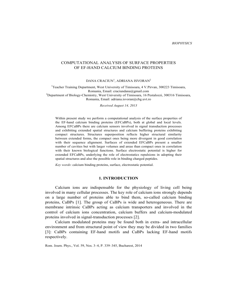 BIOPHYSICS COMPUTATIONAL ANALYSIS OF SURFACE PROPERTIES OF EF-HAND CALCIUM BINDING PROTEINS DANA CRACIUN1, ADRIANA ISVORAN2 1 Teacher Training Department, West University of Timisoara, 4 V.Pirvan, 300223 Timisoara, Romania, Email: [email protected] 2 Department of Biology-Chemistry, West University of Timisoara, 16 Pestalozzi, 300316 Timisoara, Romania, Email: [email protected] Received August 14, 2013 Within present study we perform a computational analysis of the surface properties of the EF-hand calcium binding proteins (EFCaBPs), both at global and local levels. Among EFCaBPs there are calcium sensors involved in signal transduction processes and exhibiting extended spatial structures and calcium buffering proteins exhibiting compact structures. Structures superposition reflects higher structural similarity between extended forms, the compact ones being more divergent in good correlation with their sequence alignment. Surfaces of extended EFCaBPs present a smaller number of cavities but with larger volumes and areas than compact ones in correlation with their known biological functions. Surface electrostatic potential is higher for extended EFCaBPs, underlying the role of electrostatics repulsions in adopting their spatial structures and also the possible role in binding charged peptides. Key words: calcium binding proteins, surface, electrostatic potential. 1. INTRODUCTION Calcium ions are indispensable for the physiology of living cell being involved in many cellular processes. The key role of calcium ions strongly depends on a large number of proteins able to bind them, so-called calcium binding proteins, CaBPs [1]. The group of CaBPs is wide and heterogeneous. There are membrane intrinsic CaBPs acting as calcium transporters and involved in the control of calcium ions concentration, calcium buffers and calcium-modulated proteins involved in signal-transduction processes [2]. Calcium modulated proteins may be found both in extra- and intracellular environment and from structural point of view they may be divided in two families [3]: CaBPs containing EF-hand motifs and CaBPs lacking EF-hand motifs respectively. Rom. Journ. Phys., Vol. 59, Nos. 3–4, P. 339–345, Bucharest, 2014 340 Dana Craciun, Adriana Isvoran 2 Within this study we fix our attention on the EF-hand calcium binding proteins. The EF-hand motif is a structural domain containing a calcium binding loop twelve residues long flanked on both sides by an alpha-helix also twelve residues long [3].The biggest part of CaBPs enclose two domains, N- and Cterminal, each containing two EF-hand motifs and connected by a linker region [4]. Among EF-hand CaBPs there are calcium sensors involved in signal transduction processes and exhibiting open, extended spatial structures and calcium buffering and calcium transporting proteins exhibiting closed, compact structures [5]. The main structural difference between the two categories of EF-hand CaPBs [4] is displayed by the terminal domains linker region that is structured in a straight helix for the calcium sensors (as it is revealed in figure 1 for rabbit skeletal muscle troponin, black) and is unstructured for calcium buffers and calcium transporting proteins (figure 1 for bovine neurocalcin delta - grey). These structures have been retrieved from the Protein Data Bank [6]. Structural dissimilarity of the two categories of EF-hand CaBPs is reflected in their distinct biological functions. Fig. 1 – Superpostion of two structures of EFCaBPs: the extended form of rabbit skeletal muscle troponin in black (PDB code entry 1TN4) and the compact form of bovine neurocalcine delta in grey (PDB entry code 1REC). Tacking into account the involvement of CaBPs in many diseases and the fact that not all of them have determined spatial structures, it becomes important to predict their spatial organizations and their structural and functional properties, respectively. There are in specific literature a few studies concerning the physicochemical factors determining the extended or compact structure of the EF-hand CaBPs [7–9] revealing the involvement of electrostatics interactions [7–8] and the essential role 3 Computational analysis of surface properties of EF-hand calcium binding proteins 341 of the hydrophilicity of resides linking the domains [9]. Also, the concepts of the fractal geometry have been applied to investigate their global structural properties [10–11] illustrating distinct fractal properties of backbones of extended respective compact structures [10] and distinct scaling properties of radius of gyration and surface area of the two categories of EF-hand CaBPs [11] confirming the dissimilar mechanisms responsible for their global folding. Within present study we perform a computational analysis of the surface properties of the two categories of EF-hand CaBPs both at global and local levels and interpret them in terms of specific biological interactions. 2. METHODS Experimentally determined structures of proteins are archived in the Protein Data Bank [6] that we have used in order to retrieve the structural files of EFCaBPs. There are numerous structures of EFCaBPs deposited in PDB, but, with the exception of human centrin 2 (that has experimentally-determined structure only in the presence of a peptide) we have considered in our study only those structures obtained using X-ray diffraction technique and containing the entire protein and the bound calcium ions where it was the case. These proteins are presented in the Table 1. Table 1 The investigated proteins Protein PDB code Conformation 1CLL 4TNC Number of amino acids in structural file 143 159 Human calmodulin Chicken skeletal muscle troponin C Rabbit skeletan muscle troponin C Paramecium tetraurelia calmodulin Potato calmodulin Human calmodulin-like protein Human centrin 2 Bovine recombinant neurocalcin delta Rattus norvegicus calcineurin B Bos Taurus recoverin Amphioxus sarcoplasmic calcium-binding protein Nereis diversicol