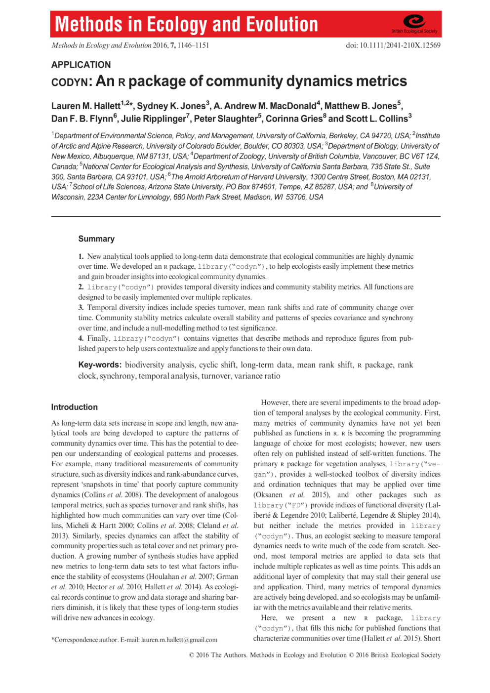 Methods in Ecology and Evolution 2016, 7, 1146–1151 doi: 10.1111/2041-210X.12569 APPLICATION CODYN: An R package of community dynamics metrics Lauren M. Hallett1,2*, Sydney K. Jones3, A. Andrew M. MacDonald4, Matthew B. Jones5, Dan F. B. Flynn6, Julie Ripplinger7, Peter Slaughter5, Corinna Gries8 and Scott L. Collins3 1 Department of Environmental Science, Policy, and Management, University of California, Berkeley, CA 94720, USA; 2Institute of Arctic and Alpine Research, University of Colorado Boulder, Boulder, CO 80303, USA; 3Department of Biology, University of New Mexico, Albuquerque, NM 87131, USA; 4Department of Zoology, University of British Columbia, Vancouver, BC V6T 1Z4, Canada; 5National Center for Ecological Analysis and Synthesis, University of California Santa Barbara, 735 State St., Suite 300, Santa Barbara, CA 93101, USA; 6The Arnold Arboretum of Harvard University, 1300 Centre Street, Boston, MA 02131, USA; 7School of Life Sciences, Arizona State University, PO Box 874601, Tempe, AZ 85287, USA; and 8University of Wisconsin, 223A Center for Limnology, 680 North Park Street, Madison, WI 53706, USA Summary 1. New analytical tools applied to long-term data demonstrate that ecological communities are highly dynamic over time. We developed an R package, library(“codyn”), to help ecologists easily implement these metrics and gain broader insights into ecological community dynamics. 2. library(“codyn”) provides temporal diversity indices and community stability metrics. All functions are designed to be easily implemented over multiple replicates. 3. Temporal diversity indices include species turnover, mean rank shifts and rate of community change over time. Community stability metrics calculate overall stability and patterns of species covariance and synchrony over time, and include a null-modelling method to test significance. 4. Finally, library(“codyn”) contains vignettes that describe methods and reproduce figures from published papers to help users contextualize and apply functions to their own data. Key-words: biodiversity analysis, cyclic shift, long-term data, mean rank shift, clock, synchrony, temporal analysis, turnover, variance ratio Introduction As long-term data sets increase in scope and length, new analytical tools are being developed to capture the patterns of community dynamics over time. This has the potential to deepen our understanding of ecological patterns and processes. For example, many traditional measurements of community structure, such as diversity indices and rank-abundance curves, represent ‘snapshots in time’ that poorly capture community dynamics (Collins et al. 2008). The development of analogous temporal metrics, such as species turnover and rank shifts, has highlighted how much communities can vary over time (Collins, Micheli & Hartt 2000; Collins et al. 2008; Cleland et al. 2013). Similarly, species dynamics can affect the stability of community properties such as total cover and net primary production. A growing number of synthesis studies have applied new metrics to long-term data sets to test what factors influence the stability of ecosystems (Houlahan et al. 2007; Grman et al. 2010; Hector et al. 2010; Hallett et al. 2014). As ecological records continue to grow and data storage and sharing barriers diminish, it is likely that these types of long-term studies will drive new advances in ecology. *Correspondence author. E-mail: [email protected] R package, rank However, there are several impediments to the broad adoption of temporal analyses by the ecological community. First, many metrics of community dynamics have not yet been published as functions in R. R is becoming the programming language of choice for most ecologists; however, new users often rely on published instead of self-written functions. The primary R package for vegetation analyses, library(“vegan”), provides a well-stocked toolbox of diversity indices and ordination techniques that may be applied over time (Oksanen et al. 2015), and other packages such as library(“FD”) provide indices of functional diversity (Laliberte & Legendre 2010; Laliberte, Legendre & Shipley 2014), but neither include the metrics provided in library (“codyn”). Thus, an ecologist seeking to measure temporal dynamics needs to write much of the code from scratch. Second, most temporal metrics are applied to data sets that include multiple replicates as well as time points. This adds an additional layer of complexity that may stall their general use and application. Third, many metrics of temporal dynamics are actively being developed, and so ecologists may be unfamiliar with the metrics available and their relative merits. Here, we present a new R package, library (“codyn”), that fills this niche for published functions that characterize communities over time (Hallett et al. 2015). Short © 2016 The Authors. Methods in Ecology and Evolution © 2016 British Ecological Society CODYN: for ‘community dynamics’, library(“codyn”) functions are explicitly temporal and can be easily implemented over multiple replicates or experimental treatments. Functions in library(“codyn”) fall into two categories: temporal diversity indices and community stability metrics. Below, we describe the metrics by category and demonstrate their application with examples from the Konza Prairie Long-Term Ecological Research (LTER) Site, in Kansas, USA. Temporal diversity indices The diversity indices in library(“codyn”) are temporal analogues to traditional diversity indices such as richness and rank-abundance curves (Table 1). They include species turnover (turnover()), mean shifts in rank abundance (rank_shift()) (Collins et al. 2008) and rate of directional change in community composition over time (rate_change ()) (Collins, Micheli & Hartt 2000). Functions in library (“codyn”) require a data frame (df) with abundance data and grouping variables for time, species and, optionally