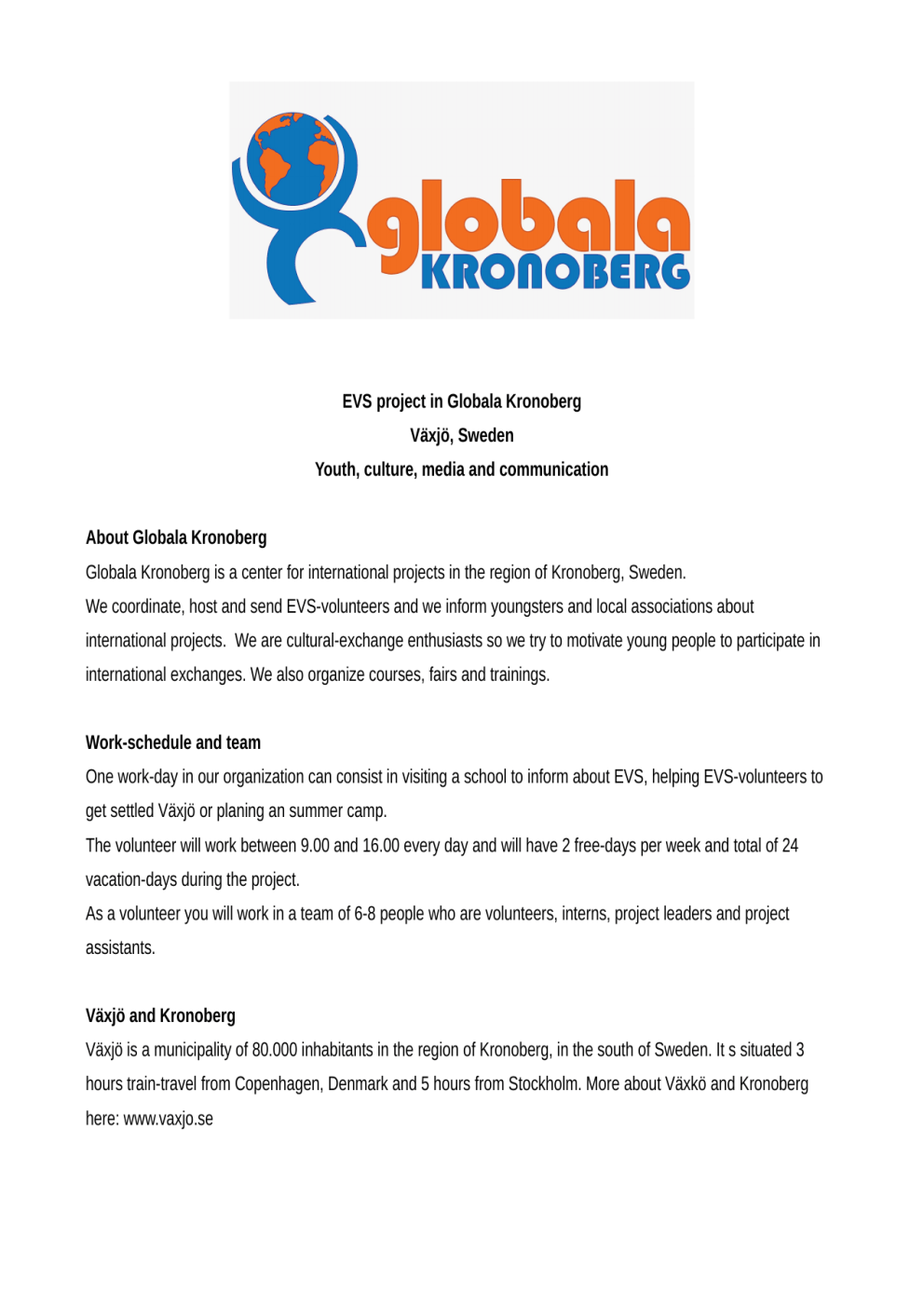 EVS project in Globala Kronoberg Växjö, Sweden Youth, culture, media and communication About Globala Kronoberg Globala Kronoberg is a center for international projects in the region of Kronoberg, Sweden. We coordinate, host and send EVS-volunteers and we inform youngsters and local associations about international projects. We are cultural-exchange enthusiasts so we try to motivate young people to participate in international exchanges. We also organize courses, fairs and trainings. Work-schedule and team One work-day in our organization can consist in visiting a school to inform about EVS, helping EVS-volunteers to get settled Växjö or planing an summer camp. The volunteer will work between 9.00 and 16.00 every day and will have 2 free-days per week and total of 24 vacation-days during the project. As a volunteer you will work in a team of 6-8 people who are volunteers, interns, project leaders and project assistants. Växjö and Kronoberg Växjö is a municipality of 80.000 inhabitants in the region of Kronoberg, in the south of Sweden. It s situated 3 hours train-travel from Copenhagen, Denmark and 5 hours from Stockholm. More about Växkö and Kronoberg here: www.vaxjo.se Accommodation and transport The volunteer will live in shared apartment in a village outside Växjö, having his/her own room and sharing bathroom, kitchen and other common areas. The communication is made by bus between the accommodation and the working place and it will take max 40 minutes (one way travel). The volunteer will receive a bus-card every month for those travels. There is Internet in the accommodation. Food and meals The volunteers receive food-money and pocket every month. Volunteer's role and tasks The volunteer's role in this project is to assist in arranging activities and developing projects. Here are some examples of tasks for the volunteers: - Create promotional material about our activities such as flyers, posters and invitations - Update social media (Facebook, blog, twitter) news, pictures, activities, etc - Plan, prepare and arrange local activities for young people (volunteer meetings, cultural presentations, international camps) - Plan, prepare and arrange introduction for new EVS volunteers - Plan, prepare and arrange presentations about EVS and international projects in different places in the region (employment office, schools, youth organizations) - Create media material to promote EVS in the Region - Document activities through films, pictures and texts Candidates` profile and recruitment process This vacancy is for 1 volunteer in a 12 months project, starting in January 2016. We are looking for a volunteer who: - is interested in international projects and cultural exchanges - enjoys working in a team with people with different backgrounds - is flexible and creative, enjoys both office work (planing, meetings, brainstorming, administration) but also enjoys organizing activities with young people (such as info-presentations, meetings, workshops, etc) - is interested in digital and social media If you are interested in this project, please send your CV and a motivational letter (both documents in English) to [email protected]. Note that you should write “Globala Kronoberg`s project” in the e-mail `s subject, so we can easily recognize the project you are applying for. Your application should be sent before 3th of April 2015. Contact details Globala Kronoberg Infanterigatan 10 352 35 Växjö SWEDEN +46 470 223 40 [email protected] www.globalakronoberg.se www.Facebook.com/GlobalaKronoberg