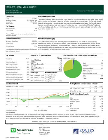 StarCore Global Value Fund® Portfolio Date: 3/31/2017 Maintained by: TD Ameritrade Trust Company www.thestarpathfunds.com Portfolio Construction Fund Profile CUSIP Morningstar Category Manager Name Base Currency 337739510 US SA Mid-Cap Value Matt Lankford US Dollar This equity Fund seeks global diversification across all market capitalizations with a focus on value. Under normal circumstances, this Fund seeks to invest up to 98% of its assets in equity mutual funds. The Fund will primarily invest in domestic value, international value, and emerging markets value mutual funds. The Fund will strive to increase potential expected long-term returns by favoring value over a more traditional “blended” markets or growth-oriented approach. This Fund may be appropriate for long-term investors seeking to be invested in the 0.88 Fund for ten years or more. Fee/ Expense Net Expense Ratio Fee per $1,000 $8.80 *Fee per $1000 is assuming no return and based on total net expense for one year Investment Philosophy Operations Information Net Assets - Share Class 4,220,000 The StarPath Funds® investment philosophy is based on the following core beliefs for equity investing: Diversification reduces risk; Markets are efficient; Asset allocation is the key determinate of portfolio returns; Turnover Ratio % 17.82 Passive management is superior to active management; Asset class investing is superior to indexing. Rogers’ core beliefs for fixed-income investing include: Invest in high-quality, investment grade fixed-income securities *No commissions or redemption fees charged for purchases and and Keep durations and maturities short to intermediate. Inception Date 11/30/2006 sales of interests in the fund Top Holdings Top 5 out of 13,342 Stocks Held Asset Name Port % DFA US Core Equity 2 I 23.19 DFA US Large Cap Value I 23.07 DFA US Small Cap Value I 22.02 DFA International Core Equity I 10.25 Portfolio Date: 3/31/2017 % Cash DFA International Value I 9.05 DFA Emerging Markets Core Equity I 5.42 Equity Style Value % 5.11 Equity Style Core % DFA International Small Cap Value I Federated Treasury Obligations Instl StarCore Global Value Fund® - Asset Allocation (US) Equity Style Fixed Income Style 46.95 Average Credit Quality Average Eff Duration 36.82 Average Eff Maturity 1.89 Equity Style Growth % 16.23 Average Price 67.2 International Equity 29.3 US Fixed Income - International Fixed Income - Other 0.5 Total 100.0 100.06 Investment Growth Trailing Returns - Investment and Category YTD 1 Year 3 Years StarCore Global Value Fund® 3.63 19.88 5.26 US Fund Mid-Cap Value 3.50 18.82 6.99 Time Period: 12/1/2006 to 3/31/2017 25,000.0 20,000.0 Risk & Return Since Inception 15,000.0 10,000.0 5,000.0 0.0 3.0 US Equity 2007 StarCore Global Value Fund® 2009 2011 16,862.3 2013 US Fund Mid-Cap Value 2015 2017 20,150.5 Return Std Dev Population Downside Deviation Alpha Beta R2 Sharpe Ratio (arith) Tracking Error Inv 5.19 18.54 2.51 -1.91 1.07 97.15 0.24 3.38 Cat Avg 6.93 17.04 0.00 0.00 1.00 100.00 0.36 0.00 Principal Risk Performance information reflects past performance and does not guarantee future results. All returns are net of any fees that accrued within the fund, for more information on the fees please visit the fund's web page noted above. Investment return and principal value will fluctuate such that shares, when redeemed, may be worth more or less than their original cost. All returns that exceed 12 months are annualized. Investment Products: Not FDIC Insured - No Bank Guarantee - May Lose Value Trustee: TDA7600 Subadvisor Rogers Wealth Group Craig Rogers 1330 Summit Avenue Fort Worth, TX 76102 T: 866-4-ROGERS Source: Morningstar Direct