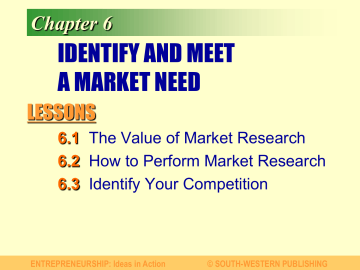 Chapter 6 IDENTIFY AND MEET A MARKET NEED LESSONS 6.1 The Value of Market Research 6.2 How to Perform Market Research 6.3 Identify Your Competition ENTREPRENEURSHIP: Ideas in Action © SOUTH-WESTERN PUBLISHING Chapter 6 Slide 2 Lesson 6.1 THE VALUE OF MARKET RESEARCH GOALS Identify a target market by understanding your customers. Research your market using primary and secondary data. ENTREPRENEURSHIP: Ideas in Action © SOUTH-WESTERN PUBLISHING Chapter 6 Slide 3 WHAT IS A TARGET MARKET? The target market is the individuals or companies that are interested in a particular product or service and are willing and able to pay for it. The marketing concept uses the needs of customers as the primary focus during the planning, production, distribution, and promotion of a product or service. ENTREPRENEURSHIP: Ideas in Action © SOUTH-WESTERN PUBLISHING Chapter 6 Slide 4 UNDERSTAND YOUR CUSTOMER Customers are the people who buy the products and services companies offer. Customers buy goods and services to satisfy economic wants and needs. An economic want is an unfilled desire of a customer. An economic need is anything that is required to live. ENTREPRENEURSHIP: Ideas in Action © SOUTH-WESTERN PUBLISHING DEMOGRAPHICS AND PSYCHOGRAPHICS Chapter 6 Slide 5 Demographics are data that describe a group of people in terms of their age, marital status, family size, ethnicity, gender, profession, education, and income. Psychographics are data that describe a group of people in terms of their tastes, opinions, personality traits, and lifestyle habits. ENTREPRENEURSHIP: Ideas in Action © SOUTH-WESTERN PUBLISHING Chapter 6 Slide 6 IDENTIFY YOUR TARGET MARKET 1. Who are my customers: individuals or companies? 2. If customers are individuals: How old are they? How much money do they earn? Where do they live? How do they spend their time and money? 3. If customers are companies: What industries are they in? Where are those industries located? ENTREPRENEURSHIP: Ideas in Action © SOUTH-WESTERN PUBLISHING Chapter 6 Slide 7 continued IDENTIFY YOUR TARGET MARKET 4. What needs or wants will my product or service satisfy? 5. How many potential customers live in the area in which I want to operate? 6. Where do these potential customers currently buy the products or services I want to sell them? 7. What price are they willing to pay for my products or services? 8. What can I do for my customers that other companies are not already doing for them? ENTREPRENEURSHIP: Ideas in Action © SOUTH-WESTERN PUBLISHING Chapter 6 Slide 8 Determining your Target Market Why is it important to determine who your target market is? Unless you understand who your target market is and what types of products or services they are looking for, you will probably not be able to satisfy their wants and needs. ENTREPRENEURSHIP: Ideas in Action © SOUTH-WESTERN PUBLISHING THE IMPORTANCE OF A CUSTOMER PROFILE Chapter 6 Slide 9 A customer profile is a description of the characteristics of the person or company that is likely to purchase a product or service. ENTREPRENEURSHIP: Ideas in Action © SOUTH-WESTERN PUBLISHING THE IMPORTANCE OF A CUSTOMER PROFILE Chapter 6 Slide 10 The importance of a customer profile will help you understand how to meet customer demand. Understanding your competition will help you identify unmet needs. Disadvantage of market segmentation You might market to a group who is not interested in the product or might overlook a segment that would be very interested in the product. ENTREPRENEURSHIP: Ideas in Action © SOUTH-WESTERN PUBLISHING Chapter 6 Slide 11 MARKET SEGMENTS Groups of customers within a large market who share common characteristics are known as market segments. ENTREPRENEURSHIP: Ideas in Action © SOUTH-WESTERN PUBLISHING Chapter 6 Slide 12 Mass Marketing Advantages of Mass Marketing Easy to prepare advertisements for and reaches many people Disadvantages of Mass Marketing Does not target specific needs of customers Is not suitable for all products Has nothing to make product stand out from the competition ENTREPRENEURSHIP: Ideas in Action © SOUTH-WESTERN PUBLISHING Chapter 6 Slide 13 UNDERSTAND THE COMPETITION Knowing about your competition will help you define your target market. ENTREPRENEURSHIP: Ideas in Action © SOUTH-WESTERN PUBLISHING Chapter 6 Slide 14 MARKET RESEARCH Market research is a system for collecting, recording, and analyzing information about customers, competitors, goods, and services. Market researchers collect primary and secondary data. If conducted properly, market research will help entrepreneurs understand their target markets and thus, satisfy the wants and needs of the customers. ENTREPRENEURSHIP: Ideas in Action © SOUTH-WESTERN PUBLISHING Chapter 6 Slide 15 Limitations of Market Research Can be costly Time consuming Must be carefully analyzed so that incorrect decisions are not made ENTREPRENEURSHIP: Ideas in Action © SOUTH-WESTERN PUBLISHING Chapter 6 Slide 16 SECONDARY DATA Secondary data is data found in already published sources. ENTREPRENEURSHIP: Ideas in Action © SOUTH-WESTERN PUBLISHING Chapter 6 Slide 17 PLACES TO FIND SECONDARY DATA Publications issued by government and community organizations, such as the U.S. Census Bureau, the Small Business Administration, and Chamber of Commerce Books about specific industries Information on web sites for government and businesses Books about other entrepreneurs who set up similar businesses Specialized magazines and journals devoted to particular fields Newspaper articles and statistics ENTREPRENEURSHIP: Ideas in Action © SOUTH-WESTERN PUBLISHING Chapter 6 Slide 18 Secondary Sources Information you can find using secondary sources include information on: Demographics Economic trends Industry forecasts ENTREPRENEURSHIP: Ideas in Action © SOUTH-WESTERN PUBLISHING Chapter 6 Slide 19 PRIMARY DATA Primary data is information collected for the very first time to fit a specific purpose. Questionnaire or survey Observation Focus grou