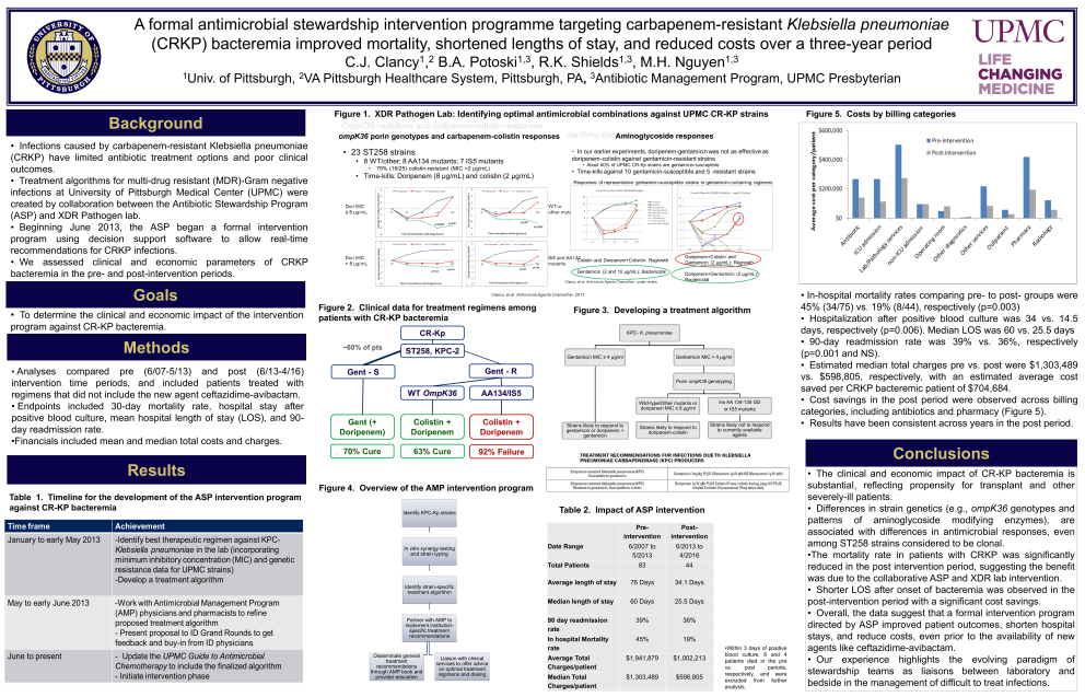 A formal antimicrobial stewardship intervention programme targeting carbapenem-resistant Klebsiella pneumoniae (CRKP) bacteremia improved mortality, shortened lengths of stay, and reduced costs over a three-year period C.J. 1Univ. 1 2 Clancy , B.A. 1,3 Potoski , R.K. 1,3 Shields , M.H. 1,3 Nguyen of Pittsburgh, 2VA Pittsburgh Healthcare System, Pittsburgh, PA, 3Antibiotic Management Program, UPMC Presbyterian Background Figure 1. XDR Pathogen Lab: Identifying optimal antimicrobial combinations against UPMC CR-KP strains Aminoglycoside responses ompK36 porin genotypes and carbapenem-colistin responses • Infections caused by carbapenem-resistant Klebsiella pneumoniae (CRKP) have limited antibiotic treatment options and poor clinical outcomes. • Treatment algorithms for multi-drug resistant (MDR)-Gram negative infections at University of Pittsburgh Medical Center (UPMC) were created by collaboration between the Antibiotic Stewardship Program (ASP) and XDR Pathogen lab. • Beginning June 2013, the ASP began a formal intervention program using decision support software to allow real-time recommendations for CRKP infections. • We assessed clinical and economic parameters of CRKP bacteremia in the pre- and post-intervention periods. Table 4. Breakdown of hospital charges Goals • To determine the clinical and economic impact of the intervention Figure 5. Costs by billing categories Figure 2. Clinical data for treatment regimens among patients with CR-KP bacteremia Figure 3. Developing a treatment algorithm program against CR-KP bacteremia. KPC- K. pneumoniae Methods Gentamicin MIC ≤ 4 µg/ml Gentamicin MIC > 4 µg/ml • Analyses compared pre (6/07-5/13) and post (6/13-4/16) intervention time periods, and included patients treated with regimens that did not include the new agent ceftazidime-avibactam. • Endpoints included 30-day mortality rate, hospital stay after positive blood culture, mean hospital length of stay (LOS), and 90day readmission rate. •Financials included mean and median total costs and charges. Porin ompK36 genotyping Strains likely to respond to gentamicin or doripenem + gentamicin Wild-type/Other mutants or doripenem MIC ≤ 8 µg/ml Ins AA 134-135 GD or IS5 mutants Strains likely to respond to doripenem-colistin Strains likely not to respond to currently available agents • In-hospital mortality rates comparing pre- to post- groups were 45% (34/75) vs. 19% (8/44), respectively (p=0.003) • Hospitalization after positive blood culture was 34 vs. 14.5 days, respectively (p=0.006). Median LOS was 60 vs. 25.5 days • 90-day readmission rate was 39% vs. 36%, respectively (p=0.001 and NS). • Estimated median total charges pre vs. post were $1,303,489 vs. $598,805, respectively, with an estimated average cost saved per CRKP bacteremic patient of $704,684. • Cost savings in the post period were observed across billing categories, including antibiotics and pharmacy (Figure 5). • Results have been consistent across years in the post period. Conclusions Results Figure 4. Overview of the AMP intervention program Table 1. Timeline for the development of the ASP intervention program against CR-KP bacteremia Identify KPC-Kp strains In vitro synergy testing and strain typing Table 2. Impact of ASP intervention Preintervention Postintervention 6/2007 to 5/2013 6/2013 to 4/2016 83 44 Average length of stay 76 Days 34.1 Days Median length of stay 60 Days 25.5 Days 90 day readmission rate 39% 36% In hospital Mortality rate 45% 19% Date Range Total Patients Identify strain-specific treatment algorithm Partner with AMP to implement institutionspecific treatment recommendations Disseminate general treatment recommendations through AMP book and provider education Liaison with clinical services to offer advice on optimal treatment regimens and dosing Average Total Charges/patient $1,941,879 $1,002,213 Median Total Charges/patient $1,303,489 $598,805 •Within 3 days of positive blood culture, 8 and 4 patients died in the pre vs. post periods, respectively, and were excluded from further analysis. • The clinical and economic impact of CR-KP bacteremia is substantial, reflecting propensity for transplant and other severely-ill patients. • Differences in strain genetics (e.g., ompK36 genotypes and patterns of aminoglycoside modifying enzymes), are associated with differences in antimicrobial responses, even among ST258 strains considered to be clonal. •The mortality rate in patients with CRKP was significantly reduced in the post intervention period, suggesting the benefit was due to the collaborative ASP and XDR lab intervention. • Shorter LOS after onset of bacteremia was observed in the post-intervention period with a significant cost savings. • Overall, the data suggest that a formal intervention program directed by ASP improved patient outcomes, shorten hospital stays, and reduce costs, even prior to the availability of new agents like ceftazidime-avibactam. • Our experience highlights the evolving paradigm of stewardship teams as liaisons between laboratory and bedside in the management of difficult to treat infections.