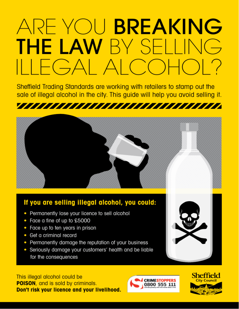 ARE YOU BREAKING THE LAW BY SELLING ILLEGAL ALCOHOL? Sheffield Trading Standards are working with retailers to stamp out the sale of illegal alcohol in the city. This guide will help you avoid selling it. If you are selling illegal alcohol, you could: • • • • • • Permanently lose your licence to sell alcohol Face a fine of up to £5000 Face up to ten years in prison Get a criminal record Permanently damage the reputation of your business Seriously damage your customers’ health and be liable for the consequences This illegal alcohol could be POISON, and is sold by criminals. Don't risk your licence and your livelihood. What is illegal alcohol? There are 2 main types of illegal alcohol: counterfeit and duty diverted. Counterfeit alcohol: fake alcohol that has been illegally produced by criminal gangs and labelled as a genuine product. We have seized hundreds of bottles of this locally. We’ve tested them and they’re not safe to drink due to the chemicals in them and because you can’t trust the stated alcoholic strength. Duty Diverted alcohol: genuine branded alcohol, produced by legitimate drinks companies, that has been stolen in bulk. It is sold on to businesses, often at the same price as genuine duty-paid alcohol, leaving businesses at risk of prosecution from Her Majesty’s Revenue and Customs (HMRC), whilst maximising the profits of criminals. ILLEGAL ALCOHOL: SEVEN SIGNS TO LOOK FOR 1 2 The label may be at an incorrect angle. The label may feel bumpy or there may be glue around the edges. 3 4 There may be an unfamiliar brand name. There may be spelling mistakes on the bottle. 5 There may be no manufacturer or importer name and address. 6 The duty stamp may be incorrect. It may be the wrong size or be for the wrong product (e.g. a whisky stamp on a vodka bottle). 7 There may be sediments in the bottle. You can avoid buying this illegal alcohol by following these simple steps • Buy your alcohol from a reputable seller – never buy alcohol from anyone bringing goods into your shop • Always get a valid receipt when you buy any stock – it should include the company number, name, address and VAT number • Take control of your stock – mark your boxes with supplier name and date of purchase • Don’t be afraid to ask a supplier for their contact details • Check that products carry legitimate UK duty stamps Retailers selling this illegal booze are pricing you out unfairly, lying to customers, damaging the retail sector in Sheffield and acting illegally. If you think you have been sold illegal alcohol, or if you suspect another retailer is selling it, you can call us anonymously at Sheffield Trading Standards on: 0845 404 0506 or Crimestoppers on: 0800 555 111 or visit: www.drinkaware.co.uk Remember: you may think you’re on to a bargain by buying this booze, but you will pay a much bigger price in the long run. This document can be supplied in alternative formats, please contact: 0845 404 0506 Illegal Alcohol: Let’s Stamp it Out DP14298