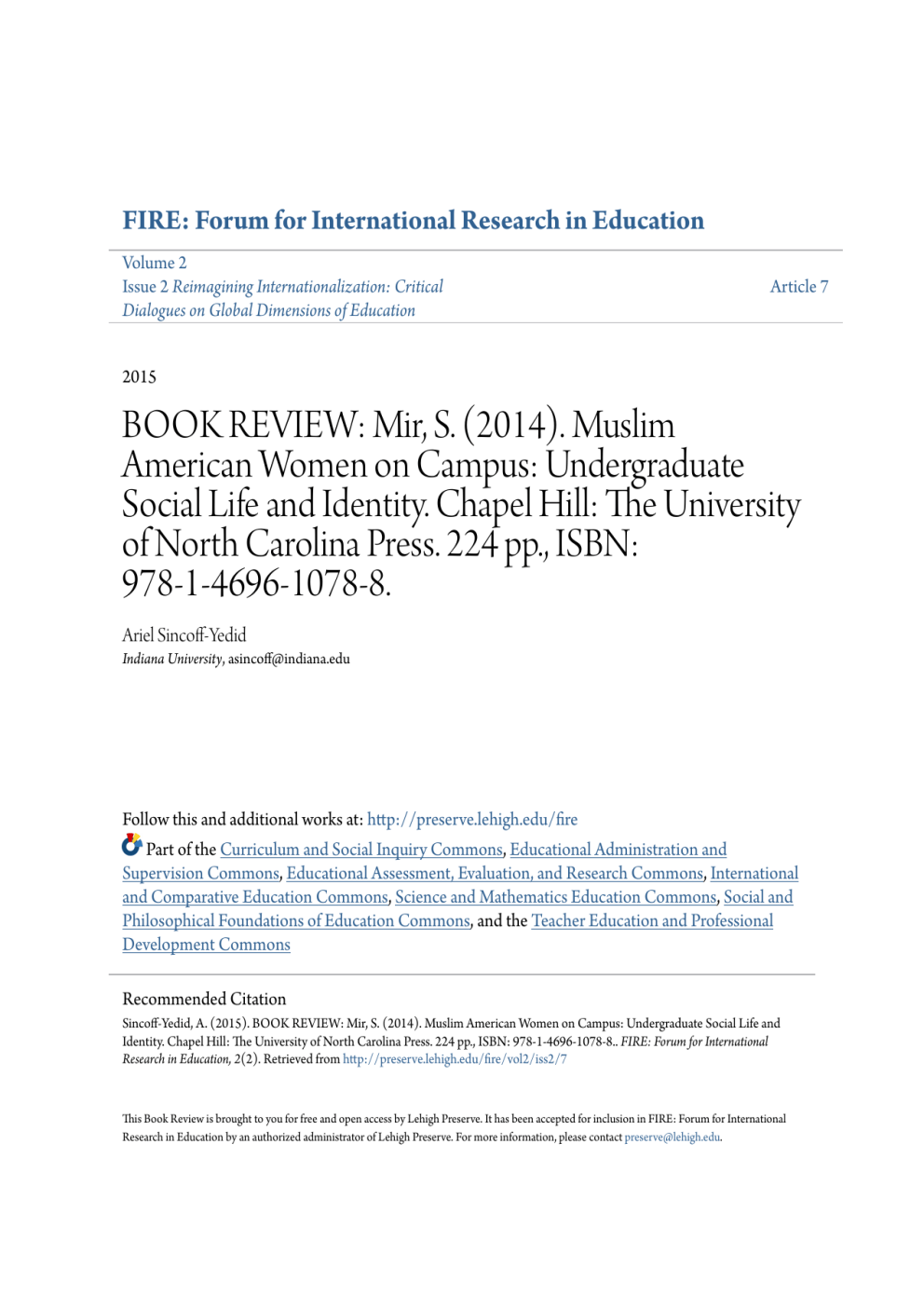 FIRE: Forum for International Research in Education Volume 2 Issue 2 Reimagining Internationalization: Critical Dialogues on Global Dimensions of Education Article 7 2015 BOOK REVIEW: Mir, S. (2014). Muslim American Women on Campus: Undergraduate Social Life and Identity. Chapel Hill: The University of North Carolina Press. 224 pp., ISBN: 978-1-4696-1078-8. Ariel Sincoff-Yedid Indiana University, [email protected] Follow this and additional works at: http://preserve.lehigh.edu/fire Part of the Curriculum and Social Inquiry Commons, Educational Administration and Supervision Commons, Educational Assessment, Evaluation, and Research Commons, International and Comparative Education Commons, Science and Mathematics Education Commons, Social and Philosophical Foundations of Education Commons, and the Teacher Education and Professional Development Commons Recommended Citation Sincoff-Yedid, A. (2015). BOOK REVIEW: Mir, S. (2014). Muslim American Women on Campus: Undergraduate Social Life and Identity. Chapel Hill: The University of North Carolina Press. 224 pp., ISBN: 978-1-4696-1078-8.. FIRE: Forum for International Research in Education, 2(2). Retrieved from http://preserve.lehigh.edu/fire/vol2/iss2/7 This Book Review is brought to you for free and open access by Lehigh Preserve. It has been accepted for inclusion in FIRE: Forum for International Research in Education by an authorized administrator of Lehigh Preserve. For more information, please contact [email protected]. BOOK REVIEW: Mir, S. (2014). Muslim American Women on Campus: Undergraduate Social Life and Identity. Chapel Hill: The University of North Carolina Press. 224 pp., ISBN: 978-1-4696-1078-8. Abstract BOOK REVIEW: Mir, S. (2014). Muslim American Women on Campus: Undergraduate Social Life and Identity. Chapel Hill: The University of North Carolina Press. 224 pp., ISBN: 978-1-4696-1078-8. Keywords Muslim Women in Higher Education, Religious Identity, Gender and Sexuality, Campus Climate and Social Structure, Orientalism and Minority Identity Cover Page Footnote Correspondence: Ariel Sincoff-Yedid, Department of Gender Studies, Memorial Hall East Rm. 130, 1021 East Third St., Bloomington, IN 47405, USA; email: [email protected]. This book review is available in FIRE: Forum for International Research in Education: http://preserve.lehigh.edu/fire/vol2/iss2/7 FIRE - Forum for International Research in Education Vol. 2, Iss. 2, 2015, pp. 88-92 BOOK REVIEW: MIR, S. (2014). Muslim American Women on Campus: Undergraduate Social Life and Identity. Chapel Hill, NC: The University of North Carolina Press. 224 pp., ISBN: 978-1-4696-1078-8. Ariel Sincoff-Yedid1 Indiana University, USA In Muslim American Women on Campus, Shabana Mir illuminates the ways that collegiate Muslim women on two university campuses navigate the complexities of campus culture and social interaction. Her research, grounded in anthropology and conducted primarily in the years 2002 and 2003, highlights how the intersections of religion/religiosity, gender, sexuality, age, ethnic and national origin, and educational status distinctly shape these undergraduate students’ experiences and means of navigating the social world of university life. Mir’s emphasis on the women’s stories throughout the text contributes demonstrably to the growing and critically needed body of scholarship on Muslims in America, and focuses on the formative period of undergraduate education in the lives of American Muslim young women. Muslim American Women on Campus draws new attention to the importance of adequately addressing religion and its influence on daily practices in the university setting, especially the social world outside the classroom. It is a key resource both for scholars of religious and gendered identities and for university educators and administrators seeking to more thoroughly understand and incorporate Muslim perspectives and needs. The stories and experiences presented in Muslim American Women on Campus are drawn from Mir’s interviews with and observations of 26 Muslim undergraduate women at Georgetown University and The George Washington University. Mir structures the three topical sections of the book around the subjects that her research participants brought up most frequently and most saliently: alcohol, dress, and dating. The book primarily focuses on undergraduate life outside the classroom, though participants’ relevant classroom experiences are addressed where needed. This focus on the social world of campus life illustrates the many ways that college experiences socialize and affect American Muslim women, and locates Mir’s analysis in the ways these women cope, assert their identities, and grow into adult Muslims. She finds that her research participants experience a double scrutiny – both from within their Correspondence: Ariel Sincoff-Yedid, Indiana University, Department of Gender Studies, Memorial Hall E., 130, 1021 East Third St., Bloomington, IN 47405-7105; Email: [email protected] 1 © Lehigh University 89 A. Sincoff-Yedid own community and from the dominant majority community – but that they have been able to create third spaces and develop individual identities despite these competing pressures. Mir situates her research findings in the critiques of Orientalism and essentialism, two methods of reinforcing difference and otherness in the construction of a (usually minority) group identity. She concludes that the racist Orientalist stereotyping and the damage to Muslim identity evident in her data are enduring features of both American culture and higher education and did not arise in the aftermath of the September 11th attacks. Mir also identifies the intersections of Orientalism and gender, both in terms of the sexist portrayals of Muslims from outside the community and also in how Muslims themselves may reinforce double standards and inequity in relation to gender and sexuality. The interactions between America and Islam as conceptual frames