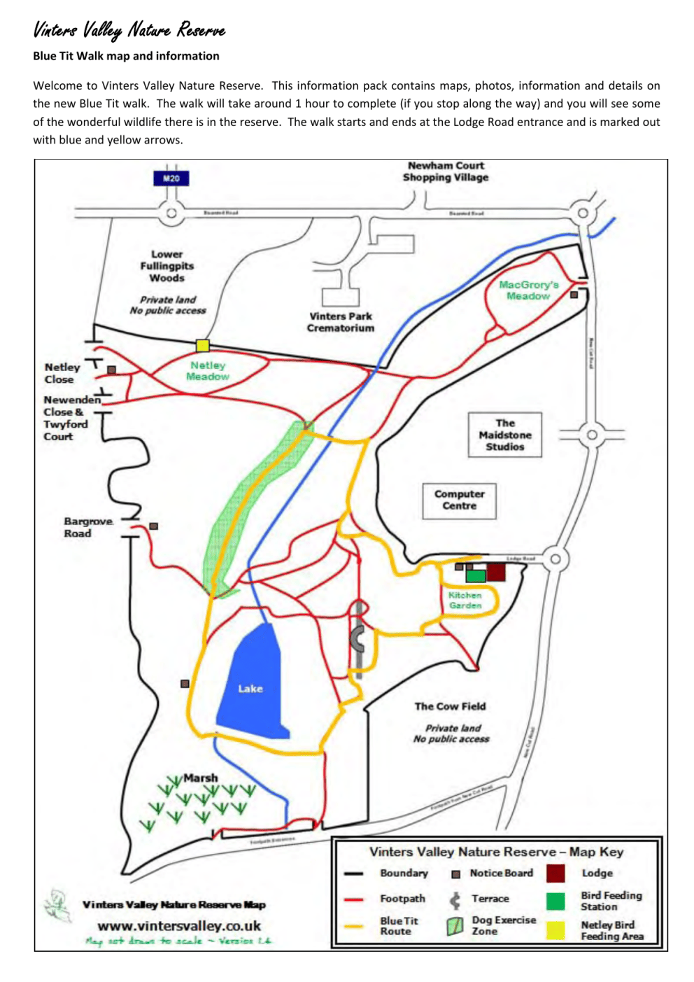 Vinters Valley Nature Reserve Blue Tit Walk map and information Welcome to Vinters Valley Nature Reserve. This information pack contains maps, photos, information and details on the new Blue Tit walk. The walk will take around 1 hour to complete (if you stop along the way) and you will see some of the wonderful wildlife there is in the reserve. The walk starts and ends at the Lodge Road entrance and is marked out with blue and yellow arrows. Stop 1: Lodge Feeding Station & Notice Board As you start your walk, you will see our Bird Feeding Station and notice board. By taking a look through one of the windows, you have the chance to see and photograph around eight different species of birds. The notice board also contains some of the photos taken and general information on birds found and seen in the reserve. Continue down the path. Some of the species you are likely to see at The Feeding Station: Blue Tit Great Tit Nuthatch Chaffinch Robin Dunnock Bird Feeding Station & Notice Board Stop 2: Lodge Notice Board The Lodge notice board contains details about our visitors guide lines, useful contact information, details about the reserve and information on how you can join our “Friends of the Reserve” scheme. Walk through the iron gates to continue your walk. Lodge Road Entrance Notice Board Stop 3 The notice board in this area contains information on the history of the reserve. The stack of logs next to it is a stag beetle pyramid. The pyramid will provide habitat for the beetle and other insects. Follow the path round to continue your walk. History Notice Board area Stop 4 Turn left to continue your walk. Turn left to continue your walk Stop 5 – The Kitchen Garden (Stage 1) Take a few minutes to just stop, look and listen here. As the Bird Feeding Station backs onto this pathway, you have a good chance of hearing and seeing a number of bird species. Follow the pathway along to continue with your walk. Entrance into the Kitchen Garden Stop 6 – The Kitchen Garden (Stage 2) Located on the tree is one of the many bird boxes located around the reserve. Why not take just a few minutes (in April & May) to see if you can spot any birds going into the box? Follow the pathway round to continue your walk. Kitchen Garden – Bird Box 1 Stop 7 – The Kitchen Garden (Stage 3) Another bird box is located on the Oak tree, were you have a chance to see Blue Tits or Great Tits coming in and out (April‐May). By turning right, you can visit the wildlife pond and take a rest on the seat. The clearing is a great place to stop and listen. Bullfinches can be seen flying through and sometimes even a fox can be seen dosing in the sun, if you are quiet. To continue with your walk follow the pathway along. The Kitchen Garden The Kitchen Garden The Kitchen Garden Wildlife Pond Area Fox Stop 8 – The Kitchen Garden (Stage 4) Follow the pathway round to continue your walk. The Kitchen Garden Stop 9 – The Kitchen Garden (Stage 5) When it is quiet here you have a good chance of seeing some of the resident birds. Species include: Blue Tit, Great Tit, Robin, Wren, Dunnock, and Blackbird. Follow the pathway round to the right to continue your walk. The Kitchen Garden The Kitchen Garden Stop 10 – The Kitchen Garden (Stage 6) In July & August the Buddleia bushes provide important nectar sources for bees and butterflies. Butterflies include: Red Admiral, Peacock, Painted Lady, Comma, Large White, Small White and Green‐veined White. Follow the pathway round to continue your walk. Some of the butterfly species you are likely to see here: Red Admiral Peacock Comma Painted Lady Large White The Kitchen Garden (Buddleia Bushes) Stop 11 – The Kitchen Garden (Stage 7) The house used to stand where the Poplar Trees are now. You can find out more about the history by purchasing one of our books. Follow the pathway round to continue your walk. Were the Poplar Trees are now used to be where the house once stood Stop 12 – The Terrace Area (Stage 1) Follow the pathway round, to the left, to continue your walk. The Kitchen Garden Terrace Area Stop 13 – The Terrace Area (Stage 2) Why not take a stop, have a rest and sit down for a few minutes? Just sitting here quietly you have a great chance of seeing and hearing some of the wildlife found in the reserve. During July and August you will also see butterflies and bees on the Buddleia bush. Follow the pathway down to continue with your walk. Terrace Area Stop 14 – Towards the Lake (Stage 1) Robins, Wrens, Dunnocks and sometimes Treecreepers can be seen here. Follow the pathway down to continue with your walk. The Kitchen Garden Pathway towards the Lake Stop 15 – Towards the Lake (Stage 2) The hedgerow along the Cow Field provides excellent places for many bird species to nest in. Bullfinches are also found along the hedge. Each year a section of the hedge is cut to allow fresh regrowth. Follow the pathway down to continue with your walk. Once at the crossroads turn right, towards The Lake. Hedgerow and pathway towards the Lake Stop 16 – The Lake There are many species of birds you may see on the lake and its surrounding area. Species include: Mallard (Duck), Coot, Moorhen, Grey Heron, Kingfisher (if you are lucky) and Canada Goose. The Lake is also used by other wildlife. Species include: Toad, Frog & Dragonflies. In March 2010 a Toad Survey was carried out and an impressive total of over 154 were recorded in one night. The Lake is now recorded as a key site for Toads with KRAG (Conservation Group). Frogs also spawn here and it is possible to see Tadpoles later in the spring and summer. Dragonflies also use the Lake to lay their eggs in. There is also a notice board with details about the reserve. Follow the pathway up to continue with your walk. Some of the wildlife you are likely to see here: The Kitchen Garden Duck Frog Toad Canada Goose Moorhen Common Darter The Lake Stop 17 It is nice to sit here and just watch to see what wildlife is about. Species include: Blue