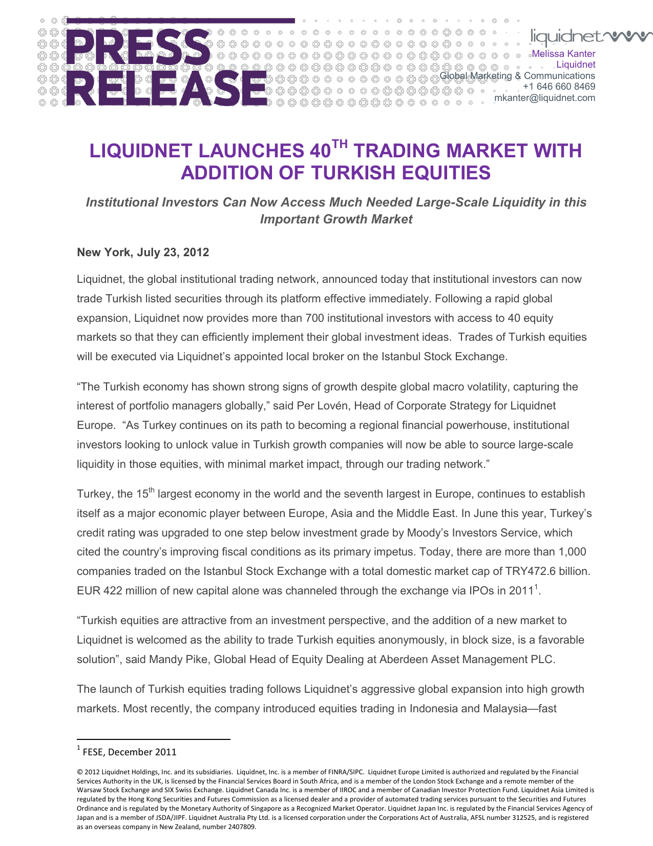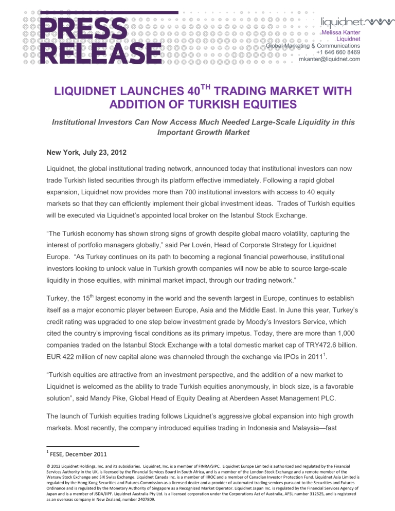 Melissa Kanter Liquidnet Global Marketing & Communications +1 646 660 8469 [email protected] LIQUIDNET LAUNCHES 40TH TRADING MARKET WITH ADDITION OF TURKISH EQUITIES Institutional Investors Can Now Access Much Needed Large-Scale Liquidity in this Important Growth Market New York, July 23, 2012 Liquidnet, the global institutional trading network, announced today that institutional investors can now trade Turkish listed securities through its platform effective immediately. Following a rapid global expansion, Liquidnet now provides more than 700 institutional investors with access to 40 equity markets so that they can efficiently implement their global investment ideas. Trades of Turkish equities will be executed via Liquidnet’s appointed local broker on the Istanbul Stock Exchange. ―The Turkish economy has shown strong signs of growth despite global macro volatility, capturing the interest of portfolio managers globally,‖ said Per Lovén, Head of Corporate Strategy for Liquidnet Europe. ―As Turkey continues on its path to becoming a regional financial powerhouse, institutional investors looking to unlock value in Turkish growth companies will now be able to source large-scale liquidity in those equities, with minimal market impact, through our trading network.‖ Turkey, the 15th largest economy in the world and the seventh largest in Europe, continues to establish itself as a major economic player between Europe, Asia and the Middle East. In June this year, Turkey’s credit rating was upgraded to one step below investment grade by Moody’s Investors Service, which cited the country’s improving fiscal conditions as its primary impetus. Today, there are more than 1,000 companies traded on the Istanbul Stock Exchange with a total domestic market cap of TRY472.6 billion. EUR 422 million of new capital alone was channeled through the exchange via IPOs in 20111. ―Turkish equities are attractive from an investment perspective, and the addition of a new market to Liquidnet is welcomed as the ability to trade Turkish equities anonymously, in block size, is a favorable solution‖, said Mandy Pike, Global Head of Equity Dealing at Aberdeen Asset Management PLC. The launch of Turkish equities trading follows Liquidnet’s aggressive global expansion into high growth markets. Most recently, the company introduced equities trading in Indonesia and Malaysia—fast 1 FESE, December 2011 © 2012 Liquidnet Holdings, Inc. and its subsidiaries. Liquidnet, Inc. is a member of FINRA/SIPC. Liquidnet Europe Limited is authorized and regulated by the Financial Services Authority in the UK, is licensed by the Financial Services Board in South Africa, and is a member of the London Stock Exchange and a remote member of the Warsaw Stock Exchange and SIX Swiss Exchange. Liquidnet Canada Inc. is a member of IIROC and a member of Canadian Investor Protection Fund. Liquidnet Asia Limited is regulated by the Hong Kong Securities and Futures Commission as a licensed dealer and a provider of automated trading services pursuant to the Securities and Futures Ordinance and is regulated by the Monetary Authority of Singapore as a Recognized Market Operator. Liquidnet Japan Inc. is regulated by the Financial Services Agency of Japan and is a member of JSDA/JIPF. Liquidnet Australia Pty Ltd. is a licensed corporation under the Corporations Act of Australia, AFSL number 312525, and is registered as an overseas company in New Zealand, number 2407809. becoming two of the region’s most actively traded markets and clearly signaling investors’ appetite for new performance opportunities. About Liquidnet Liquidnet is the global institutional trading network that connects equity investors with the liquidity they need– in size, at any time, from anywhere. We go beyond what the retail market can provide by defending and securing the integrity and the anonymity of the block trade. We do this while continuously looking for ways to bring in new sources of safe, actionable liquidity from asset management firms, exchanges, brokers and corporations. Since we launched in 2001, our ability to anticipate and meet institutional demand has allowed us to extend trading to 40 equity markets across five continents for asset management firms who collectively manage US$12.4 trillion. For more information on the Liquidnet community, its liquidity, block executions, and additional investment capabilities, visit www.liquidnet.com.