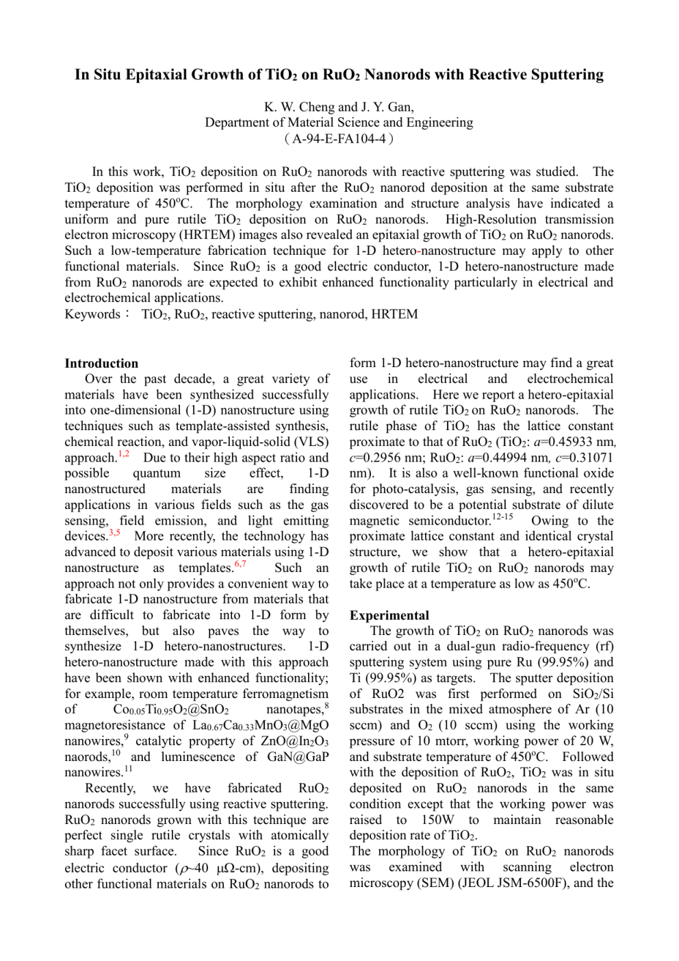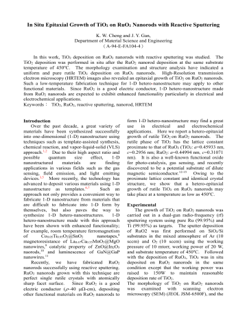 In Situ Epitaxial Growth of TiO2 on RuO2 Nanorods with Reactive Sputtering K. W. Cheng and J. Y. Gan, Department of Material Science and Engineering (A-94-E-FA104-4) In this work, TiO2 deposition on RuO2 nanorods with reactive sputtering was studied. The TiO2 deposition was performed in situ after the RuO2 nanorod deposition at the same substrate temperature of 450oC. The morphology examination and structure analysis have indicated a uniform and pure rutile TiO2 deposition on RuO2 nanorods. High-Resolution transmission electron microscopy (HRTEM) images also revealed an epitaxial growth of TiO2 on RuO2 nanorods. Such a low-temperature fabrication technique for 1-D hetero-nanostructure may apply to other functional materials. Since RuO2 is a good electric conductor, 1-D hetero-nanostructure made from RuO2 nanorods are expected to exhibit enhanced functionality particularly in electrical and electrochemical applications. Keywords: TiO2, RuO2, reactive sputtering, nanorod, HRTEM Introduction Over the past decade, a great variety of materials have been synthesized successfully into one-dimensional (1-D) nanostructure using techniques such as template-assisted synthesis, chemical reaction, and vapor-liquid-solid (VLS) approach.1,2 Due to their high aspect ratio and possible quantum size effect, 1-D nanostructured materials are finding applications in various fields such as the gas sensing, field emission, and light emitting devices.3,5 More recently, the technology has advanced to deposit various materials using 1-D nanostructure as templates.6,7 Such an approach not only provides a convenient way to fabricate 1-D nanostructure from materials that are difficult to fabricate into 1-D form by themselves, but also paves the way to synthesize 1-D hetero-nanostructures. 1-D hetero-nanostructure made with this approach have been shown with enhanced functionality; for example, room temperature ferromagnetism of Co0.05Ti0.95O2@SnO2 nanotapes,8 magnetoresistance of La0.67Ca0.33MnO3@MgO nanowires,9 catalytic property of ZnO@In2O3 naorods,10 and luminescence of GaN@GaP nanowires.11 Recently, we have fabricated RuO2 nanorods successfully using reactive sputtering. RuO2 nanorods grown with this technique are perfect single rutile crystals with atomically sharp facet surface. Since RuO2 is a good electric conductor (~40 -cm), depositing other functional materials on RuO2 nanorods to form 1-D hetero-nanostructure may find a great use in electrical and electrochemical applications. Here we report a hetero-epitaxial growth of rutile TiO2 on RuO2 nanorods. The rutile phase of TiO2 has the lattice constant proximate to that of RuO2 (TiO2: a=0.45933 nm, c=0.2956 nm; RuO2: a=0.44994 nm, c=0.31071 nm). It is also a well-known functional oxide for photo-catalysis, gas sensing, and recently discovered to be a potential substrate of dilute magnetic semiconductor.12-15 Owing to the proximate lattice constant and identical crystal structure, we show that a hetero-epitaxial growth of rutile TiO2 on RuO2 nanorods may take place at a temperature as low as 450oC. Experimental The growth of TiO2 on RuO2 nanorods was carried out in a dual-gun radio-frequency (rf) sputtering system using pure Ru (99.95%) and Ti (99.95%) as targets. The sputter deposition of RuO2 was first performed on SiO2/Si substrates in the mixed atmosphere of Ar (10 sccm) and O2 (10 sccm) using the working pressure of 10 mtorr, working power of 20 W, and substrate temperature of 450oC. Followed with the deposition of RuO2, TiO2 was in situ deposited on RuO2 nanorods in the same condition except that the working power was raised to 150W to maintain reasonable deposition rate of TiO2. The morphology of TiO2 on RuO2 nanorods was examined with scanning electron microscopy (SEM) (JEOL JSM-6500F), and the overall structure information was obtained with X-ray diffraction (XRD) using Cu Kα radiation (λ=1.54056Å) (Rigaku). Detail structure identification and composition analysis of individual nanorod was also performed with high-resolution transmission electron microscopy (HRTEM) (JEM-3000F) and energy dispersive x-ray spectroscopy (EDS) attached. Results and Discussion Figure 1(a) shows the cross-section view of RuO2 nanorods before TiO2 deposition. As illustrated, RuO2 nanorods are densely and uniformly populated on the SiO2/Si substrate. Although RuO2 nanorods are straight and faceted, they are randomly oriented with different length and width that can be up to 5 um high and 100 nm thick. The figure also suggests that RuO2 nanorods are resulted from the free growth of some nuclei initially formed on the substrate. These nuclei may possess facets on which RuO2 incorporation rate is exceedingly higher than the average growth rate of nuclei. Figures 1(b) shows the cross-section view of RuO2 nanorods after TiO2 deposition. Compared to the previous figure, RuO2 nanorod is no longer straight but bends smoothly into an arc. The bending may be ascribed to the shadowing effect of TiO2 deposition and the misfit of thermal expansion between TiO2 and RuO2. The former also explains no appreciable accumulation of TiO2 at the root of nanorods. It is however interesting to note that most nanorods seem to remain the same width from the root to top, indicating a uniform TiO2 deposition along the entire RuO2 nanorod. Figure 2 is the XRD patterns derived from RuO2 nanorods with TiO2 deposition for various lengths of time. In the XRD pattern of bare RuO2 nanorods, three peaks corresponding to (110)-, (101)-, and (211)-diffraction of rutile RuO2 are clearly visible. Compared to the RuO2 powder diffraction data shown in JCPDS 43-1027, peak intensity of (101) derived is abnormally higher than that of (110), which signifies the nanorod growth is not perfectly random. By increasing TiO2 deposition, peak intensity of (110)-diffraction also increases, while (101)-diffraction reduces its intensity and finally splits into two. Besides that, no other diffraction was found with TiO2 deposi