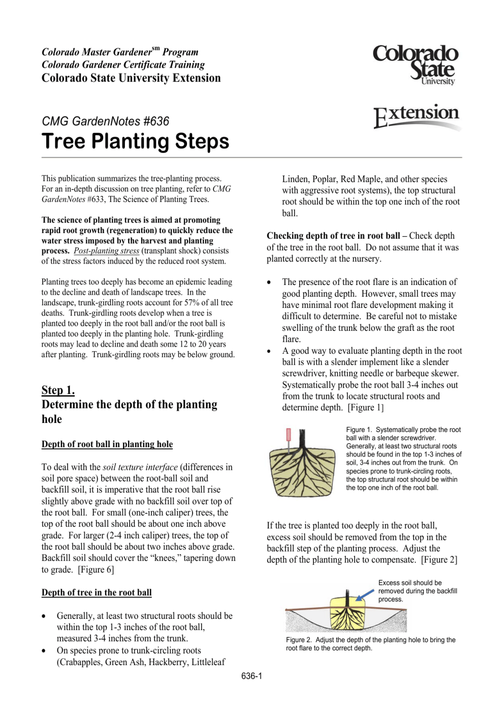Colorado Master Gardenersm Program Colorado Gardener Certificate Training Colorado State University Extension CMG GardenNotes #636 Tree Planting Steps This publication summarizes the tree-planting process. For an in-depth discussion on tree planting, refer to CMG GardenNotes #633, The Science of Planting Trees. Linden, Poplar, Red Maple, and other species with aggressive root systems), the top structural root should be within the top one inch of the root ball. The science of planting trees is aimed at promoting rapid root growth (regeneration) to quickly reduce the water stress imposed by the harvest and planting process. Post-planting stress (transplant shock) consists of the stress factors induced by the reduced root system. Checking depth of tree in root ball – Check depth of the tree in the root ball. Do not assume that it was planted correctly at the nursery. • Planting trees too deeply has become an epidemic leading to the decline and death of landscape trees. In the landscape, trunk-girdling roots account for 57% of all tree deaths. Trunk-girdling roots develop when a tree is planted too deeply in the root ball and/or the root ball is planted too deeply in the planting hole. Trunk-girdling roots may lead to decline and death some 12 to 20 years after planting. Trunk-girdling roots may be below ground. • Step 1. Determine the depth of the planting hole Figure 1. Systematically probe the root ball with a slender screwdriver. Generally, at least two structural roots should be found in the top 1-3 inches of soil, 3-4 inches out from the trunk. On species prone to trunk-circling roots, the top structural root should be within the top one inch of the root ball. Depth of root ball in planting hole To deal with the soil texture interface (differences in soil pore space) between the root-ball soil and backfill soil, it is imperative that the root ball rise slightly above grade with no backfill soil over top of the root ball. For small (one-inch caliper) trees, the top of the root ball should be about one inch above grade. For larger (2-4 inch caliper) trees, the top of the root ball should be about two inches above grade. Backfill soil should cover the “knees,” tapering down to grade. [Figure 6] If the tree is planted too deeply in the root ball, excess soil should be removed from the top in the backfill step of the planting process. Adjust the depth of the planting hole to compensate. [Figure 2] Excess soil should be removed during the backfill process. Depth of tree in the root ball • • The presence of the root flare is an indication of good planting depth. However, small trees may have minimal root flare development making it difficult to determine. Be careful not to mistake swelling of the trunk below the graft as the root flare. A good way to evaluate planting depth in the root ball is with a slender implement like a slender screwdriver, knitting needle or barbeque skewer. Systematically probe the root ball 3-4 inches out from the trunk to locate structural roots and determine depth. [Figure 1] Generally, at least two structural roots should be within the top 1-3 inches of the root ball, measured 3-4 inches from the trunk. On species prone to trunk-circling roots (Crabapples, Green Ash, Hackberry, Littleleaf Figure 2. Adjust the depth of the planting hole to bring the root flare to the correct depth. 636-1 Vertically align the tree, with the top centered above the root ball. Due to curves along the trunk, the trunk may not necessarily look straight. It will appear straighter with growth. The depth of the planting hole should be 1-2 inches less than the height of the root ball. However, planting hole depth may need to be adjusted to correct the depth of the tree in the root ball. In this step, techniques vary for Container-Grown Trees and Balled And Burlapped (B&B) Trees. Step 2. Dig a saucer-shaped planting hole three times the root ball diameter o o o o o o Container-Grown Nursery Stock To maximize soil oxygen levels the top of the root ball rises 1-2 inches above grade (adjusted for proper rooting depth as determined in step 1). The root ball sits on undug soil, stabilizing the tree and preventing sinking and tilting. A saucer-shaped planting hole three times the root ball diameter with sloping sides allows the root system to grow rapidly to 400% of the root ball volume before being slowed by the lower oxygen levels in the site soil. This is enough to minimize post-planting stress in normal planting situations. The wide, saucer-shaped planting hole gives the tree more tolerance to over-watering problems and waterlogged soils. The wide planting hole allows for root ball wrappings to be removed after the tree is situated in the planting hole. A labor-saving technique is to dig the planting hole about two times the root ball diameter with somewhat vertical sides, then widen the hole into the desired saucer shape with the shovel during the backfill process. [Figure 3] “Container-grown nursery stock” describes a variety of production methods where the trees or shrubs are grown in containers (limiting root spread to the size of the container). In some systems, like “pot-in-pot” and “grow-bags,” the container is in the ground. An advantage of container stock is that it can be planted in spring, summer, or fall. Figure 3. A labor-saving technique is to widen the planting hole into the desired saucer shape, three times the root ball diameter during the during backfill process. o Actual planting techniques in this step vary with the type of container and extent of root development. Generic steps include: a) Lay the tree on its side in or near the planting hole. b) Wiggle off or cut off the container. c) Shave off the outer 1-1½ inches of the root ball with a pruning saw or pruners. This is to deal with circling roots. d) Tilt the tree into place with the inside curve of any graft crook facing north. e) Check the depth of the root ball in the planting hole. If needed