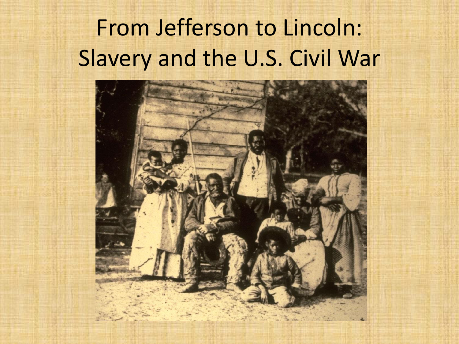 From Jefferson to Lincoln: Slavery and the U.S. Civil War Declaration of Independence (1776) The final draft of the Declaration did not include Thomas Jefferson’s clause criticizing the King of England for his support of the slave trade. The issue of slavery is not resolved at this time. The U.S. Constitution (1787) For the purpose of calculating the population of a state, slaves are counted as 3/5 of a person in the U.S. Constitution, giving the South “slave power.” The Constitution also stipulates that the slave trade will end in 20 years. In 1803, Jefferson’s purchase of the Louisiana territory from France doubles the size of the United States, promoting the movement of people westward. Abraham Lincoln is born on February 12th, 1809 in Kentucky. Below is the earliest known photograph of Lincoln. Frederick Douglass is born a slave in 1818 in Maryland. He runs away from his master, and later becomes a leader in the abolitionist movement, a writer and editor, a powerful orator, and has a strong influence on Lincoln’s attitudes toward blacks. In the Missouri Compromise of 1820, Congress allows Missouri to enter as a slave state and Maine as a free state. Slavery in the West will be permitted below 36’30” degrees latitude. New York becomes the last state in the North to abolish slavery in 1827. The abolitionist movement begins to spread through the North in the 1830s. From left to right: Harriet Beecher Stowe, author of Uncle Tom’s Cabin; Henry Highland Garnet, former slave, orator and clergyman; and William Lloyd Garrison, publisher of the abolitionist newspaper The Liberator. In 1846, Lincoln is elected to a two-year term in Congress. He spends much of his time reading Jefferson’s books in the Library of Congress, then returns to Illinois to practice law. 1850: Congress passes the Fugitive Slave Act, which allows slave owners to claim runaway slaves who have sought refuge in nonslave states. The Kansas-Nebraska Act of 1854 overturns the Missouri Compromise of 1820. New territories will be allowed to choose if they want to have slavery or not. The new law angers abolitionists in the North. In 1856, John Brown, a radical abolitionist, and his supporters kill 5 pro-slavery southerners in Kansas. The territory comes to be known as “bleeding Kansas.” In 1857, the Supreme Court enforces the Fugitive Slave Act with the Dred Scott decision. In 1858, Abraham Lincoln, a Republican, faces Stephen Douglas, a Democrat, in a series of seven debates in the state of Illinois. The two men were candidates for the U.S. Senate. Knox College in Illinois: site of one of the seven Lincoln-Douglas debates of 1858 1859: John Brown organizes an unsuccessful raid on the Federal Arsenal at Harper's Ferry, Virginia. Brown’s plan is to take weapons from the arsenal and distribute them to slaves who want to rebel. Brown is captured and executed. His radical act terrifies the South, but his execution angers the North. February 1860: As a Republican candidate for President, Lincoln gives a speech at Cooper Union in New York City. His photograph is taken by Matthew Brady, and helps create the image of a serious candidate. Lincoln is elected President in November of 1860 with 40% of the vote. In the South, where his name does not even appear on the ballot, he receives only 1% of the popular vote. South Carolina secedes from the Union in December of 1860. Six more Southern states secede from the Union before Lincoln can be inaugurated in March of 1861 as the 16th President of the United States. Lincoln faces the greatest political crisis in the country’s history. On April 12, 1861, South Carolina begins bombardment of Fort Sumter, a federal fort. On April 14, the fort surrenders. On April 15th, Lincoln calls for 75,000 troops. In June of 1861, Union troops invade Virginia. Expecting an easy victory, Union supporters gathered on a nearby hillside to watch the battle and have a picnic. However, the South inflicts a terrible defeat on the Northern army, which retreats back to Washington, D.C. This is the first sign that the war will not be quick and easy as the North anticipated. On January 1st, 1863, Lincoln officially issues the Emancipation Proclamation, freeing all slaves in the 11 Confederate States in rebellion. However, the Emancipation does not affect slavery in the four border states. At the Battle of Gettysburg, Pennsylvania, July 1-3, 1863, the Union army defeats Robert E. Lee’s army of Virginia, changing the course of the war. After a three-day battle, there was a combined total of more than 50,000 casualties, including more than 10,000 dead. Because of the July heat, the bodies had to be buried hastily. After the Battle of Gettysburg, Congress issues a draft for more Union soldiers. People, including many Irish immigrants, riot in the streets of New York, destroying property and killing and beating blacks. The Union Army has to put down the riot. On November 19th, 1863, Lincoln delivers his famous Gettysburg Address at the commemoration of the new cemetery to honor Union soldiers fallen at the Battle of Gettysburg. In 1864, Union General William Tecumseh Sherman invades the South, destroying farms and property, and leaving much of the South in ruin. Lincoln is re-elected President in November of 1864 and inaugurated in March of 1865. In February 1865, Congress passes the 13th Amendment to the U.S. Constitution, abolishing slavery. On April 9th, 1865, General Lee (right) officially surrenders to General Grant in Appomattox, Virginia, ending the U.S. Civil War. On April 14th (Good Friday), 1865, Lincoln is assassinated by John Wilkes Booth, an actor and white supremacist, during a play at Ford’s Theater in Washington, D.C. Booth is captured and killed 12 days later. Lincoln’s body is returned by train to Springfield, Illinois following the same route by which he first came to Washington, D.C. in 1861. Walt Whitman, a poet who served as a nurse during the war, pens his famous poem “