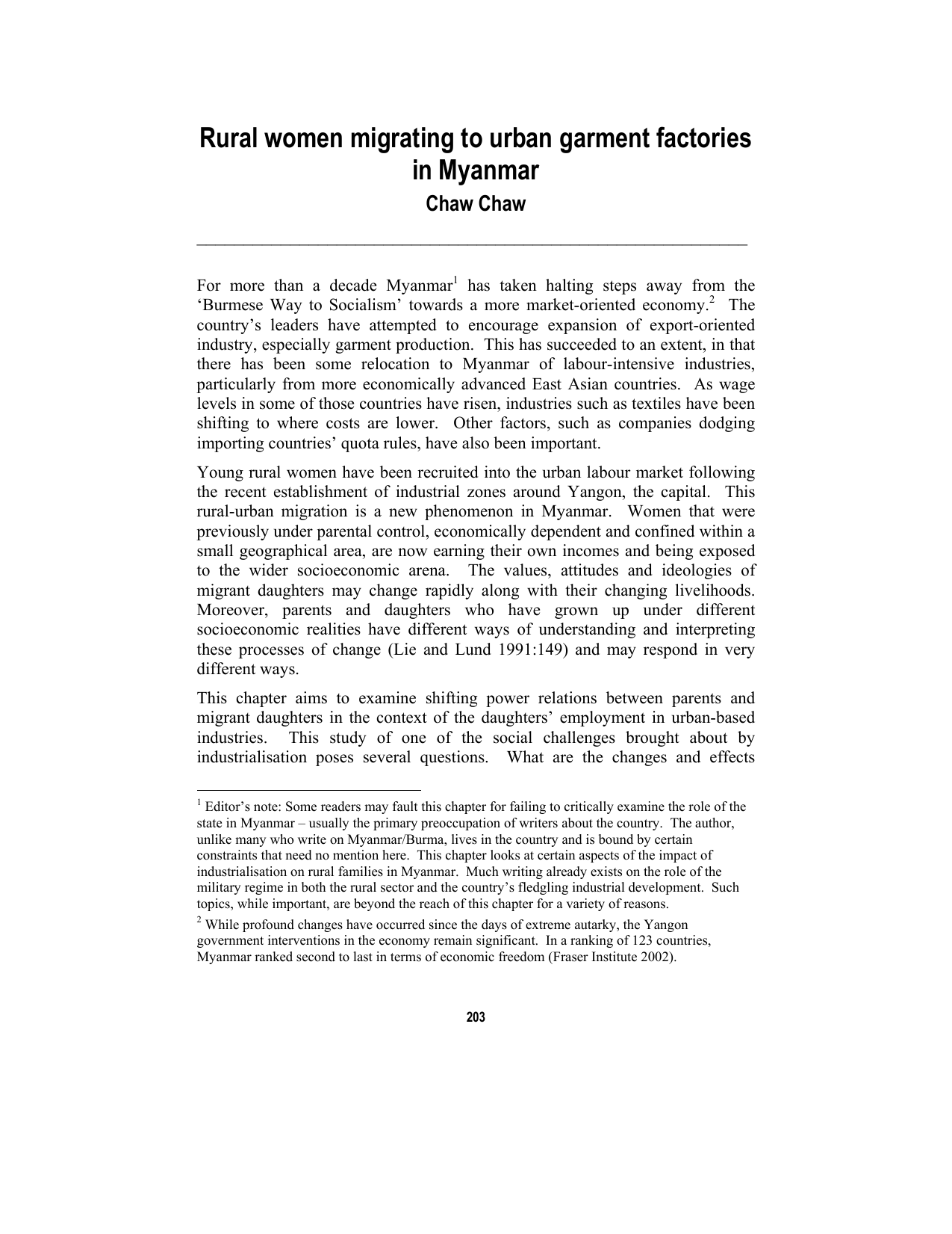 Rural women migrating to urban garment factories in Myanmar Chaw Chaw ___________________________________________________________ For more than a decade Myanmar1 has taken halting steps away from the ‘Burmese Way to Socialism’ towards a more market-oriented economy.2 The country’s leaders have attempted to encourage expansion of export-oriented industry, especially garment production. This has succeeded to an extent, in that there has been some relocation to Myanmar of labour-intensive industries, particularly from more economically advanced East Asian countries. As wage levels in some of those countries have risen, industries such as textiles have been shifting to where costs are lower. Other factors, such as companies dodging importing countries’ quota rules, have also been important. Young rural women have been recruited into the urban labour market following the recent establishment of industrial zones around Yangon, the capital. This rural-urban migration is a new phenomenon in Myanmar. Women that were previously under parental control, economically dependent and confined within a small geographical area, are now earning their own incomes and being exposed to the wider socioeconomic arena. The values, attitudes and ideologies of migrant daughters may change rapidly along with their changing livelihoods. Moreover, parents and daughters who have grown up under different socioeconomic realities have different ways of understanding and interpreting these processes of change (Lie and Lund 1991:149) and may respond in very different ways. This chapter aims to examine shifting power relations between parents and migrant daughters in the context of the daughters’ employment in urban-based industries. This study of one of the social challenges brought about by industrialisation poses several questions. What are the changes and effects 1 Editor’s note: Some readers may fault this chapter for failing to critically examine the role of the state in Myanmar – usually the primary preoccupation of writers about the country. The author, unlike many who write on Myanmar/Burma, lives in the country and is bound by certain constraints that need no mention here. This chapter looks at certain aspects of the impact of industrialisation on rural families in Myanmar. Much writing already exists on the role of the military regime in both the rural sector and the country’s fledgling industrial development. Such topics, while important, are beyond the reach of this chapter for a variety of reasons. 2 While profound changes have occurred since the days of extreme autarky, the Yangon government interventions in the economy remain significant. In a ranking of 123 countries, Myanmar ranked second to last in terms of economic freedom (Fraser Institute 2002). 203 Chaw Chaw brought about by industrialisation – more specifically, factory employment – in the lives of rural-to-urban working women? How does industrialisation, specifically factory employment, affect the relationship between parents and working daughters? This study draws upon empirical data I collected from two urban industrial zones in the Yangon area, Hlaing Thar Yar and South Dagon, and two rural villages, Ywa Thit and Kyun Gone. Qualitative and quantitative methods were used to obtain information in both the urban and rural settings. I looked at women’s experiences in factory employment, household patterns and strategies, accepted norms and values in the village and migrants’ accounts of the perceptions and responses of their parents and communities. In addition to regular visits with factory workers, I also visited families at the two selected villages to see things from their perspective. Both villages are accessible by bus or car directly from Yangon. The main income source of both villages is farming and the majority of the population practices Buddhism. Industrial development The tentative opening of the economy in 1988 to foreign trade and investment has provided opportunities for companies from newly industrialising economies like South Korea and neighbouring countries like Thailand to gain comparative advantage by moving their labour-intensive industries to Myanmar. This development has removed Myanmar from its self-imposed autarky and given it a place, albeit a very low-ranking one, in the ‘new international division of labour’. This division of labour rewards countries that have low labour costs and curbs on union organising with investment from countries with higher costs and/or more organised labour. A new foreign investment law was passed in Myanmar in November 1988 allowing the establishment of wholly owned foreign enterprises and joint ventures. Foreign partners in joint ventures with local firms are required to take at least a 35% equity stake (Lutkenhorst 1990). These arrangements give priority to export promotion. There have also been other state-initiated incentives to promote industrialisation through the impetus of foreign investment in Myanmar. Industrial zones, where new factories would be located, have been created in response to state policies, especially after the promulgation of the Private Industrial Enterprise Law in 1990. Between 1988 and 1999, two types of zones were developed in and around Yangon. The first type is oriented towards general industries owned by local entrepreneurs, whereas the second type aims to attract foreign investors. The Department of Human Settlement and Housing Development has established eight industrial zones in the satellite towns and surroundings of Yangon. 204 RURAL WOMEN MIGRATING TO URBAN GARMENT FACTORIES IN MYANMAR Accompanying this growth in the number of labour-intensive textile and foodprocessing factories, women’s participation in the urban labour force has increased significantly. Employment by gender in four Yangon industrial zones is shown in Table 1. Table 1 Gender of employees in four Yangon industrial zones 1 2 3 4 Zone Hlaing Thar Yar Shwe Pyi Thar