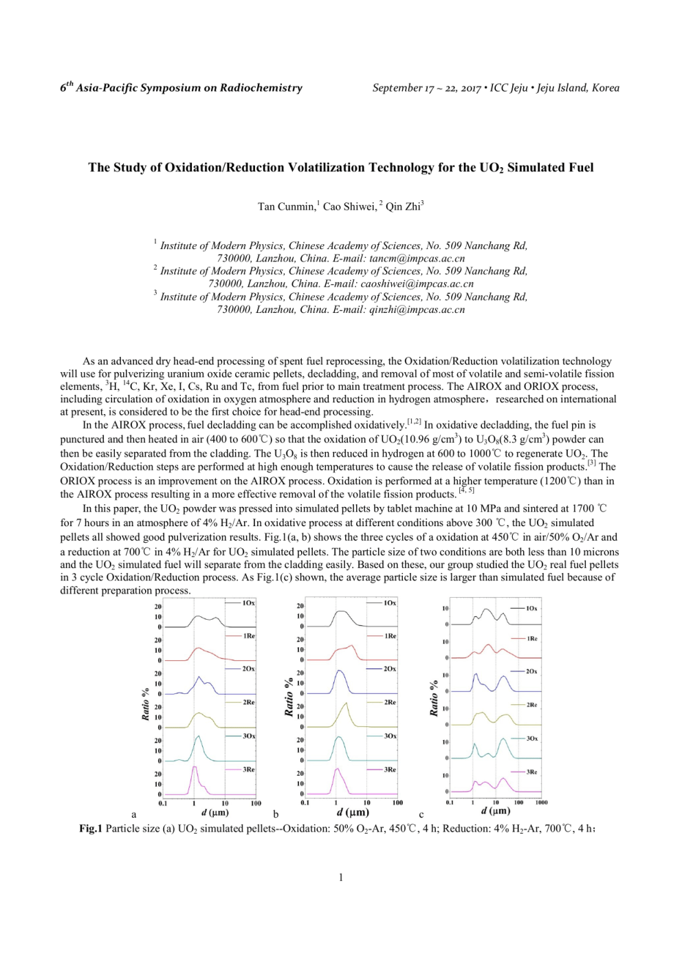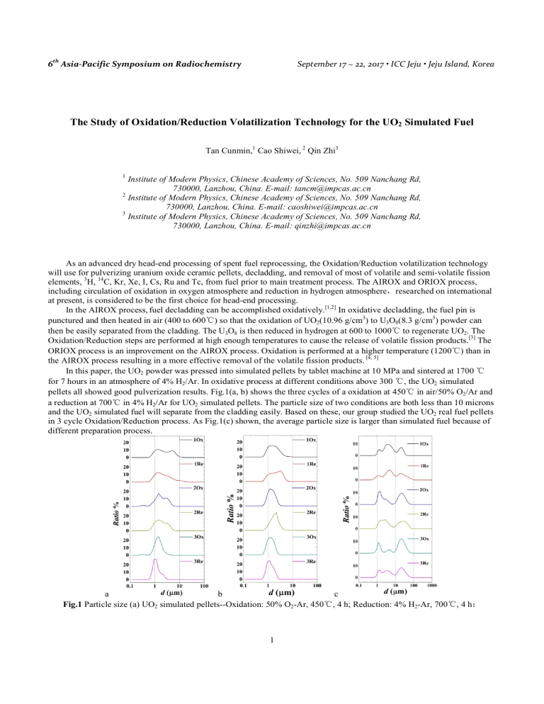 6 Asia-Pacific Symposium on Radiochemistry September 17 ~ 22, 2017 • ICC Jeju • Jeju Island, Korea th The Study of Oxidation/Reduction Volatilization Technology for the UO2 Simulated Fuel Tan Cunmin,1 Cao Shiwei, 2 Qin Zhi3 Institute of Modern Physics, Chinese Academy of Sciences, No. 509 Nanchang Rd, 730000, Lanzhou, China. E-mail: [email protected] 2 Institute of Modern Physics, Chinese Academy of Sciences, No. 509 Nanchang Rd, 730000, Lanzhou, China. E-mail: [email protected] 3 Institute of Modern Physics, Chinese Academy of Sciences, No. 509 Nanchang Rd, 730000, Lanzhou, China. E-mail: [email protected] 1 As an advanced dry head-end processing of spent fuel reprocessing, the Oxidation/Reduction volatilization technology will use for pulverizing uranium oxide ceramic pellets, decladding, and removal of most of volatile and semi-volatile fission elements, 3H, 14C, Kr, Xe, I, Cs, Ru and Tc, from fuel prior to main treatment process. The AIROX and ORIOX process, including circulation of oxidation in oxygen atmosphere and reduction in hydrogen atmosphere,researched on international at present, is considered to be the first choice for head-end processing. In the AIROX process, fuel decladding can be accomplished oxidatively.[1,2] In oxidative decladding, the fuel pin is punctured and then heated in air (400 to 600℃) so that the oxidation of UO2(10.96 g/cm3) to U3O8(8.3 g/cm3) powder can then be easily separated from the cladding. The U3O8 is then reduced in hydrogen at 600 to 1000℃ to regenerate UO2. The Oxidation/Reduction steps are performed at high enough temperatures to cause the release of volatile fission products.[3] The ORIOX process is an improvement on the AIROX process. Oxidation is performed at a higher temperature (1200℃) than in the AIROX process resulting in a more effective removal of the volatile fission products. [4, 5] In this paper, the UO2 powder was pressed into simulated pellets by tablet machine at 10 MPa and sintered at 1700 ℃ for 7 hours in an atmosphere of 4% H2/Ar. In oxidative process at different conditions above 300 ℃, the UO2 simulated pellets all showed good pulverization results. Fig.1(a, b) shows the three cycles of a oxidation at 450℃ in air/50% O2/Ar and a reduction at 700℃ in 4% H2/Ar for UO2 simulated pellets. The particle size of two conditions are both less than 10 microns and the UO2 simulated fuel will separate from the cladding easily. Based on these, our group studied the UO2 real fuel pellets in 3 cycle Oxidation/Reduction process. As Fig.1(c) shown, the average particle size is larger than simulated fuel because of different preparation process. a b c Fig.1 Particle size (a) UO2 simulated pellets--Oxidation: 50% O2-Ar, 450℃, 4 h; Reduction: 4% H2-Ar, 700℃, 4 h; 1 6 Asia-Pacific Symposium on Radiochemistry September 17 ~ 22, 2017 • ICC Jeju • Jeju Island, Korea th (b) UO2 simulated pellets--Oxidation: air, 450℃, 4 h; Reduction: 4% H2-Ar, 700℃, 4 h; (c) UO2 real fuel pellets--Oxidation: air, 450℃, 4 h; Reduction: 4% H2-Ar, 700℃, 4 h. The XRD patterns of simulated and real pellets after the complete oxidation and reduction are shown in Fig.2. The result is in agreement with standard parameter of U3O8 and UO2, which confirmed chemical conversion of Uranium can be fully realized. More in-depth research for volatile and semi-volatile elements of the UO2 simulated pellets in Oxidation/Reduction cycle process is our present work in order to lay a foundation for the advanced dry head-end processing of spent fuel reprocessing. ACKNOWLEDGMENTS The present work is supported by the CAS Strategic Priority Research Program (XDA03010402). REFERENCES 1. 2. 3. 4. 5. D. Majumdar. Recycling of Nuclear Spent Fuel with AIROX Processing. U.S. Department of Energy, DOE/ID-10423, December 1992. J. H. Goode. Voloxidation-Removal of Volatile Fission Products From Spent LMFBR Fuels. Chemical Technology Division. U. S. Atomic Energy Commission. 1973. Peter Tavlor, Roderick J. McEachern. Process to Remove Rere Earths From Spent Nuclear Fuel. US5597538. Jan. 28, 1997. Geun-il Park, KAERI. Overview of DUPIC Project. CAS, China. March 23, 2015. Herbert Feinroth, David G. Abbott, Jay Kunze. Dry Recycle of Light Water Reactor Spent Nuclear Fuel. 7th International Conference on Nuclear Engineering. Tokyo, Japan, April 19-23,1999. 2