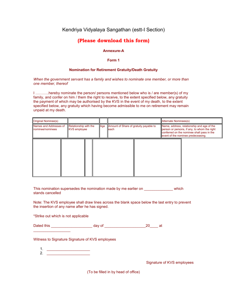Kendriya Vidyalaya Sangathan (estt-I Section) (Please download this form) Annexure-A Form 1 Nomination for Retirement Gratuity/Death Gratuity When the government servant has a family and wishes to nominate one member, or more than one member, thereof I ………..hereby nominate the person/ persons mentioned below who is / are member(s) of my family, and confer on him / them the right to receive, to the extent specified below, any gratuity the payment of which may be authorised by the KVS in the event of my death, to the extent specified below, any gratuity which having become admissible to me on retirement may remain unpaid at my death. Original Nominee(s) Names and Addresses of nominee/nominees Alternate Nominees(s) Relationship with the KVS employee Age Amount of Share of gratuity payable to each Name, address, relationship and age of the person or persons, if any, to whom the right conferred on the nominee shall pass in the event of the nominee predeceasing. This nomination supersedes the nomination made by me earlier on ______________ which stands cancelled Note: The KVS employee shall draw lines across the blank space below the last entry to prevent the insertion of any name after he has signed. *Strike out which is not applicable Dated this ____________________ day of ____________________20____ at __________________ Witness to Signature Signature of KVS employees 1. _____________________ 2. _____________________ Signature of KVS employees (To be filled in by head of office) Nomination by_____________ Signature of the Head of Office Designation________________ EMPLOYEES CONTRIBUTORY/GENERAL PROVIDENT FUND I hereby direct that the amount at my credit in the Provident Fund Account No.-------------------- at the time of my death shall be distributed among the members of my family mentioned below in the manner shown against their names:Name & Address of the nominee or nominees Relationship with the subscriber Age of the nominee Amount of share of the accumulation. Station -------------------Date -------------------- Signature of the subscriber Two witnesses to the Signature of the subscriber 1. ---------------------2. ---------------------- NOMINATION FOR BENEFITS UNDER THE SANGATHAN Annexure-A Appendix EMPLOYEES GROUP INSURANCE SCHEME 1993. When the Sangathan Employee has a family and wishes to nominate one member or more than one member thereof. I hereby nominate the person(s) mentioned below who is/are member(s) of my family and confer on him/them the right to receive to the extent specified below any amount that may be sanctioned by the Sangathan Employees Group Insurance Scheme, 1993 in the event of my death while in service or which having become payable on my attaining the age of superannuation may remain unpaid at my death. Name(s) and addresses of nominee/Nominees Relationship with Sangathan employee Age Share to be paid to each* Contingencies on the happening of which the nomination shall become invalid Name, Address and relationship if any, to whom the right of the nominee shall pass in the event of his predeceasing the sangathan employee 1 2 3 4 5 6 Dated this---------------------day of--------------------------19-------At---------------------------Signature of two witnesses: 1. _______________ 2. _______________ Signature of Sangathan Employee. *This column should be filled in so as to cover the whole amount yhat may be payable under the Insurance scheme. Form CS:63 Annexture B APPLICATION FOR PENSION To The Senior Accounts Officer Kendriya Vidyalaya Sangathan New Delhi Subject: Application for Sanction of Pension Sir, 1. I beg to say that I am due to retire from service with effect from ------------------------my date of birth being--------------------. I, therefore, request that steps may kindly be taken with a view to the pension and gratuity admissible to me being sanctioned by the date of my retirement. 2. I hereby declare that I have neither applied nor received, any pension or gratuity in respect of any portion of the service qualifying for this pension and in respect of which pension and/or gratuity is claimed herein nor shall submit an application hereafter without quoting a reference to this application and the orders which may be passed thereon. 3. I enclose herewith: Two slips bearing in each three specimen signatures of mine, duly attested. Two copies of joint passport size photograph of mine with spouse also duly attested; Two slips each showing particulars of height and identification marks. Two slips each bearing my left-hand thumb & finger impressions Details of family in form CS-63a. 4. The particulars for the withdrawal of pension through an authorised branch of the State Bank of India are as under: Name of place Name of Branch Particulars of Saving Bank/Pension A/c to which pension is to be credited My present address is-------------------------------------------and my address after retirement will be---------------------------Place: Signature: Form CS-63a Appendix-B DETAILS OF FAMILY Name of the Sangathan Employee: Designation: Date of birth: Date of Appointment: Details of the members of my family as on: S.No. Name of the members of family* Date of birth Relationship with the employee Initials of the Head of office Remarks 1. 2. 3. 4. 5. 6. 1. 2. 3. 4. 5. 6. 7. 8. I hereby undertake to keep the above particulars up-to-date by notifying to the Head of Office any addition or alteration. Place:----------------Dated:----------------- Signature of the Sangathan Employee *Family for this pourpose means family as defined in clause (b) of sub-Rule (14) of Rule 54 of the CCS (pension) Rules, 1972. Note: Wife and Husband shall include respectively judicially separated wife and husband. FORM CS-64 Annexture-B No____________________ KV/RO/HQ_____________ Dated_________________ To The Senior Accounts Officer Kendriya Vidyalaya Sangathan New Delhi. Subject: Pension papers of Shri/ Kumari------------------------------for authorisation of Pension. Sir, I am directed 