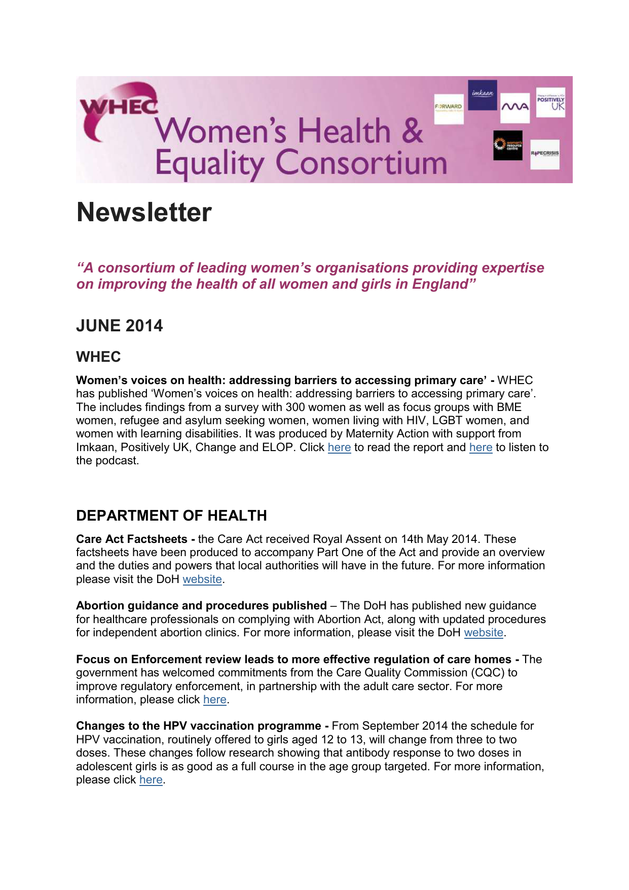 Newsletter “A consortium of leading women’s organisations providing expertise on improving the health of all women and girls in England” JUNE 2014 WHEC Women’s voices on health: addressing barriers to accessing primary care’ - WHEC has published ‘Women’s voices on health: addressing barriers to accessing primary care’. The includes findings from a survey with 300 women as well as focus groups with BME women, refugee and asylum seeking women, women living with HIV, LGBT women, and women with learning disabilities. It was produced by Maternity Action with support from Imkaan, Positively UK, Change and ELOP. Click here to read the report and here to listen to the podcast. DEPARTMENT OF HEALTH Care Act Factsheets - the Care Act received Royal Assent on 14th May 2014. These factsheets have been produced to accompany Part One of the Act and provide an overview and the duties and powers that local authorities will have in the future. For more information please visit the DoH website. Abortion guidance and procedures published – The DoH has published new guidance for healthcare professionals on complying with Abortion Act, along with updated procedures for independent abortion clinics. For more information, please visit the DoH website. Focus on Enforcement review leads to more effective regulation of care homes - The government has welcomed commitments from the Care Quality Commission (CQC) to improve regulatory enforcement, in partnership with the adult care sector. For more information, please click here. Changes to the HPV vaccination programme - From September 2014 the schedule for HPV vaccination, routinely offered to girls aged 12 to 13, will change from three to two doses. These changes follow research showing that antibody response to two doses in adolescent girls is as good as a full course in the age group targeted. For more information, please click here. NHS ENGLAND Guidance published on patients’ choice in mental health care - NHS England has published guidance for commissioners, GPs and providers to help them support patients to choose their mental health care. From 1 April 2014 patients with mental health conditions have had the same rights as physical health patients to choose where they have their first outpatient appointment. They are able to choose any clinically appropriate provider in England as long as a CCG or NHS England has a contract with them. For more information, please visit NHS England’s website. Mental health staffs to introduce physical ‘MOT’ to reduce deaths - Mental health staff will soon give lifestyle MOTs to patients to reduce avoidable deaths. Mental health trusts will receive financial rewards for carrying out checks. For more information, please visit NHS England’s website. New organisation looking for people who are passionate about the NHS: NHS Citizen this new organisation aims to give everyone the chance to have a say in decisions about the NHS in England. In public meetings and on the internet, it is looking at ways for people to come together to send their thoughts and ideas to NHS England which will be acted upon to secure improved care for patients. They also have a number of upcoming events including Liverpool on 29th May and Bristol on 24th and 25th July. For more information, please click here. PUBLIC HEALTH ENGLAND Blackfriars Consensus Statement calls for new policy focus on brain health to reduce the risk of dementia - action to tackle smoking, drinking, sedentary behaviour and poor diet could reduce the risk of dementia in later life alongside other conditions such as heart disease, stroke and many cancers, according to the UK Health Forum and PHE in a joint consensus statement. For more information, please visit the PHE website. CONSULTATIONS Care Act 2014: launch of care and support consultation (15 August) - this consultation seeks views on how local authorities should deliver the care and support reforms in the 2014 Care Act. For more information, please visit the DoH website. Dental contract reform: engagement (31 July) - this engagement exercise seeks views on changing dental contractual system to focus on improving oral health through prevention and increasing access. For more information, please visit the DoH website. New fund to help VCSE organisations become more sustainable (24 July) - The Cabinet Office is seeking views on a new £40 million fund to help voluntary, community and social enterprise (VCSE) organisations secure their futures. For more information, please visit the CO website. GOVERNMENT NEWS Introduction of New Forced Marriage Offences – new forced marriage offences will come into effect on 16 June 2014. The new offences will make forcing someone to marry a criminal offence punishable by up to 7 years imprisonment (previously a civil offence). For more information, please click here. PARTNER NEWS WRC thought leadership videos - every week, WRC will be offering a critical alternative feminist viewpoint on a current topic in the form of a short two-minute video clip. To see the latest video on tackling the issue of gendered violence and how the generalisation "violence is violence" is highly problematic, please click here. Passing of Immigration Act reveals new charging system for migrant access to healthcare - New charges for migrants who access NHS services will now be introduced, as outlined in the Immigration Act. For more information, please visit the Migrants Rights Network website. 'Facing the challenge of realising social value' and 'Working together to deliver social value - NCB and FaithAction have released two short films, aimed at voluntary organisations and commissioners operating in the health and care sectors to address the needs of children, young people and families. Click here for more information. Are children dying unnecessarily in the UK? - National Children's Bureau (NCB) blog looks at child mortality and its link with living in underprivileged conditions. Click her