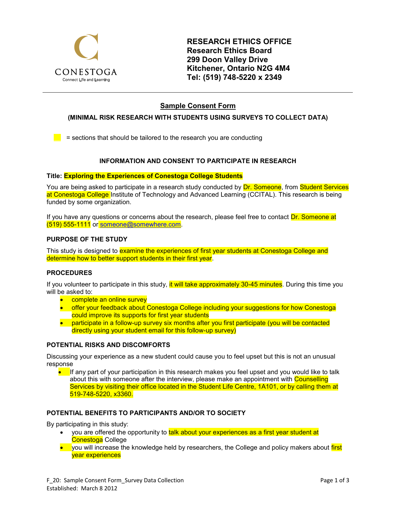 Logo Document Title RESEARCH ETHICS OFFICE Research Ethics Board 299 Doon Valley Drive Kitchener, Ontario N2G 4M4 Tel: (519) 748-5220 x 2349 Sample Consent Form (MINIMAL RISK RESEARCH WITH STUDENTS USING SURVEYS TO COLLECT DATA) ____ = sections that should be tailored to the research you are conducting INFORMATION AND CONSENT TO PARTICIPATE IN RESEARCH Title: Exploring the Experiences of Conestoga College Students You are being asked to participate in a research study conducted by Dr. Someone, from Student Services at Conestoga College Institute of Technology and Advanced Learning (CCITAL). This research is being funded by some organization. If you have any questions or concerns about the research, please feel free to contact Dr. Someone at (519) 555-1111 or [email protected]. PURPOSE OF THE STUDY This study is designed to examine the experiences of first year students at Conestoga College and determine how to better support students in their first year. PROCEDURES If you volunteer to participate in this study, it will take approximately 30-45 minutes. During this time you will be asked to: complete an online survey offer your feedback about Conestoga College including your suggestions for how Conestoga could improve its supports for first year students participate in a follow-up survey six months after you first participate (you will be contacted directly using your student email for this follow-up survey) POTENTIAL RISKS AND DISCOMFORTS Discussing your experience as a new student could cause you to feel upset but this is not an unusual response If any part of your participation in this research makes you feel upset and you would like to talk about this with someone after the interview, please make an appointment with Counselling Services by visiting their office located in the Student Life Centre, 1A101, or by calling them at 519-748-5220, x3360. POTENTIAL BENEFITS TO PARTICIPANTS AND/OR TO SOCIETY By participating in this study: you are offered the opportunity to talk about your experiences as a first year student at Conestoga College you will increase the knowledge held by researchers, the College and policy makers about first year experiences F_20: Sample Consent Form_Survey Data Collection Established: March 8 2012 Page 1 of 3 your comments and feedback may also help improve the services currently offered to support first year students by the College CONFIDENTIALITY Every effort will be made to ensure confidentiality of any identifying information collected in this study: The researcher will not collect your name or any other contact information. [Choose (and include) which of the statements below apply. Delete the ones that do not apply.] At no time will any specific answers be attributed to any participant. Internet protocol (IP) addresses will not be collected. In the event that IP addresses are collected, the Principal Investigator (PI) will ensure that the investigators will not be able to view the IP addresses of any of the responses. Only one (1) password to access the data exists; that password is held by the Principal Investigator (PI). All survey-related data is SSL encrypted when transmitted to/from the web server (similar to what banks use to transmit secure information). All survey-related data is encrypted when stored on the web server's storage system. All administrator access to the server is protected with strong passwords and where possible, firewall protection systems. Only the researcher, Dr. Someone, will have access to survey data The funding agency “Some Organization” will only have access to any coded data which will have all identifying information removed. HANDLING AND SECURITY OF DATA Data collection can never be guaranteed to be completely secure. However every effort will be made to ensure that your privacy and confidentiality is protected throughout the study. Data will be kept for 5 years and then destroyed by Dr. Someone. ANONYMITY Your data will be coded so that only the researchers are able to link your comments or data to your name All data will be presented in reports, presentations or other final summaries in a summarized format so that no one will be able to identify you from your comments or data. Researchers will need to use your personal email to contact you for follow up phases of the study. PARTICIPATION, WITHDRAWAL and RIGHTS OF RESEARCH PARTICIPANTS You can choose whether to be in this study or not. You may withdraw consent at any time without academic or other consequences of any kind. You may exercise the option of removing your data from the study. However once all identifying information has been removed, all interviews and survey responses will become anonymous and it will not be possible for participants to ask for their data to be removed from the study. You may also refuse to answer any questions you don’t want to answer and still remain in the study. The investigator may withdraw you from this research if circumstances arise that warrant doing so. You are not waiving any legal claims, rights or remedies because of your participation in this research study. PAYMENT FOR PARTICIPATION For your participation, your name, if you are interested, will be placed into a draw to win a $50 gift card for the Conestoga College Bookstore. Once winners of the draw are selected and contacted, all names and identifying information will be destroyed. If you wish to participate in the draw, you will be asked to provide personal contact information. RESULTS OF THE STUDY F_20: Sample Consent Form_Survey Data Collection Established: March 8 2012 Page 2 of 3 The results of the study will be shared in reports, conferences, presentations and may be published in the following formats: in electronic newsletters, other promotional materials, reports and in published journals. The results of the study will be available to you at the following website: example.com by date. This study has been reviewed and received ethics clearance through the CCITAL Res