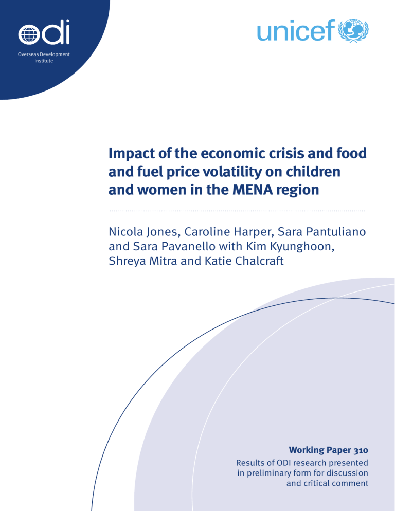 Overseas Development Institute Impact of the economic crisis and food and fuel price volatility on children and women in the MENA region Nicola Jones, Caroline Harper, Sara Pantuliano and Sara Pavanello with Kim Kyunghoon, Shreya Mitra and Katie Chalcraft Working Paper 310 Results of ODI research presented in preliminary form for discussion and critical comment Working Paper 310 Impact of the economic crisis and food and fuel price volatility on children and women in the MENA region Nicola Jones, Caroline Harper, Sara Pantuliano and Sara Pavanello, with Kim Kyunghoon, Shreya Mitra and Katie Chalcraft November 2009 Disclaimer: This ODI Working Paper and related Background Note were commissioned by the UNICEF Regional Office for the Middle East and North Africa. The findings, interpretations and conclusions expressed in this paper are entirely those of the authors and do not necessarily reflect the policies or the views of UNICEF and ODI. Overseas Development Institute 111 Westminster Bridge Road London SE1 7JD UK Tel: +44 (0)20 7922 0300 Fax: +44 (0)20 7922 0399 www.odi.org.uk ISBN 978 0 85003 921 4 Working Paper (Print) ISSN 1759 2909 ODI Working Papers (Online) ISSN 1759 2917 © Overseas Development Institute 2009 All rights reserved. No part of this publication may be reproduced, stored in a retrieval system, or transmitted in any form or by any means, electronic, mechanical, photocopying, recording or otherwise, without the prior written permission of the publishers. ii Contents Acronyms 1. 2. 3. 4. 5. 6. 7. iv Introduction 1.1 Overview 1.2 Methodology and structure of the report Conceptual framework Key characteristics of the crisis in the MENA region 3.1 Pre-crisis macroeconomic health 3.2 Future economic forecasts Crisis impacts on children and caregivers 4.1 Nutritional impacts 4.2 Health impacts 4.3 Educational impacts 4.4 Social unrest 4.5 Protection (from violence, abuse, and neglect) impacts 4.6 Impacts on refugees 4.7 Impacts on child labour 4.8 Impacts on employment Country snapshots 5.1 Egypt 5.2 Jordan 5.3 Morocco 5.4 Saudi Arabia 5.5 Sudan 5.6 Yemen Policy responses 6.1 Fiscal stimulus package 6.2 Food-related measures 6.3 Broader social protection measures Conclusions and policy implications References Appendix 1: Level of economic integration and external dependence of MENA countries Appendix 2: Trend analyses of macro indicators for MENA snapshot countries Appendix 3: Trend analyses on socio-indicators for MENA snapshot countries at a glance Appendix 4: Trend analyses of health expenditures for MENA countries Appendix 5: Children and economic crises: Conceptual framework Appendix 6: Summary of direct and indirect impacts of the global economic crisis on children Appendix 7: Key child and women indicators Appendix 8: MENA government spending in key sectors iii 1 1 2 4 6 6 8 9 9 10 10 11 11 11 12 12 13 13 16 20 24 26 31 35 35 36 37 42 44 50 60 63 71 72 77 80 81 Acronyms AfDB AFP CBS CPA CPI DFID DHS DPT EIU EMOP ENCC EU FAO FDI FEWS Net FFE FNSC GCC GDP GoE GoJ GoNU GoSA GoSS HIV HRW ICC IDP IFAD IMF INDH IOM IRIN MENA MEYI NAF NCHS NGO ODA OECD OPEC OPT PPP SAMA SFD SHHS SPLM SSCCSE SSM SWF UAE African Development Bank Agence France-Presse Central Bureau of Statistics (Sudan) Comprehensive Peace Agreement (Sudan) Consumer Price Index UK Department for International Development Demographic and Health Survey Diphtheria-Tetanus-Pertussis Economic Intelligence Unit Emergency Operation (WFP) Egyptian National Competitiveness Council European Union Food and Agricultural Organization of the UN Foreign Direct Investment Famine Early Warning Systems Network Food for Education (WFP) Food and Nutrition Security Council (Sudan) Gulf Cooperation Council Gross Domestic Product Government of Egypt Government of Jordan Government of National Unity (Sudan) Government of Saudi Arabia Government of Southern Sudan Human Immunodeficiency Virus Human Rights Watch International Criminal Court Internally Displaced Person International Fund for Agricultural Development International Monetary Fund National Initiative for Human Development (Morocco) International Organization for Migration Integrated Regional Information Networks Middle East and North Africa Middle East Youth Initiative National Aid Fund (Jordan) National Center for Health Statistics Non-governmental Organisation Official Development Assistance Organisation for Economic Co-operation and Development Organization of the Petroleum Exporting Countries Occupied Palestinian Territories Purchasing Power Parity Saudi Arabian Monetary Agency Social Fund for Development (Yemen) Sudan Household Health Survey Sudan People’s Liberation Movement Southern Sudan Commission for Census, Statistics and Evaluation Sudan Seasonal Monitor Social Welfare Fund (Yemen) United Arab Emirates iv UN UNDP UNHCR UNICEF UNIFEM UNRWA US USAID VAT WDI WFP WHO United Nations UN Development Program UN High Commissioner for Refugees UN Children's Fund UN Development Fund for Women UN Relief and Works Agency United States US Agency for International Development Value Added Tax World Development Indicators World Food Programme World Health Organization v 1. Introduction 1.1 Overview The current financial crisis, which began in mid-2008 in the developed world, has had a major adverse impact on economic performance in Europe and North America in particular. Many Organisation for Economic Co-operation and Development (OECD) countries have entered recession, with increasingly visible contagion effects in the rest of the world. Some macroeconomic indicators of the global downturn in Europe and Asia are showing initial signs of stabilisation (EIU, 2009), but the effects of the crisis with regard to poverty and vulnerability in both the developed and the developing world are likely to continue for some time. For instance, the World Bank estimates that the ‘Triple F’ crisis (food, fuel and finance) will increase the number of global poor by between 53 and 64 million peo