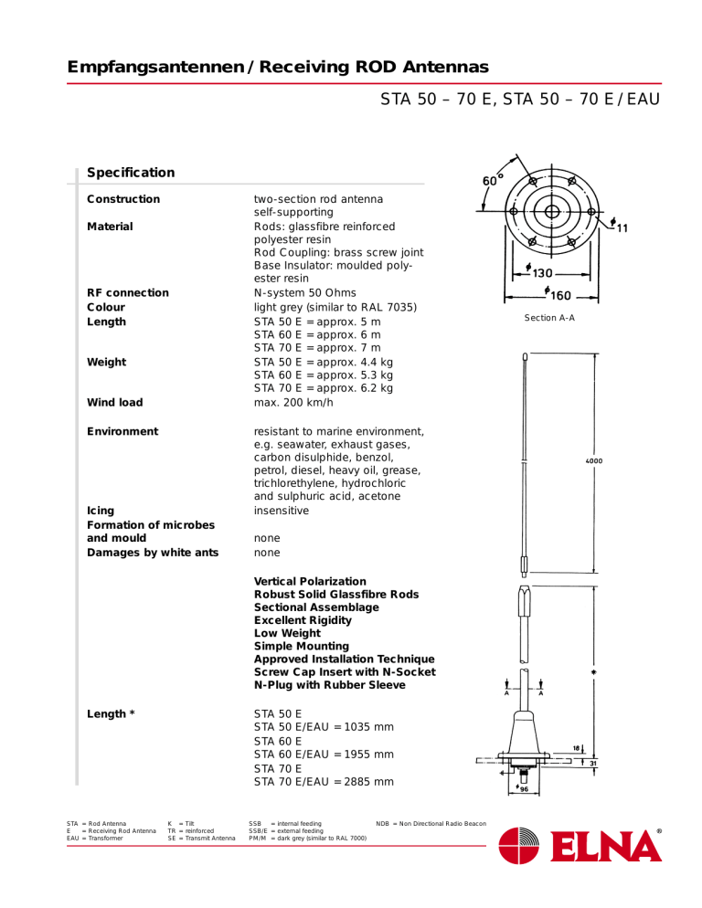 Empfangsantennen / Receiving ROD Antennas STA 50 – 70 E, STA 50 – 70 E / EAU Specification Construction Material RF connection Colour Length Weight Wind load Environment Icing Formation of microbes and mould Damages by white ants two-section rod antenna self-supporting Rods: glassfibre reinforced polyester resin Rod Coupling: brass screw joint Base Insulator: moulded polyester resin N-system 50 Ohms light grey (similar to RAL 7035) STA 50 E = approx. 5 m STA 60 E = approx. 6 m STA 70 E = approx. 7 m STA 50 E = approx. 4.4 kg STA 60 E = approx. 5.3 kg STA 70 E = approx. 6.2 kg max. 200 km/h resistant to marine environment, e.g. seawater, exhaust gases, carbon disulphide, benzol, petrol, diesel, heavy oil, grease, trichlorethylene, hydrochloric and sulphuric acid, acetone insensitive none none Vertical Polarization Robust Solid Glassfibre Rods Sectional Assemblage Excellent Rigidity Low Weight Simple Mounting Approved Installation Technique Screw Cap Insert with N-Socket N-Plug with Rubber Sleeve Length * STA = Rod Antenna E = Receiving Rod Antenna EAU = Transformer STA STA STA STA STA STA K = Tilt TR = reinforced SE = Transmit Antenna 50 50 60 60 70 70 E E/EAU = 1035 mm E E/EAU = 1955 mm E E/EAU = 2885 mm SSB = internal feeding SSB/E = external feeding PM/M = dark grey (similar to RAL 7000) NDB = Non Directional Radio Beacon Section A-A Empfangsantennen / Receiving ROD Antennas STA 50 – 70 E / K, STA 50 – 70 E / K / EAU Specification Tilting direction Construction Material RF connection Colour Length Weight Wind load Environment Icing Formation of microbes and mould Damages by white ants two-section rod antenna self-supporting Rods: glassfibre reinforced polyester resin Rod Coupling: brass screw joint Base Insulator: moulded polyester resin N-system 50 Ohms light grey (similar to RAL 7035) STA 50 E = approx. 5 m STA 60 E = approx. 6 m STA 70 E = approx. 7 m STA 50 E = approx. 4.4 kg STA 60 E = approx. 5.3 kg STA 70 E = approx. 6.2 kg max. 200 km/h resistant to marine environment, e.g. seawater, exhaust gases, carbon disulphide, benzol, petrol, diesel, heavy oil, grease, trichlorethylene, hydrochloric and sulphuric acid, acetone insensitive none none Vertical Polarization Robust Solid Glassfibre Rods Sectional Assemblage Excellent Rigidity Low Weight Simple Mounting Approved Installation Technique Screw Cap Insert with N-Socket N-Plug with Rubber Sleeve Length * STA STA STA STA STA STA 50 50 60 60 70 70 ELNA reserves the right to make changes in specifications without notice. June 2000 E/K E/K/EAU = 1155 mm E/K E/K/EAU = 2075 mm E/K E/K/EAU = 3005 mm Section A-A Empfangsantennen / Receiving ROD Antennas STA 50 – 70 E / TR, STA 50 – 70 E / TR / EAU Specification Construction Material RF connection Colour Length Weight Wind load Environment Icing Formation of microbes and mould Damages by white ants two-section rod antenna self-supporting Rods: glassfibre reinforced polyester resin Rod Coupling: brass screw joint Base Insulator: moulded polyester resin N-system 50 Ohms light grey (similar to RAL 7035) STA 50 E = approx. 5 m STA 60 E = approx. 6 m STA 70 E = approx. 7 m STA 50 E = approx. 4.4 kg STA 60 E = approx. 5.3 kg STA 70 E = approx. 6.2 kg max. 200 km/h resistant to marine environment, e.g. seawater, exhaust gases, carbon disulphide, benzol, petrol, diesel, heavy oil, grease, trichlorethylene, hydrochloric and sulphuric acid, acetone insensitive none none Vertical Polarization Robust Solid Glassfibre Rods Sectional Assemblage Excellent Rigidity Low Weight Simple Mounting Approved Installation Technique Screw Cap Insert with N-Socket N-Plug with Rubber Sleeve Length * STA = Rod Antenna E = Receiving Rod Antenna EAU = Transformer STA STA STA STA STA STA K = Tilt TR = reinforced SE = Transmit Antenna 50 50 60 60 70 70 E/TR E/TR/EAU = 1045 mm E/TR E/TR/EAU = 1965 mm E/TR E/TR/EAU = 2895 mm SSB = internal feeding SSB/E = external feeding PM/M = dark grey (similar to RAL 7000) NDB = Non Directional Radio Beacon Section A-A Empfangsantennen / Receiving ROD Antennas STA 50 – 70 E Mounting Instructions Deflection at wind 6 (Beaufort) The antenna consists of two parts: the upper and the lower sections. The antenna must be assembled before installing. The brass fittings of both rods must be screwed together and shall be locked then by two fork wrenches, 30 mm and 22 mm size. The base insulator of the antenna shall be screwed to a prepared counterflange. The flat gasket belonging to the delivery scope shall be used with all installations, because it serves not only as a sealing, but it also compensates unevenness on the counterflanges. The base insulator screws (use stainless steel, please) shall be fixed with an about 40 Nm tightening torque. A screw too much tightened may damage the base insulator flange. Whenever possible, install the antenna in a sloping position (about five degrees to the vertical). A pre-fabricated mounting support permits three different mounting attachments: welding to any kind of steel structure, screwing with bolts to vertical counter-parts, and round iron clamp fixing to vertical round tubes, diameters 51 to 63.5 mm. TR-antennas shall be installed with about 20 degrees to the vertical in order to stabilize the antenna and to minimize rotation of the upper part of the antenna rod. The moderate priced mounting supports EAH 3/5, EAH 3/20 and EAH 2 are painted with a rust preventing primer. When planning a new installation, please, take care that the supporting flange for the antenna is built in a sloping position of about 5 degrees (20 degrees with TR-version). In this way the rotary motion of the antenna is being reduced remarkably during pitching and overheeling in heavy sea. Keep 3 meters distance to other parallel superstructures. ELNA reserves the right to make changes in specifications without notice. June 2000 Deflection at wind 10 Empfangsantennen / Receiving ROD Antennas STA 50 – 70 E Mounting Proposal Antenna STA… 2 Hexagon screw M 10x45 DIN 933