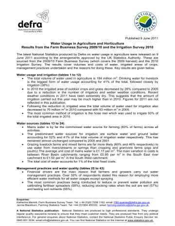 Published 9 June 2011 Water Usage in Agriculture and Horticulture Results from the Farm Business Survey 2009/10 and the Irrigation Survey 2010 The latest National Statistics produced by Defra on water usage in agriculture were released on 9 June 2011 according to the arrangements approved by the UK Statistics Authority. These are sourced from the 2009/10 Farm Business Survey (which covers the 2009 harvest) and the 2010 Irrigation Survey. The results cover volumes and costs of water, irrigated areas of crops, management practices undertaken and the reasons for doing these. Key results are given below. Water usage and irrigation (tables 1 to 12) • The total volume of water used in agriculture is 184 million m3. Drinking water for livestock is the biggest form of water usage accounting for 41% of the total, followed closely by irrigation (38%). • In 2010 the irrigated area of outdoor crops and grass decreased by 28% compared to 2005 due to a reduction in the number of irrigators and wetter weather conditions. Recent weather conditions in 2011 have been extremely dry. This suggests that the amount of irrigation carried out this year may be much higher than in 2010. Figures for 2011 are not reflected in this publication. • Following the reduction in irrigated area the total volume of water used for irrigation also decreased to 70 million m3 in 2010 compared with 93 million m3 in 2005. • The most common method of irrigation is the hose reel which was used to irrigate 93% of the total irrigated area in 2010. Water sources (tables 13 to 24) • Mains water is by far the commonest water source for farming (83% of farms) across all activities. • The predominant water sources for irrigation are surface water and ground water accounting for 52% and 41% of the total volume of irrigation water respectively. This has remained almost unchanged compared to 2005 and 2001. • Grazing livestock farms and mixed farms are far more likely (60% and 46% respectively) to use water from rivers/streams or springs than cropping and granivore farms (pigs and poultry).The average unit cost of mains water is £1.17 per m3. The main variation in costs is between River Basin catchments ranging from £0.95 per m3 in the South East river catchment to £1.50 per m3 in the South West catchment. • The total cost of water accounts for 1% of the total fixed costs. Management practices and water quality (tables 25 to 43) • Financial drivers are the main reason that farmers and growers carry out water management practices. Over 50% of respondents stated this reason for employing more efficient water methods for all water usages except spraying. • The most common practices being conducted to reduce or prevent water pollution are calibrating fertiliser spreaders (58%), reducing stocking rates when the soil are wet (57%) and testing soil nutrients (55%). Enquiries: Katherine Merrett, Farm Business Survey Team. Tel: + 44 (0)20 7238 1162, email: [email protected] Jennie Blackburn, Farming Statistics Team. Tel: +44 (0)1904 455332, email: [email protected]. A National Statistics publication. National Statistics are produced to high professional standards. They undergo regular quality assurance reviews to ensure that they meet customer needs. They are produced free from any political interference. For general enquiries about National Statistics, contact the National Statistics Public Enquiry Service: tel. 0845 601 3034; email:[email protected]. You can find National Statistics on the internet at www.statistics.gov.uk. Background to surveys The government’s new water strategy was published on the 7 February 2008 and highlights the importance of water for both business and residential users. Because of our need to adapt to climate change and other pressures such as changing land use, we need to find ways of using water much more efficiently and sustainably. Whilst agriculture water use amounts to only 1% of England’s water usage, there are great regional differences with, for example in Eastern England, agriculture accounts for 16% of water usage. Agriculture is also the single biggest cause of diffuse water pollution. This is unsurprising, as agriculture covers 70% of the land area in England and diffuse pollution, including loss of nutrients from fertilisers and manure, is an unavoidable consequence of farming. Increases in nutrient levels can result in eutrophication of streams, rivers and lakes, leading to reduced biodiversity, as well as increased treatment costs for tap water. There are two aspects therefore, to considering water as a resource; water quality and water usage. Direct monitoring of water quality requires scientific monitoring by others but there is scope for quantifying levels/changes in farm practices that contribute to water quality such as fertiliser use (including organic waste), pesticide use, soil nutrient balances and farm practices (e.g. erosion, tillage, cover crops, manure storage). Within the agriculture industry water has a number of uses including irrigation, spraying, drinking for livestock and washing down livestock buildings. Some farms abstract water from rivers and boreholes whilst others rely solely on the mains supply. Livestock may have access to rivers and streams for drinking which can be a source of pollution and river bank erosion. Significant data gaps exist in terms of supply and utilisation of water, economic cost of water and water related activities and behavioral attitudes among farmers to water management. The Farm Business Survey (FBS) was identified as a good research medium to collect this information and additional questions were included in the 2009/10 campaign. By using the FBS relationships between water usage and farm type, size, profitability and location can be explored. Data on irrigation of outdoor crops and grass was required to be collected as part of the 2010 Structure Survey to meet EC legislation. The 2010 Irrigation Survey was designed to collect the