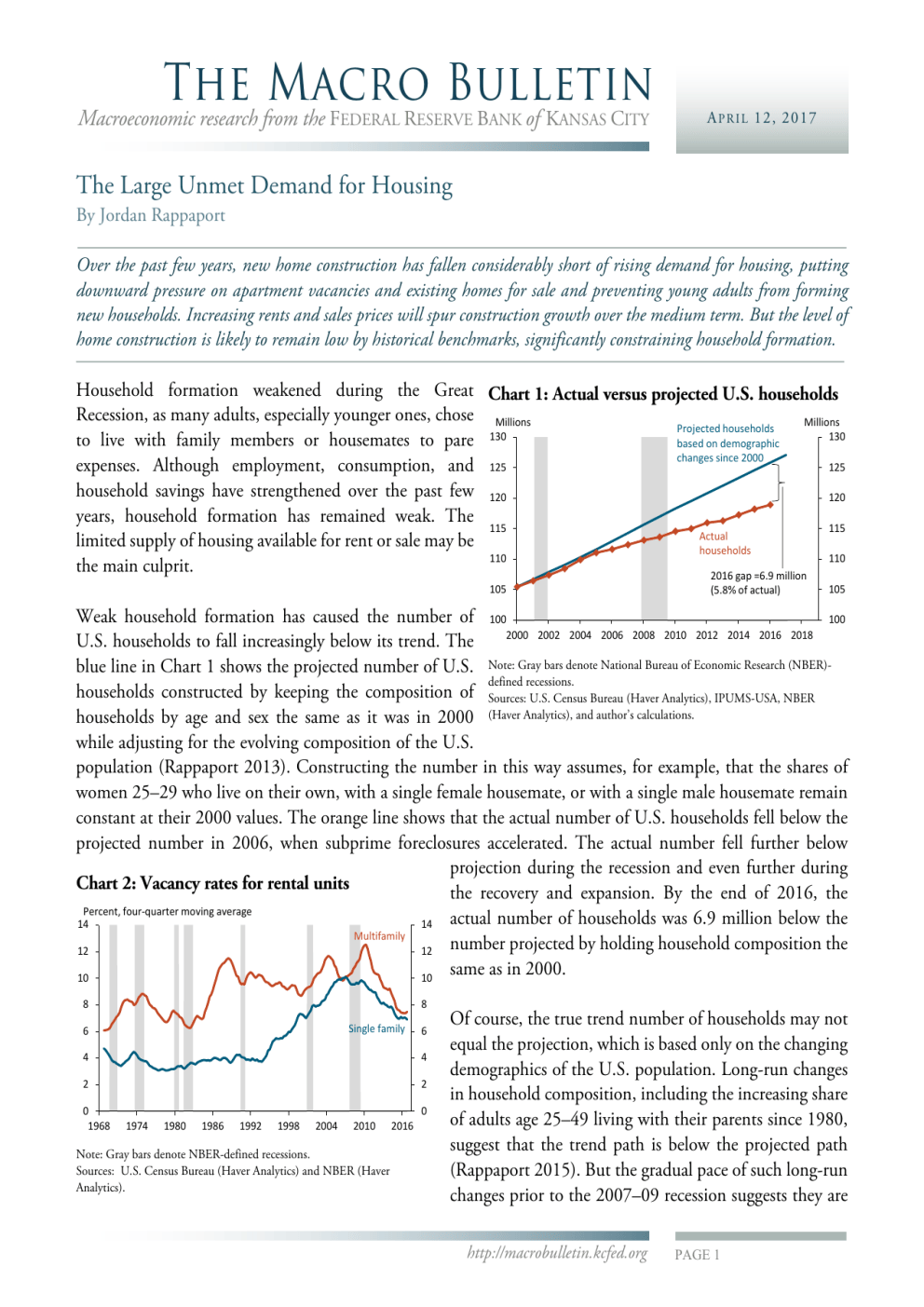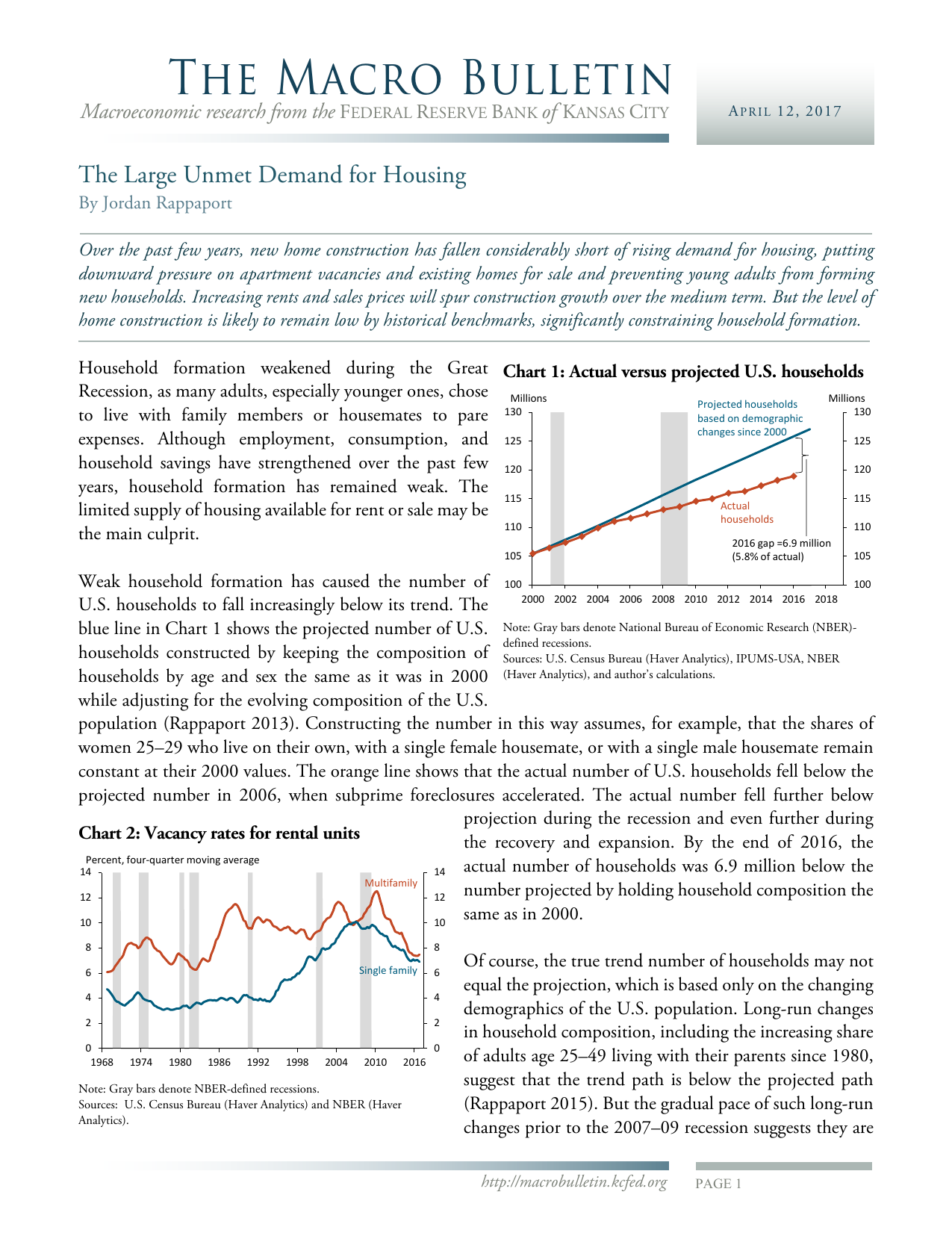 The Macro Bulletin Macroeconomic research from the FEDERAL RESERVE BANK of KANSAS CITY A P R I L 12, 2017 The Large Unmet Demand for Housing By Jordan Rappaport Over the past few years, new home construction has fallen considerably short of rising demand for housing, putting downward pressure on apartment vacancies and existing homes for sale and preventing young adults from forming new households. Increasing rents and sales prices will spur construction growth over the medium term. But the level of home construction is likely to remain low by historical benchmarks, significantly constraining household formation. Household formation weakened during the Great Chart 1: Actual versus projected U.S. households Recession, as many adults, especially younger ones, chose Millions Millions Projected households 130 to live with family members or housemates to pare 130 based on demographic changes since 2000 125 expenses. Although employment, consumption, and 125 household savings have strengthened over the past few 120 120 years, household formation has remained weak. The 115 115 Actual limited supply of housing available for rent or sale may be households 110 110 the main culprit. 2016 gap =6.9 million 105 (5.8% of actual) 105 Weak household formation has caused the number of 100 100 2000 2002 2004 2006 2008 2010 2012 2014 2016 2018 U.S. households to fall increasingly below its trend. The blue line in Chart 1 shows the projected number of U.S. Note: Gray bars denote National Bureau of Economic Research (NBER)defined recessions. households constructed by keeping the composition of Sources: U.S. Census Bureau (Haver Analytics), IPUMS-USA, NBER households by age and sex the same as it was in 2000 (Haver Analytics), and author’s calculations. while adjusting for the evolving composition of the U.S. population (Rappaport 2013). Constructing the number in this way assumes, for example, that the shares of women 25–29 who live on their own, with a single female housemate, or with a single male housemate remain constant at their 2000 values. The orange line shows that the actual number of U.S. households fell below the projected number in 2006, when subprime foreclosures accelerated. The actual number fell further below projection during the recession and even further during Chart 2: Vacancy rates for rental units the recovery and expansion. By the end of 2016, the Percent, four-quarter moving average actual number of households was 6.9 million below the 14 14 Multifamily number projected by holding household composition the 12 12 same as in 2000. 10 10 8 8 Single family 6 6 4 4 2 2 0 1968 0 1974 1980 1986 1992 1998 2004 2010 Note: Gray bars denote NBER-defined recessions. Sources: U.S. Census Bureau (Haver Analytics) and NBER (Haver Analytics). 2016 Of course, the true trend number of households may not equal the projection, which is based only on the changing demographics of the U.S. population. Long-run changes in household composition, including the increasing share of adults age 25–49 living with their parents since 1980, suggest that the trend path is below the projected path (Rappaport 2015). But the gradual pace of such long-run changes prior to the 2007–09 recession suggests they are http://macrobulletin.kcfed.org PAGE 1 The Macro Bulletin Macroeconomic research from the FEDERAL RESERVE BANK of KANSAS CITY A P R I L 12, 2017 unlikely to account for more than half of the shortfall between actual and projected households, leaving the actual number of households at the end of 2016 at least 3.5 million below its trend level. Chart 3: Ratio of construction starts to U.S. households Percent of U.S. households, three-month moving average, SAAR 4.0 4.0 3.5 3.5 3.0 3.0 2.5 2.5 2.0 2.0 1.5 Total 1.0 0.5 0.0 1957 Single family 1964 1971 1978 1985 1992 1999 2006 1.5 1.0 0.5 0.0 2013 Note: Gray bars denote NBER-defined recessions. Sources: U.S. Census Bureau (Haver Analytics), NBER (Haver Analytics), and author’s calculations. A low supply of housing may explain the gap. The Census Bureau defines a household as an occupied housing unit; household formation thus depends on the availability of apartments and houses to move into. Potential renters have faced the lowest vacancy rates on existing apartments and houses in many years (Chart 2). And while construction of new apartments has boomed over the past few years, it has centered disproportionately on luxury units too expensive for most young adults. Meanwhile, construction of new houses as a share of U.S. households is near its lowest level since at least 1957, the earliest date for which data are available (Chart 3). A related consequence of this supply shortfall is that spending on housing services—in other words, the estimated rent of all occupied homes—has been one of the slowest growing components of personal consumption over the past few years. Its average growth rate during 2015 and 2016 was 1.5 percent, approximately half the growth rate of consumption of all other goods and services. Low single-family home construction is also pushing Chart 4: Ratio of existing homes listed for sale to down both the number of existing single-family homes U.S. households for sale and apartment vacancies. Existing single-family Percent of U.S. households, three-month moving average, SA 3.6 homes for sale as a share of households is currently at its 3.6 3.2 lowest level since at least 1982, the earliest date for which 3.2 data are available (Chart 4). Households looking to 2.8 2.8 upgrade to a newly constructed house have faced more 2.4 2.4 limited choices recently than in the past, causing many to 2.0 2.0 decide to remain in their own house rather than listing it 1.6 1.6 for sale. In consequence, households looking to purchase 1.2 1.2 an existing house have also faced more limited choices. 1996 2001 2006 2016 1981 1986 1991 2011 The low number of single-family homes available for sale Note: Gray bars denote NBER-defined recessions. is, in turn, likely to