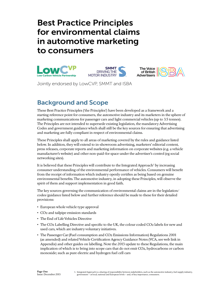 Best Practice Principles for environmental claims in automotive marketing to consumers Jointly endorsed by LowCVP, SMMT and ISBA Background and Scope These Best Practice Principles (‘the Principles’) have been developed as a framework and a starting reference point for consumers, the automotive industry and its marketers in the sphere of marketing communications for passenger cars and light commercial vehicles (up to 3.5 tonnes). The Principles are not intended to supersede existing legislation, the mandatory Advertising Codes and government guidance which shall still be the key sources for ensuring that advertising and marketing are fully compliant in respect of environmental claims. These Principles shall apply to all areas of marketing covered by the rules and guidance listed below. In addition, they will extend to in-showroom advertising, marketers’ editorial content, press releases, corporate reports and marketing information on corporate websites (e.g. a vehicle manufacturer’s website) and other non-paid-for space under the advertiser’s control (eg social networking sites). It is believed that these Principles will contribute to the Integrated Approach1 by increasing consumer understanding of the environmental performance of vehicles. Consumers will benefit from the receipt of information which industry openly certifies as being based on genuine environmental benefits. The automotive industry, in adopting these Principles, will observe the spirit of them and support implementation in good faith. The key sources governing the communication of environmental claims are in the legislation/ codes/guidance listed below and further reference should be made to these for their detailed provisions: • European whole vehicle type approval • CO2 and tailpipe emission standards • The End of Life Vehicles Directive • The CO2 Labelling Directive and specific to the UK, the colour coded CO2 labels for new and used cars, which are industry voluntary initiatives. • The Passenger Car (Fuel consumption and CO2 Emissions Information) Regulations 2001 (as amended) and related Vehicle Certification Agency Guidance Notes (VCA, see web link in Appendix) and other guides on labelling. Note the 2013 update to these Regulations, the main implication of which is to bring into scope cars that do not emit CO2, hydrocarbons or carbon monoxide; such as pure electric and hydrogen fuel cell cars Page One Issue: December 2013 1. Integrated Approach is a sharing of responsibility between stakeholders, such as the automotive industry, fuel supply industry, government – at local, national and European levels – and, of key importance, consumers. Best Practice Principles for environmental claims in automotive marketing to consumers • International standards such as ISO 14021 on environmental labelling • The Consumer Protection from Unfair Trading Regulations 2008. • The Business Protection from Misleading Marketing Regulations 2008 • The UK Code of Non-Broadcast Advertising, Sales Promotion and Direct Marketing (CAP Code) effective from 1 September 2010 (as updated) • The UK Code of Broadcast Advertising BCAP Code) effective from 1 September 2010 (as updated) • Defra Green Claims Code 1998 (updated 2000) and Green Claims Guidance 2011 • Advertising and Marketing Communication Practice Consolidated International Chamber of Commerce (ICC) Code – 2011. Additional information on the most relevant legislation of these is set out in the Appendix. Endorsement Organisations LowCVP (Low Carbon Vehicle Partnership) has joined with the representatives of UK industry to establish these best practice principles. The LowCVP, which was established in 2003, is a public-private partnership working to accelerate a sustainable shift to lower carbon vehicles and fuels and create opportunities for UK business. Over 170 member-organisations from diverse backgrounds are engaged including automotive and fuel supply chains, vehicle users, academics, environment groups and others. Visit the LowCVP homepage for more information: www.lowcvp.org.uk SMMT (The Society of Motor Manufacturers and Traders Limited) is the leading trade association for the UK automotive industry; it represents companies ranging from vehicle manufacturers, component and material suppliers to power train providers and design engineers. Visit the SMMT homepage for more information: www.smmt.co.uk ISBA (Incorporated Society of British Advertisers Limited) is the representative body for British Advertisers, covering all sectors of the economy and the public sector. Visit the IBSA homepage and cars pages for more information: www.isba.org.uk and www.isba.org.uk/issues/ cars The Best Practice Principles 1) General principles and definitions a) Marketing communications should be legal, decent, honest and truthful. b) The same good standards of commercial practices should apply throughout the marketing chain. c) Consumers should be able to access information to make informed purchases with ease. d) An environmental claim means information appearing in marketing communications which can be taken as saying something about its environmental aspects.2 e) A marketing communication includes advertising as well as other techniques, such as promotions, sponsorships, and direct marketing, and should be interpreted broadly to mean any form of communication produced directly by or on behalf of marketers intended primarily to promote products or to influence consumer behaviour.3 Page Two Issue: December 2013 2. DEFRA Green Claims Code. 3. Consolidated ICC Code of Advertising and Marketing Communication Practice. Best Practice Principles for environmental claims in automotive marketing to consumers 2) Environmental principles Environmental claims should: a) Be specific. b) Not mislead. c) Be capable of substantiation. d) Be transparent, unambiguous and clearly expressed. e) Follow a common sense approach. 3) Accessibility of information and plain language a