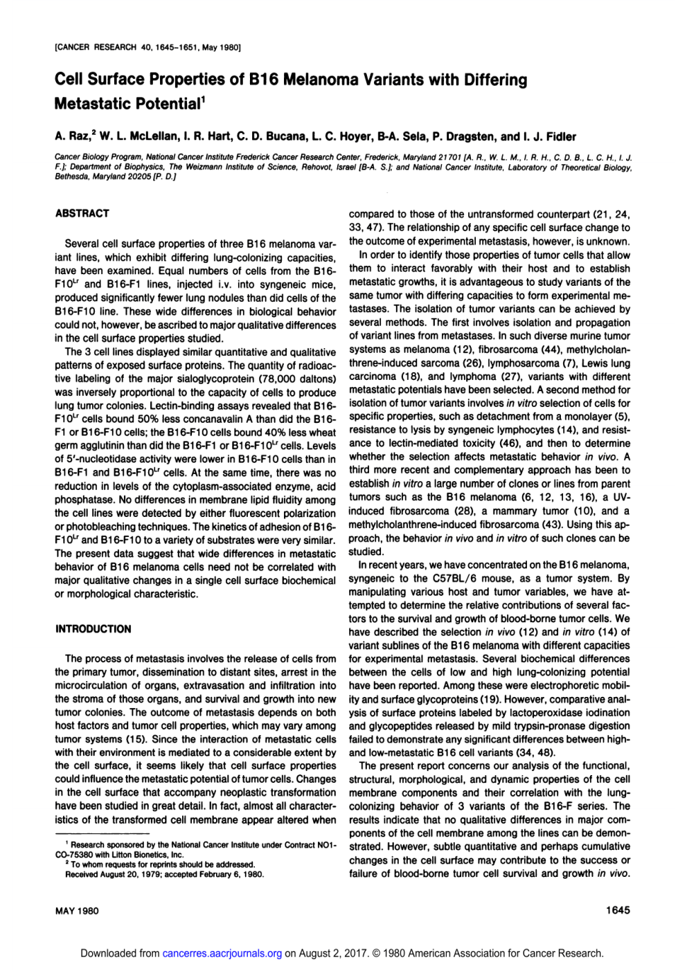 [CANCER RESEARCH 40, 1645-1651, May 1980] Cell Surface Properties of B16 Melanoma Variants with Differing Metastatic Potential1 A. Raz,2 W. L. McLellan, I. R. Hart, C. D. Bucana, L. C. Hoyer, B-A. Sela, P. Dragsten, and I. J. Fidler Cancer Biology Program. National Cancer Institute Frederick Cancer Research Center, Frederick, Maryland 21701 [A. R., W. L. M.. I. R. H., C. D B., L. C. H., l. J. F.]; Department of Biophysics, The Weizmann Institute of Science, Rehovot. Israel ¡B-A. SJ; and National Cancer Institute, Laboratory of Theoretical Biology Bethesda, Maryland 20205 [P. D.] ABSTRACT Several cell surface properties of three B16 melanoma var iant lines, which exhibit differing lung-colonizing capacities, have been examined. Equal numbers of cells from the B16F10Lr and B16-F1 lines, injected i.v. into syngeneic mice, produced significantly fewer lung nodules than did cells of the B16-F10 line. These wide differences in biological behavior could not, however, be ascribed to major qualitative differences in the cell surface properties studied. The 3 cell lines displayed similar quantitative and qualitative patterns of exposed surface proteins. The quantity of radioac tive labeling of the major sialoglycoprotein (78,000 dallons) was inversely proportional to the capacity of cells to produce lung tumor colonies. Lectin-binding assays revealed that B16F10Lr cells bound 50% less concanavalin A than did the B16F1 or B16-F10 cells; the B16-F10 cells bound 40% less wheat germ agglutinin than did the B16-F1 or B16-F10Lr cells. Levels of 5'-nucleotidase activity were lower in B16-F10 cells than in B16-F1 and B16-F10Lr cells. At the same time, there was no reduction in levels of the cytoplasm-associated enzyme, acid phosphatase. No differences in membrane lipid fluidity among the cell lines were detected by either fluorescent polarization or photobleaching techniques. The kinetics of adhesion of B16F10Lr and B16-F10 to a variety of substrates were very similar. The present data suggest that wide differences in metastatic behavior of B16 melanoma cells need not be correlated with major qualitative changes in a single cell surface biochemical or morphological characteristic. INTRODUCTION The process of metastasis involves the release of cells from the primary tumor, dissemination to distant sites, arrest in the microcirculation of organs, extravasation and infiltration into the stroma of those organs, and survival and growth into new tumor colonies. The outcome of metastasis depends on both host factors and tumor cell properties, which may vary among tumor systems (15). Since the interaction of metastatic cells with their environment is mediated to a considerable extent by the cell surface, it seems likely that cell surface properties could influence the metastatic potential of tumor cells. Changes in the cell surface that accompany neoplastic transformation have been studied in great detail. In fact, almost all character istics of the transformed cell membrane appear altered when 1 Research sponsored by the National Cancer Institute under Contract NO1CO-75380 with Litton Bionetics, Inc. 2 To whom requests for reprints should be addressed. Received August 20, 1979; accepted February 6, 1980. compared to those of the untransformed counterpart (21, 24, 33, 47). The relationship of any specific cell surface change to the outcome of experimental metastasis, however, is unknown. In order to identify those properties of tumor cells that allow them to interact favorably with their host and to establish metastatic growths, it is advantageous to study variants of the same tumor with differing capacities to form experimental mé tastases. The isolation of tumor variants can be achieved by several methods. The first involves isolation and propagation of variant lines from métastases.In such diverse murine tumor systems as melanoma (12), fibrosarcoma (44), methylcholanthrene-induced sarcoma (26), lymphosarcoma (7), Lewis lung carcinoma (18), and lymphoma (27), variants with different metastatic potentials have been selected. A second method for isolation of tumor variants involves in vitro selection of cells for specific properties, such as detachment from a monolayer (5), resistance to lysis by syngeneic lymphocytes (14), and resist ance to lectin-mediated toxicity (46), and then to determine whether the selection affects metastatic behavior in vivo. A third more recent and complementary approach has been to establish in vitro a large number of clones or lines from parent tumors such as the B16 melanoma (6, 12, 13, 16), a UVinduced fibrosarcoma (28), a mammary tumor (10), and a methylcholanthrene-induced fibrosarcoma (43). Using this ap proach, the behavior in vivo and in vitro of such clones can be studied. In recent years, we have concentrated on the B16 melanoma, syngeneic to the C57BL/6 mouse, as a tumor system. By manipulating various host and tumor variables, we have at tempted to determine the relative contributions of several fac tors to the survival and growth of blood-borne tumor cells. We have described the selection in vivo (12) and in vitro (14) of variant sublines of the B16 melanoma with different capacities for experimental metastasis. Several biochemical differences between the cells of low and high lung-colonizing potential have been reported. Among these were electrophoretic mobil ity and surface glycoproteins (19). However, comparative anal ysis of surface proteins labeled by lactoperoxidase iodination and glycopeptides released by mild trypsin-pronase digestion failed to demonstrate any significant differences between highl and low-metastatic B16 cell variants (34, 48). The present report concerns our analysis of the functional, structural, morphological, and dynamic properties of the cell membrane components and their correlation with the lungcolonizing behavior of 3 variants of the B16-F series. The results indicate that no qualitative differences in major com ponents of the cell membr