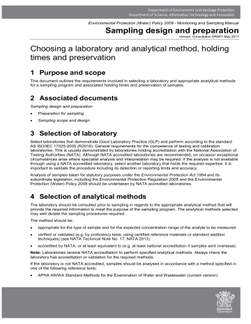 Environmental Protection (Water) Policy 2009 - Monitoring and Sampling Manual Sampling design and preparation Version: Consultation DRAFT May 2017 Choosing a laboratory and analytical method, holding times and preservation 1 Purpose and scope This document outlines the requirements involved in selecting a laboratory and appropriate analytical methods for a sampling program and associated holding times and preservation of samples. 2 Associated documents Sampling design and preparation: Preparation for sampling Sampling scope and design 3 Selection of laboratory Select laboratories that demonstrate Good Laboratory Practice (GLP) and perform according to the standard AS ISO/IEC 17025-2005 (R2016): General requirements for the competence of testing and calibration laboratories. This is usually demonstrated by laboratories holding accreditation with the National Association of Testing Authorities (NATA). Although NATA accredited laboratories are recommended, on occasion exceptional circumstances arise where specialist analysis and interpretation may be required. If the analysis is not available through using a NATA accredited laboratory, select another laboratory that holds the required expertise. It is important to validate the procedure including its detection or reporting limits and accuracy. Analysis of samples taken for statutory purposes under the Environmental Protection Act 1994 and its subordinate legislation, including the Environmental Protection Regulation 2008 and the Environmental Protection (Water) Policy 2009 should be undertaken by NATA accredited laboratories. 4 Selection of analytical methods The laboratory should be consulted prior to sampling in regards to the appropriate analytical method that will provide the required information to meet the purpose of the sampling program. The analytical methods selected may well dictate the sampling procedures required. The method should be: appropriate for the type of sample and for the expected concentration range of the analyte to be measured verified or validated (e.g. by proficiency tests, using certified reference materials or standard addition techniques) (see NATA Technical Note No. 17; NATA 2013) accredited by NATA, or at least equivalent to (e.g. at least national accreditation if samples sent overseas). Note: Laboratories receive NATA accreditation to perform specified analytical methods. Always check the laboratory has accreditation or validation for the required methods. If the laboratory is not NATA accredited, samples should be analysed in accordance with a method specified in one of the following reference texts: APHA AWWA Standard Methods for the Examination of Water and Wastewater (current version) Choosing a laboratory and analytical method, holding times and preservation USEPA Clean Water Act Analytical Methods (current version) ASTM, Annual Book of ASTM Standards Volume 11.01 Water (I), 11.02 Water (II) (current version) relevant Australian Standards (current version) relevant ISO Standard (current version). Alternative methods to those described in the reference texts can be used, provided the laboratory has validated the alternative method and proven that the results obtained are equivalent to those that would be obtained using the prescribed method. The laboratory also needs to show that the results are within the uncertainty stated for the prescribed method. 5 Limits of detection and reporting The limit of reporting (LOR) for an analytical method should be lower than the benchmark (such as water quality objective, water quality guidelines or trigger values, Environmental Authority (EA) limits or other standards) to which the results will be compared. The LOR is the lowest concentration of an analytical parameter that can be detected by a particular method that has acceptable precision and accuracy. If the LOR is higher than the benchmark, alternative methods of sampling should be investigated (e.g. passive sampling). 6 Holding times and preservation Holding times (how long a sample can be kept between collection and analysis), and preservation of samples is critically important for the integrity of a sampling program, as the constituents of samples may change between collection of samples and analysis (as a result of chemical, biological or physical reactions). (AS/NZS 5667.1:1998). Guidance for different holding times and preservation methods is provided in: APHA AWWA Standard Methods for the Examination of Water and Wastewater (current version) USEPA Clean Water Act Analytical Methods (current version) Australian and New Zealand Standard: AS/NZS 5667.1:1998. Ideally the holding times and preservation methods specified in the aforementioned documents should be adhered to. However alternative methods may be determined for samples collected as part of an on-going monitoring program (e.g. Oudyn et al. 2012). Alternative methods can be used in such cases, if the alternative method has been validated and the laboratory can demonstrate the results obtained are equivalent to the results that would be obtained using the relevant prescribed holding times/preservation method. The analytical laboratory should be contacted for advice on holding times and preservation before any samples are collected. Some holding times are extremely short (for example pH and chlorine) and the use of in situ tests and test kits may be more appropriate than laboratory analysis. 7 References and additional reading APHA AWWA (current version) Standard Methods for the Examination of Water and Wastewater, American Public Health Association (APHA), the American Water Works Association (AWWA) and the Water Environment Federation (WEF). ASTM (current version), Annual Book of ASTM Standards: Volume 11.01 Water (I), 11.02 Water (II). Australian and New Zealand Standard (AS/NZS) 5667.1:1998, Water quality—Sampling Part 1: Guidance on the design of sampling programs, sampling techniques and the preservation and handling of samples. National Associa