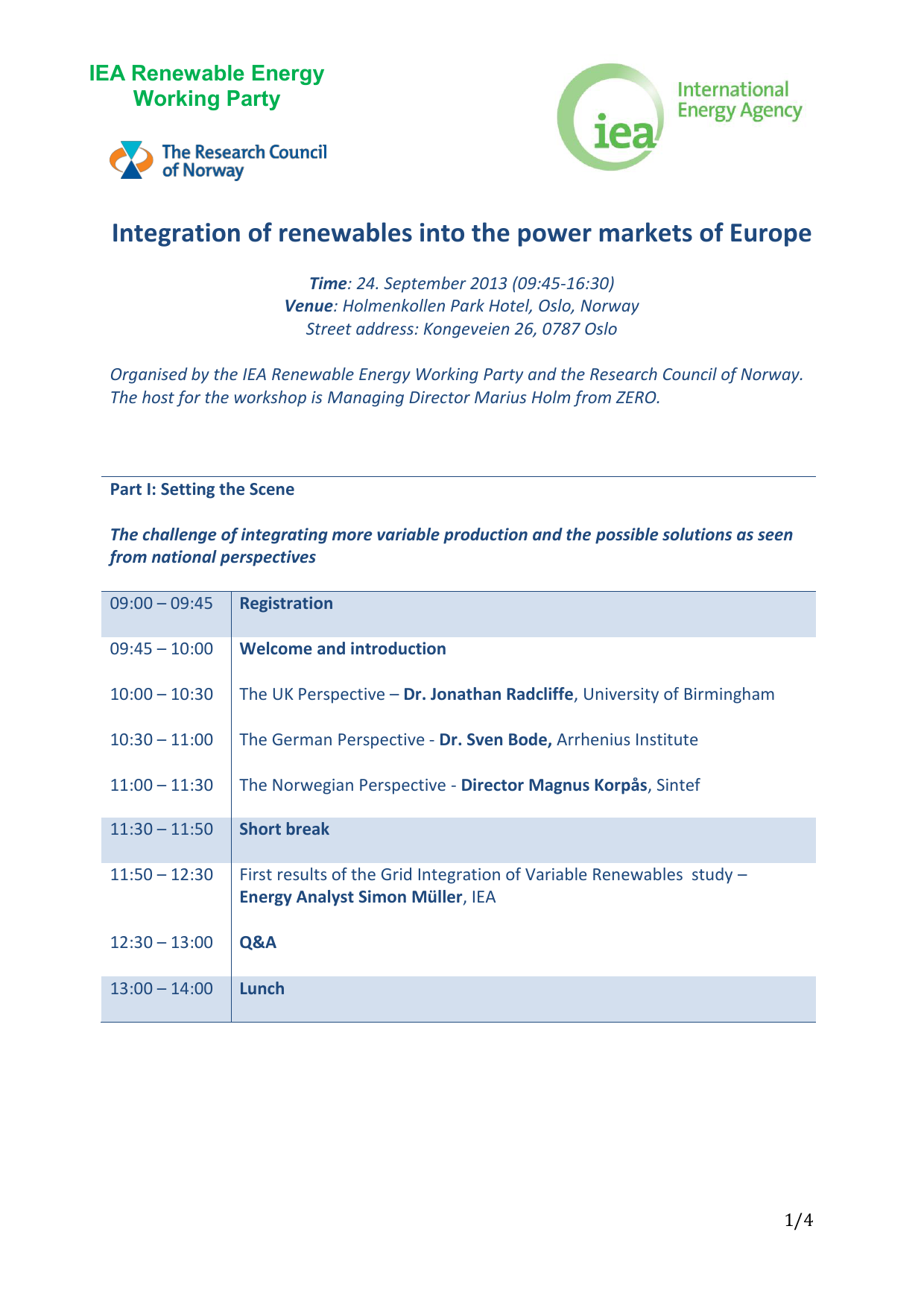 IEA Renewable Energy Working Party Integration of renewables into the power markets of Europe Time: 24. September 2013 (09:45-16:30) Venue: Holmenkollen Park Hotel, Oslo, Norway Street address: Kongeveien 26, 0787 Oslo Organised by the IEA Renewable Energy Working Party and the Research Council of Norway. The host for the workshop is Managing Director Marius Holm from ZERO. Part I: Setting the Scene The challenge of integrating more variable production and the possible solutions as seen from national perspectives 09:00 – 09:45 Registration 09:45 – 10:00 Welcome and introduction 10:00 – 10:30 The UK Perspective – Dr. Jonathan Radcliffe, University of Birmingham 10:30 – 11:00 The German Perspective - Dr. Sven Bode, Arrhenius Institute 11:00 – 11:30 The Norwegian Perspective - Director Magnus Korpås, Sintef 11:30 – 11:50 Short break 11:50 – 12:30 First results of the Grid Integration of Variable Renewables study – Energy Analyst Simon Müller, IEA 12:30 – 13:00 Q&A 13:00 – 14:00 Lunch 1/4 IEA Renewable Energy Working Party Part II: Today’s Markets - Are They Up for the Challenge? Current market places and need for new market mechanisms, new incentives and crossborder transmission capacity 14:00 – 14:20 The European Power Market – Director Audrey Mahuet, EPEX Spot 14:20 – 14:40 The Nordic Power Market – Director Hans Randen, Nordpool Spot 14:40 – 15:00 Investment signals for power producers – Vice president Håkon Egeland, Statkraft 15:00 – 15:15 Short break 15:15 – 15:35 Interconnection capacity and regulation – Chief Economist Jan Bråten, Statnett Part III: Political Implications What political decisions are needed and what are the prospects? 15:35– 15:50 Interconnector policy and balancing services – Specialist Director Manus Pandey, The Ministry of Petroleum and Energy 15:50 – 16:15 Panel discussion on the road to a functioning market design Simon Müller, Jonathan Radcliffe, Sven Bode 16:15 – 16:30 Conclusions 17:00 – 18:30 Social program Contact Research Council: Andreas Bratland, [email protected] 2/4 IEA Renewable Energy Working Party About the speakers Dr. Jonathan Radcliffe, University of Birmingham Jonathan Radcliffe studied physics at Imperial College and Cambridge and was Head of the Analysis Team for the UK’s Energy Research Partnership (ERP), leading its work on energy storage and flexibility options for the energy system. In 2013 he took up a position to establish a new centre for energy storage through the Centre for Low Carbon Futures. Dr. Sven Bode, Arrhenius Institute Sven Bode was a co-founder of the Arrhenius Institute in 2005. He has a doctorate in environmental economics of the University of Hamburg, has worked for Industry and Ministries on topics concerning climate change and mitigation efforts. He authored several expert studies on emissions and green certificate trading as well as on the integration of renewable energies into liberalised power markets; his work was also published in international peer-reviewed journals. Director Magnus Korpås, Sintef Magnus Korpås did his doctoral thesis in the field of wind power and energy storage. He has led projects on grid integration of offshore and onshore wind power as well as modelling, simulation and analysis of power systems and markets. He is currently the research director at the Energy Systems Department of SINTEF. Energy Analyst Simon Müller, IEA Simon Müller leads the IEA work on the Grid- and System Integration of Renewables focusing on the technical and economic impacts of high shares of variable renewable generation. Prior to working on system integration, he co-authored the IEA publication Deploying Renewables 2011 – Best and Future Policy Practice, which provides a comparative assessment of the impact and cost-effectiveness of RE support policies in OECD and BRICS countries. Before joining the IEA, Mr. Mueller worked for a technical cooperation project in the Mediterranean and the German Government. He holds a M.Sc. in Physics from the University of Bremen. Director Audrey Mahuet, EPEX Spot Audrey Mahuet has worked with the energy markets since 2000, first as an analyst and currently as the director of product design and customer care. She holds a master in economic and statistical modelling from ENSAE. 3/4 IEA Renewable Energy Working Party Director Hans Randen, Nordpool Spot Hans Randen leads the European Integration department within Nord Pool Spot and is responsible for expansion into new markets and new business affairs. Hans worked for Nord Pool ASA from 1993 before joining Nord Pool Spot in 2009, with trading, product development and market surveillance as his main focus areas. Vice-president Håkon Egeland, Statkraft Håkon Egeland is a mechanical engineer from the Norwegian Institute of Technology and has a MBA from Norwegian School of Economics and Business Administration. He has been working with Statkraft since 1995 in different leading and advisory positions within transmission, regulatory affairs and market analysis. Chief Economist Jan Bråten, Statnett Jan Bråten holds a master’s degree in economy and was a partner at ECON doing research, development and consultancy work for power producers and government bodies from 1993. He joined Statnett in 2005 and is currently engaged in regulatory questions as well as grid development and business strategy. He is a board member for ENERGIX, the national energy research programme in Norway. Specialist Director Manus Pandey, The Ministry of Petroleum and Energy Manus Pandey is cand.oecon from the Norwegian School of economics. He has been working with infrastructure related issues at the Norwegian Department of Energy since 2007. 4/4