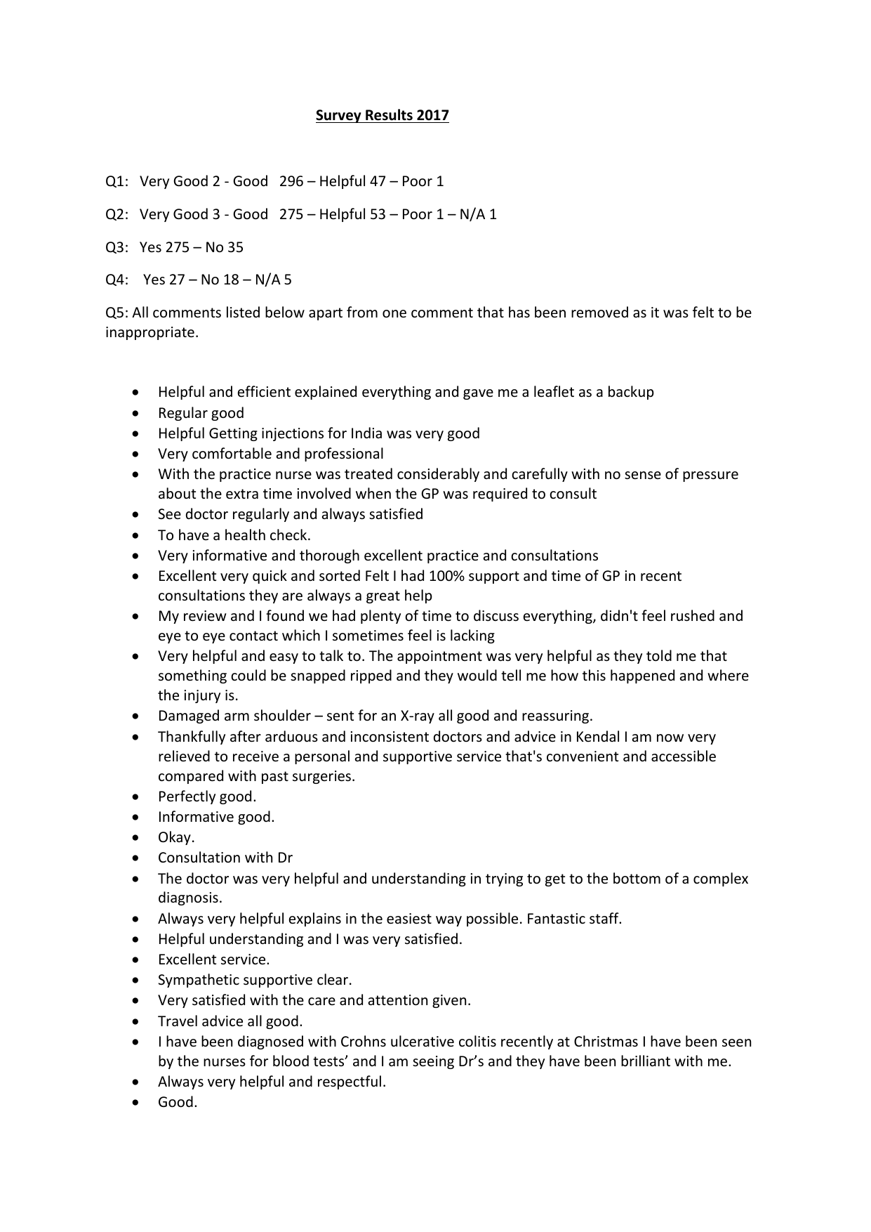 Survey Results 2017 Q1: Very Good 2 - Good 296 – Helpful 47 – Poor 1 Q2: Very Good 3 - Good 275 – Helpful 53 – Poor 1 – N/A 1 Q3: Yes 275 – No 35 Q4: Yes 27 – No 18 – N/A 5 Q5: All comments listed below apart from one comment that has been removed as it was felt to be inappropriate. Helpful and efficient explained everything and gave me a leaflet as a backup Regular good Helpful Getting injections for India was very good Very comfortable and professional With the practice nurse was treated considerably and carefully with no sense of pressure about the extra time involved when the GP was required to consult See doctor regularly and always satisfied To have a health check. Very informative and thorough excellent practice and consultations Excellent very quick and sorted Felt I had 100% support and time of GP in recent consultations they are always a great help My review and I found we had plenty of time to discuss everything, didn't feel rushed and eye to eye contact which I sometimes feel is lacking Very helpful and easy to talk to. The appointment was very helpful as they told me that something could be snapped ripped and they would tell me how this happened and where the injury is. Damaged arm shoulder – sent for an X-ray all good and reassuring. Thankfully after arduous and inconsistent doctors and advice in Kendal I am now very relieved to receive a personal and supportive service that's convenient and accessible compared with past surgeries. Perfectly good. Informative good. Okay. Consultation with Dr The doctor was very helpful and understanding in trying to get to the bottom of a complex diagnosis. Always very helpful explains in the easiest way possible. Fantastic staff. Helpful understanding and I was very satisfied. Excellent service. Sympathetic supportive clear. Very satisfied with the care and attention given. Travel advice all good. I have been diagnosed with Crohns ulcerative colitis recently at Christmas I have been seen by the nurses for blood tests’ and I am seeing Dr’s and they have been brilliant with me. Always very helpful and respectful. Good. I felt I had the time to explain my problem and was listened to and given the chance to ask questions. All excellent. Very happy with the service. Listen to address concerns very reassuring. Knee problems Aches et cetera sent to x-ray very prompt text results. I find doctors extremely helpful I find it less helpful seen the nurse practitioner and have asked not to the pharmacy and reception staff are always friendly and helpful I like it that even the locums are regular. Exceptional the doctor was able to refer me to a specialist at WGH immediately an excellent practice. I visited my practice nurse who referred me to my own doctor. He put my mind at rest and don't with this issue with care and consideration. Recently accompanied an elderly patient on a very delicate issue which was treated with great sensitivity by both nurse and GP. Diabetic update (annual) and very well informed and easy to understand the nurse. Very good. Good and thorough. Good service can always get an appointment. My last consultation with the doctor was good helpful receive quick action. Very good. Appointment took time sympathetic response and help received. Good helpful. Very helpful kind and easy to book was not long so good carer regularly so known me. Very good. Quick and efficient. Very happy with the consultation we're very helpful. Lovely warm and welcoming. As always I found my doctor went above and beyond the call of duty this time to tell me about research that might help the treatment. Excellent service. The staff are fantastic and really go above and beyond their job to help. They are always friendly and welcoming outstanding service. Fine. I consulted about breathlessness and the doctor examined me thoroughly and called an ambulance that carried me to Lancaster Royal infirmary. All very good. Very good and helpful and informative. The practice has always been very professional caring and helpful. Very good service. Very helpful and options clearly outlined. Satisfied. Routine blood tests efficiently, doctored pleasant and positive interaction all aspects and risks explained. Good efficient and helpful. Very helpful and the staff were friendly. Very efficient check on history and what is been checked and what happens next. Potentially cracked one of my ribs. I got it checked out and was dealt with very quickly. Very satisfied. The nurse was very good and was very informative. Very good took their time got appointments at hospital sorted quickly for you. Very good. No problems. Childs appointment very kind and helpful. Very simple and easy to talk to. For my asthma. Very thorough and helpful. It was very efficient. Helpful. Quick referred to the hospital in Kendal. Very helpful. 24 hour blood pressure monitor worked well and results reassuring. Always pleased with the service Nurses won’t go into further depth, they presume thing are simply common Very Good Dr very Good No Problem Drs and Nurses are always positive and listen well. Feel treated with respect. Efficient, focussed on issues resulting satisfactory treatment. Pleased with the appointment. Very Helpful Very helpful. The 8.30pm drop in service is a very convenient facility. The staff I saw have been very good and helpful with advice Thorough, effective, informative and reassuring. INR check usual nurse on holiday stand in helpful friendly and competent. Dr I saw regarding my heart troubles has referred me for another 24 hr monitor. He is always very helpful and friendly, thorough and genuine. Listened to my concerns and were very helpful. I was happy with the treatment they suggested. Injection was well done and painless delivered by a health care practitioner. Locum doctor who I felt did not look at my notes before making a diagnosis. Helpful. Kind. Lots of advice. Very Helpful –good at listening and suggested helpful action. Physio service very good Alwa