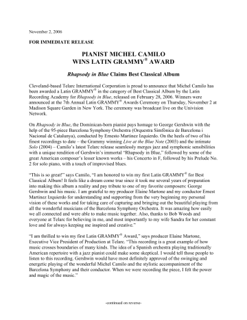 November 2, 2006 FOR IMMEDIATE RELEASE PIANIST MICHEL CAMILO WINS LATIN GRAMMY® AWARD Rhapsody in Blue Claims Best Classical Album Cleveland-based Telarc International Corporation is proud to announce that Michel Camilo has been awarded a Latin GRAMMY® in the category of Best Classical Album by the Latin Recording Academy for Rhapsody in Blue, released on February 28, 2006. Winners were announced at the 7th Annual Latin GRAMMY® Awards Ceremony on Thursday, November 2 at Madison Square Garden in New York. The ceremony was broadcast live on the Univision Network. On Rhapsody in Blue, the Dominican-born pianist pays homage to George Gershwin with the help of the 95-piece Barcelona Symphony Orchestra (Orquestra Simfònica de Barcelona i Nacional de Catalunya), conducted by Ernesto Martinez Izquierdo. On the heels of two of his finest recordings to date – the Grammy winning Live at the Blue Note (2003) and the intimate Solo (2004) – Camilo’s latest Telarc release seamlessly merges jazz and symphonic sensibilities with a unique rendition of Gershwin’s immortal “Rhapsody in Blue,” followed by some of the great American composer’s lesser known works – his Concerto in F, followed by his Prelude No. 2 for solo piano, with a touch of improvised blues. “This is so great!” says Camilo, “I am honored to win my first Latin GRAMMY® for Best Classical Album! It feels like a dream come true since it took me several years of preparation into making this album a reality and pay tribute to one of my favorite composers: George Gershwin and his music. I am grateful to my producer Elaine Martone and my conductor Ernest Martinez Izquierdo for understanding and supporting from the very beginning my personal vision of these works and for taking care of capturing and bringing out the beautiful playing from all the wonderful musicians of the Barcelona Symphony Orchestra. It was amazing how easily we all connected and were able to make music together. Also, thanks to Bob Woods and everyone at Telarc for believing in me, and most importantly to my wife Sandra for her constant love and for always keeping me inspired and creative.” “I am thrilled to win my first Latin GRAMMY® Award,” says producer Elaine Martone, Executive Vice President of Production at Telarc. “This recording is a great example of how music crosses boundaries of many kinds. The idea of a Spanish orchestra playing traditionally American repertoire with a jazz pianist could make some skeptical. I would tell those people to listen to this recording. Gershwin would have most definitely approved of the swinging and energetic playing of the wonderful Michel Camilo and the stylistic accompaniment of the Barcelona Symphony and their conductor. When we were recording the piece, I felt the power and magic of the music.” -continued on reverse- -2- On April 24, 2007, Camilo returns to the straight-ahead trio format with the release of Spirit of the Moment, which features bassist Charles Flores and drummer Dafnis Prieto. Since 1980, Telarc has been honored with 49 GRAMMY® Awards for performance, production, and engineering. Other important awards have included the French Grand Prix du Disque and Diapason d’Or; Japan’s Record of the Year; Germany’s Audiophile CD of the Year; Gramophone Magazine’s 2004 Label of the Year. Although it began as a classical-only recording company, Telarc now boasts a catalog of more than 1000 recordings, ranging from classical and classical-crossover to jazz, contemporary jazz, Americana, pop and blues. Telarc releases approximately fifty-five recordings each year, working with a notable roster of artists The Latin Recording Academy is a membership-based organization comprised of recording artists, musicians, producers and other creative and technical recording professionals who are dedicated to improving the quality of life and cultural conditions for Latin music and its makers. In addition to producing the Latin GRAMMY® Awards to honor excellence in the recording arts and sciences, the Latin Recording Academy provides educational and human services programs to the Latin music community. Michel Camilo’s Rhapsody in Blue (CD-83611) was released on February 28, 2006. CONTACT: Mike Wilpizeski 718 459 2117 [email protected]