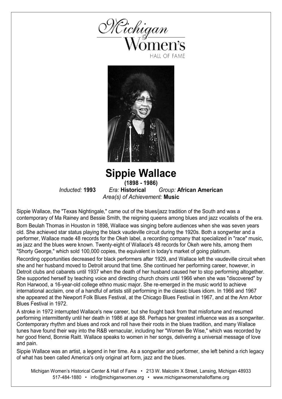 Sippie Wallace - Michigan Women`s Hall of Fame