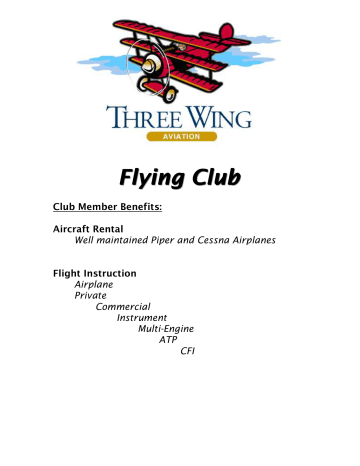 Flying Club Club Member Benefits: Aircraft Rental Well maintained Piper and Cessna Airplanes Flight Instruction Airplane Private Commercial Instrument Multi-Engine ATP CFI EXCITING DEMO FLIGHTS AVAILABLE!! 3 REQUIREMENTS FOR PRIVATE PILOT CERTIFICATE 4 RENTAL AND CHECKOUT POLICIES 5 FLYING CLUB PRICE SHEET 6 MEMBERSHIP AGREEMENT 7 MEMBER SIGN-UP CHECKLIST 7 CREDIT CARD ADDENDUM 11 CERTIFICATE OF AUTHORIZATION OF INSURANCE ADDENDUM 12 Three Wing Aviation Group, LLC. Sikorsky Memorial Airport (BDR, Unicom 122.95), 400 Great Meadow Rd., Stratford, CT 06615 Telephone (203) 375-5795, fax (203) 377-8067, E-Mail [email protected] 400 Great Meadow Rd. Stratford, CT 06615 Sikorsky Memorial Airport – BDR Let Three Wing Show you the excitement of flight!! DEMONSTRATION FLIGHT PACKAGES AVAILABLE: Basic - Airplane $100 – 30 Minutes of engine time (approx 20 minutes in the air). Fly the aircraft with a FAA-certificated flight instructor. Fly around the immediate Bridgeport area. Deluxe - Airplane $195 – 60 Minutes of engine time (approx 50 minutes in the air). Fly the aircraft with a FAA-certificated flight instructor. Fly around Southwestern Connecticut—Bridgeport, New Haven, Waterbury areas. Other in-flight demonstrations are available under this package. (This package is the most popular). NYC Airplane Training Demo $295 – 95 Minutes of engine time (approx 85 minutes in the air) Fly the airplane with a FAAcertificated flight instructor. Fly around the NYC metro area and see Manhattan and Statue of Liberty up close. (This package may vary on price and time due to air traffic control routing, availability varies). Have a friend join you for the airplane demo flights. Prices do not include Airport User Assessment of 2% and CT sales tax of 6% Call for a demo flight today!!! (Effective October 12, 2012) Three Wing Aviation Group, LLC. Sikorsky Memorial Airport (BDR, Unicom 122.95), 400 Great Meadow Rd., Stratford, CT 06615 Telephone (203) 375-5795, fax (203) 377-8067, E-Mail [email protected] REQUIREMENTS FOR PRIVATE PILOT CERTIFICATE Instruction and Flight Time The Federal Aviation Administration (FAA) standards require a minimum of 40 hours of flight time that includes training in aircraft operations and flight, communication, weather and aircraft systems knowledge, cross country flight training, and emergency procedures. However, experience shows that 60-70 hours are typically needed to perform to the FAA practical test standards. Approximately two-thirds of this time will be flight with an instructor and the remainder will be solo flight. If not a U.S. citizen, prior approval must be obtained from the Transportation Security Administration (TSA), which usually requires 3-4 weeks. We can provide information to assist in the approval process. Knowledge Test A computerized knowledge test covering all aspects of flight operations must be successfully completed. Some of the information contained in the knowledge test is provided by the student’s flight instructor during the course of the flight instruction. However, complete preparation can be achieved through weekend commercial ground schools or home-study courses using a combination of printed materials and DVD, videos, or computer-based training. Practical Flight Test The culmination of the training is a flight test, sometimes referred to as a “check ride,” with a FAA designated examiner. The check ride is a two-part examination. The first part is an oral discussion testing the candidate’s aeronautical knowledge and flight planning skills. The second part is a flight test in the aircraft during which the candidate demonstrates the ability to use the flying skills and knowledge learned during the flight training course. Health Requirements A person must be in reasonably good health. Prior to the first solo flight the student must complete a medical examination conducted by a FAA-approved aviation medical examiner. The general requirements are: Vision must be at least 20/40 without glasses or correctable to 20/40. Must also be able to identify red, green, and white lights. No nose or throat conditions that would be aggravated by flying. Have proper balance—no vertigo tendencies. Be able to hear a whispered voice from three feet. Have no history of heart or mental/neurological problems. There are waiver provisions to allow those who have recovered from various conditions to fly. Age A person must be at least 16 years of age to fly solo and 17 years of age to be awarded a private pilot certificate. Three Wing Aviation Group, LLC. Sikorsky Memorial Airport (BDR, Unicom 122.95), 400 Great Meadow Rd., Stratford, CT 06615 Telephone (203) 375-5795, fax (203) 377-8067, E-Mail [email protected] Rental and Checkout Policies PA 28s: (N80964, N4317T, N81891) STUDENT PILOT CERTIFICATE SEL Three Wing PA28 Checkout and CFI approval No Minimum required insurance hours N4317T requires completion of dual cross-country training N81891 requires private pilot certificate or dual only PZL M26 Air Wolf: (N2601M) DUAL ONLY C-182RG CESSNA SKYLANE: (N988M) PRIVATE PILOT CERTIFICATE Three Wing C-182 Checkout and CFI approval Minimum Hours: o 125 hours total pilot in command time with 20 hours retractable gear time o 5 hours in make and model o If no retract time, Three Wing Check Out to get 10 hours PA-34-300T Piper Seneca III: (N4354K) PRIVATE PILOT CERTIFICATE Instrument Rating Three Wing Seneca III Checkout and CFI approval Minimum Hours: o 1500 hours total pilot in command time with 300 hours multi-engine time o 20 hours in make and model o Pilots not meeting the requirements above may be approved with completion of Three Wing Flying Services, Inc approved 20-hour check out course. These above insurance requirements apply to all club members and flight instructors regardless of past practice or experience etc. Minimum Rental Times*: Weekdays: A/C out more than 10 hours, a 2 hour per day minimum charge or actual Hobbs hours, whichever is greater. Weekends: 